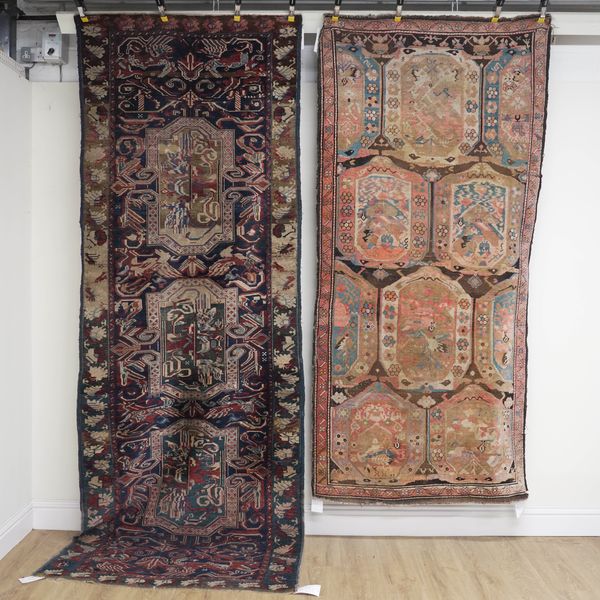 Circa 1920s, the dark indigo field with three bold medallions, each bearing stylised flowers surrounded by similar style flowers; a differing shaded border with leaves and vines. 320 x 114 cm, together with NW Persian rug - the brown field filled with four rows of bold medallions each bearing stylised floral motifs, "KA" at top; a minor madder border. 245 x 114cm, circa 1920s.