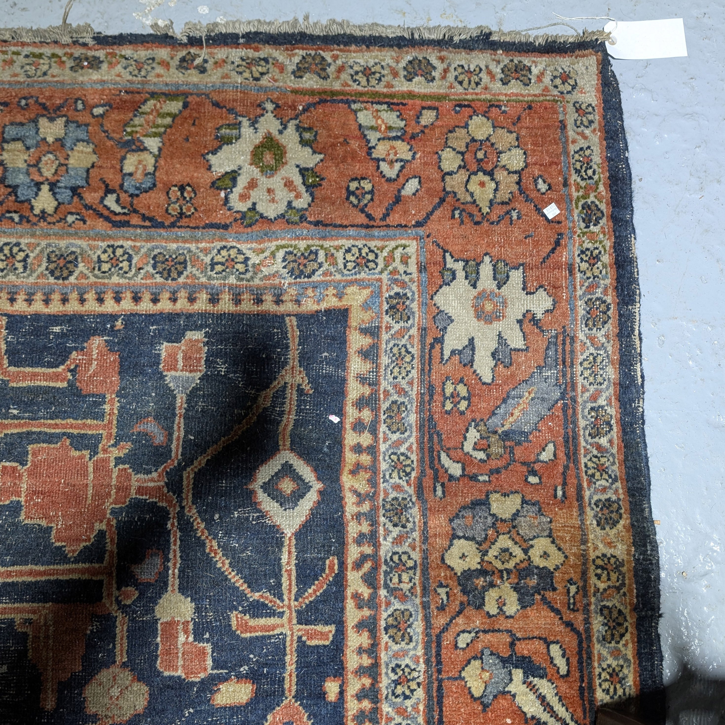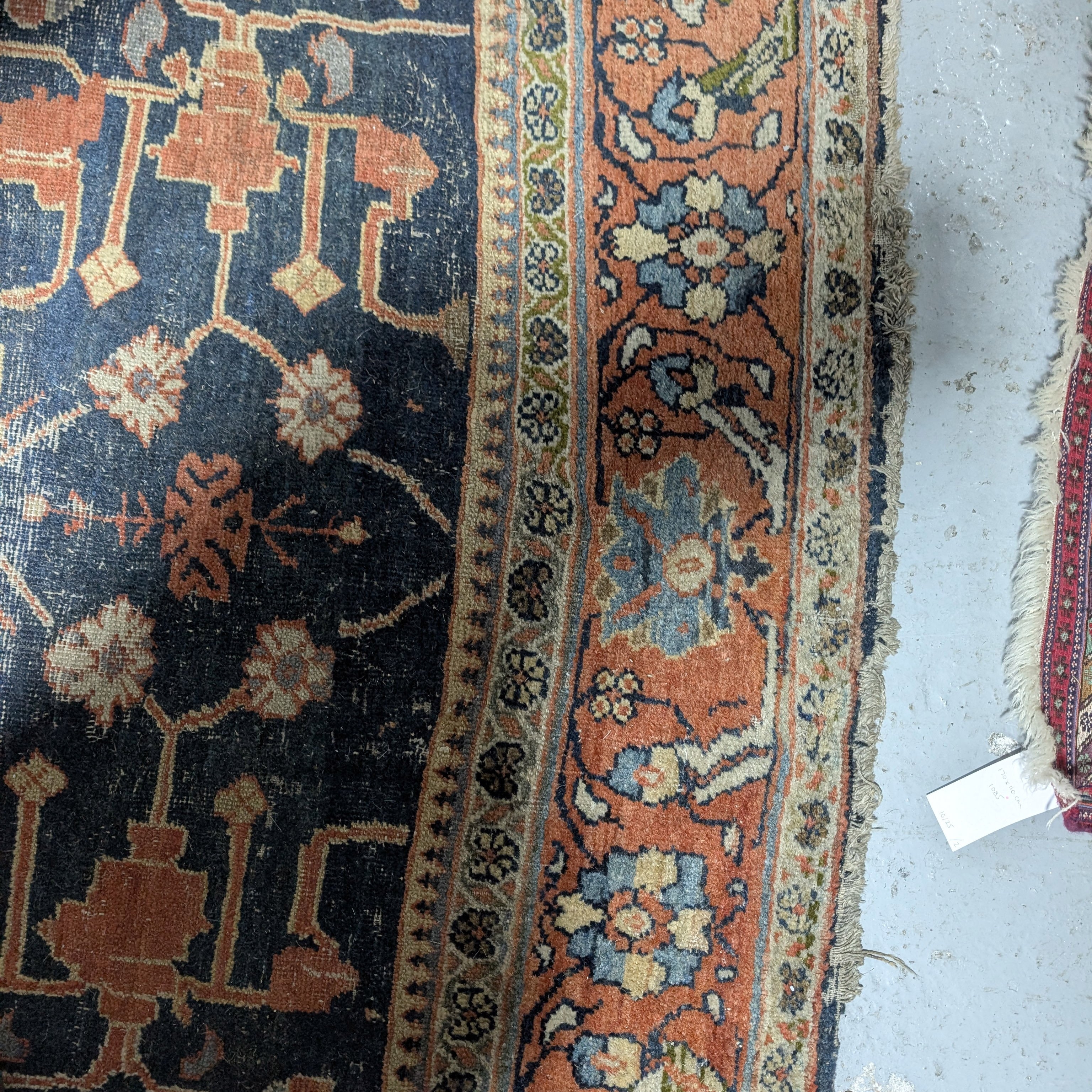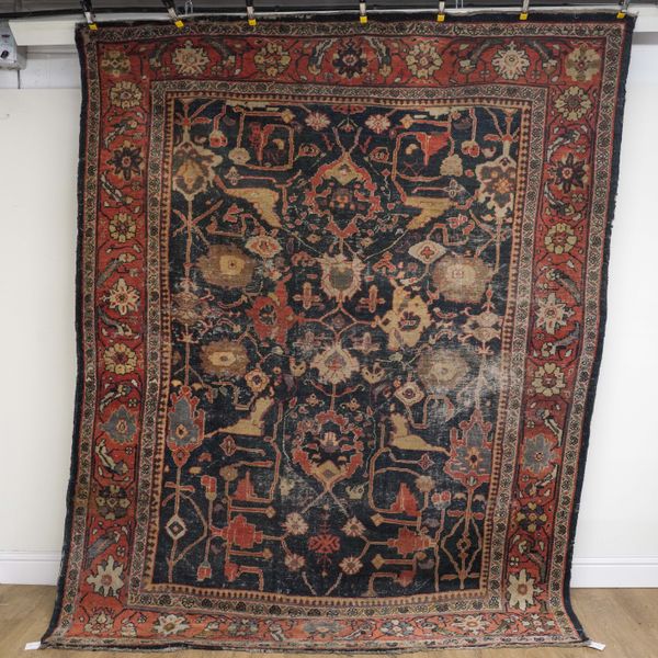 Circa 1880s, the dark indigo field with an all-over design of bold palmettes, rosettes and angular floral sprays; and a complementary madder border. 308 x 243 cm