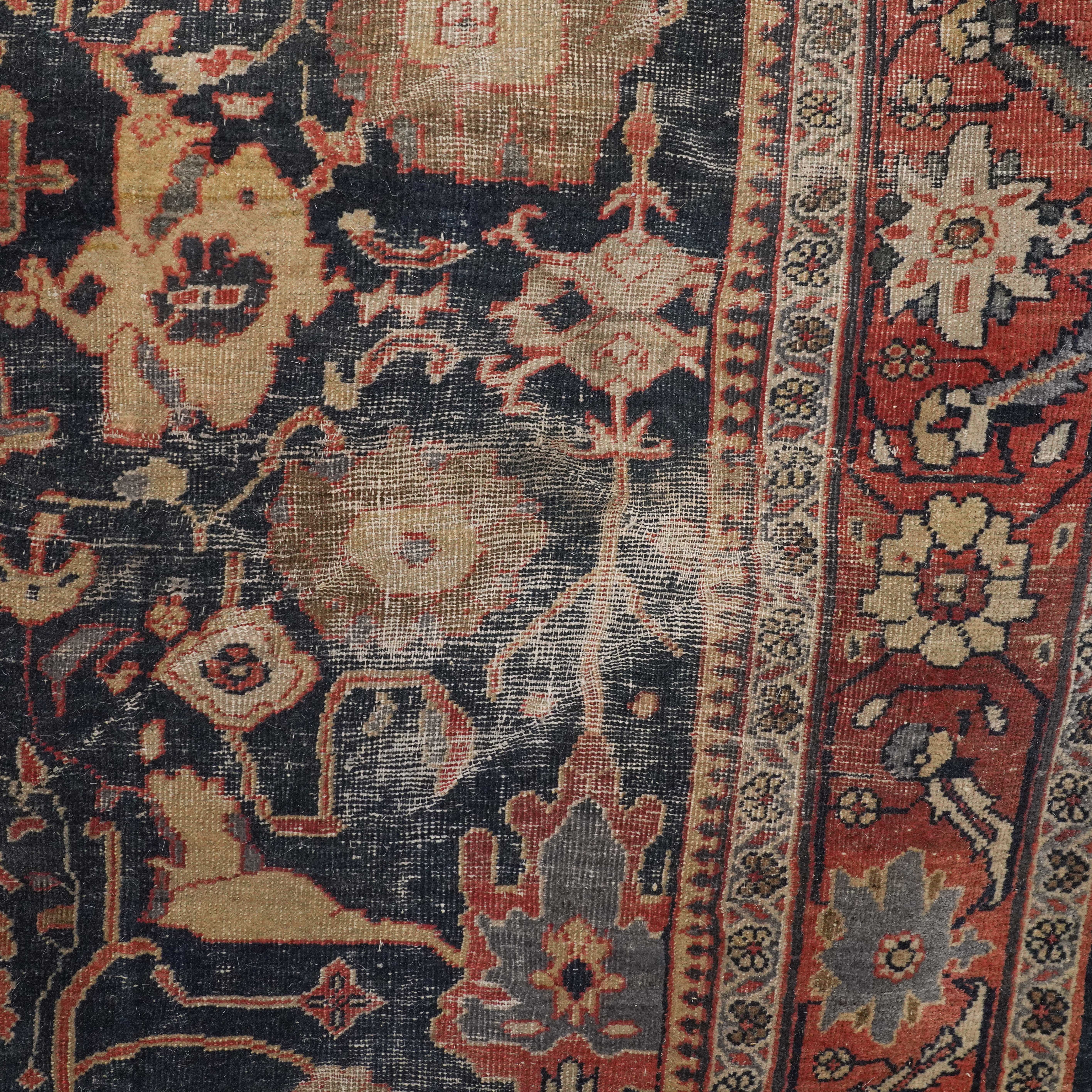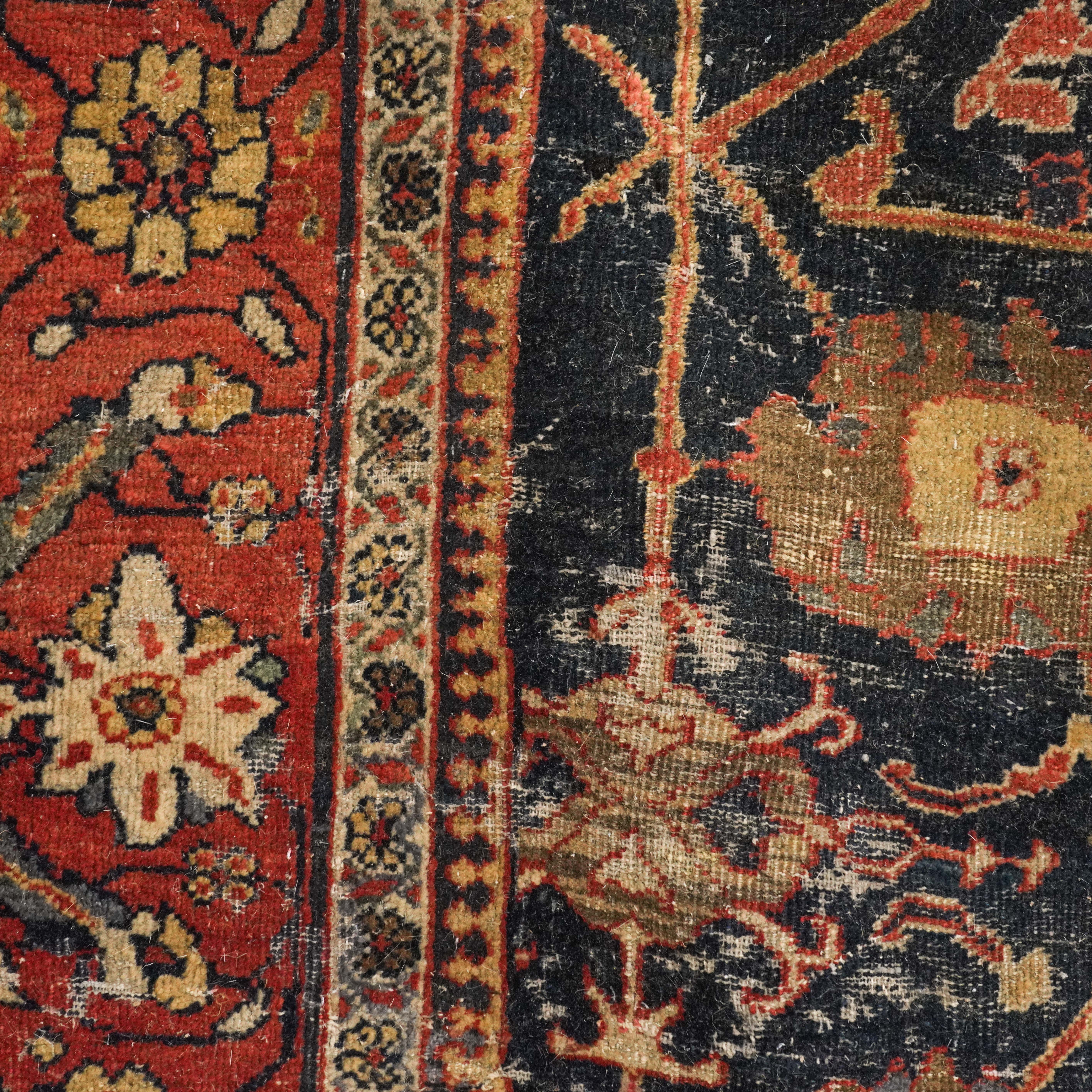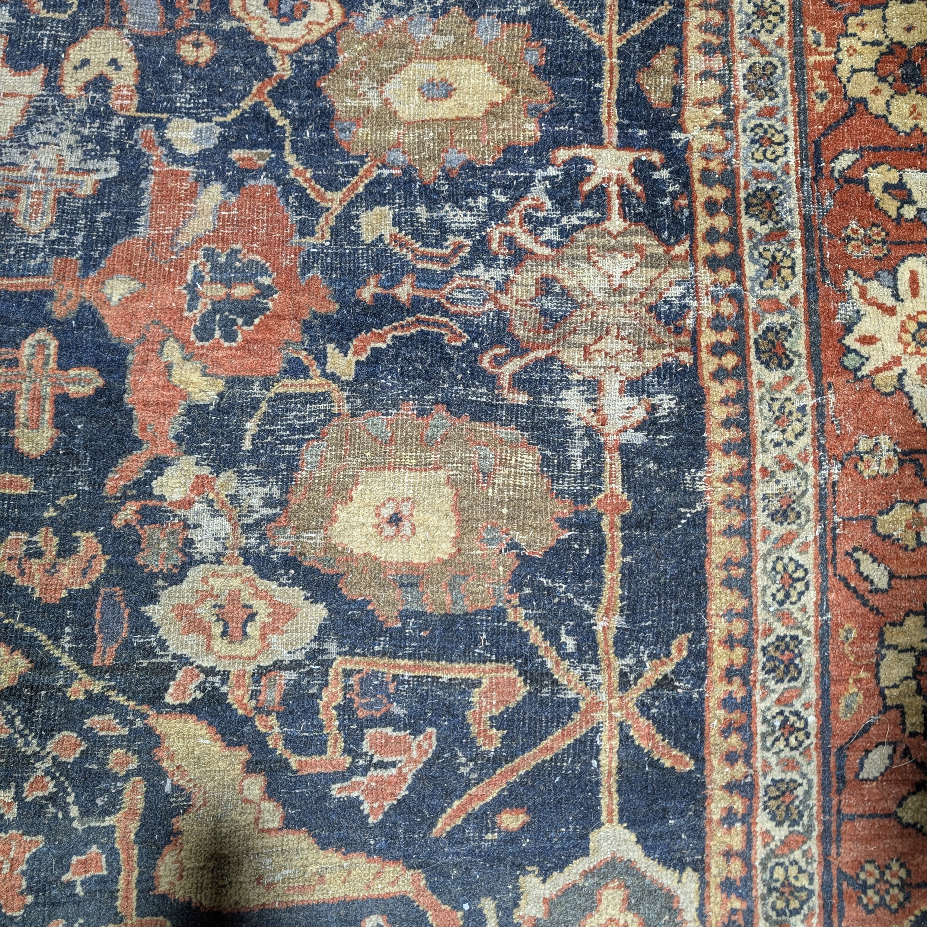 Circa 1880s, the dark indigo field with an all-over design of bold palmettes, rosettes and angular floral sprays; and a complementary madder border. 308 x 243 cm