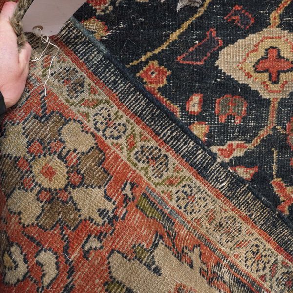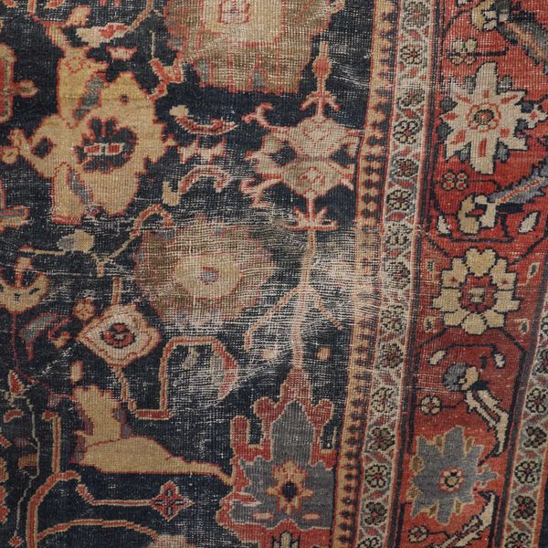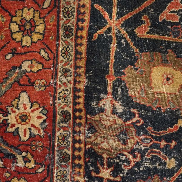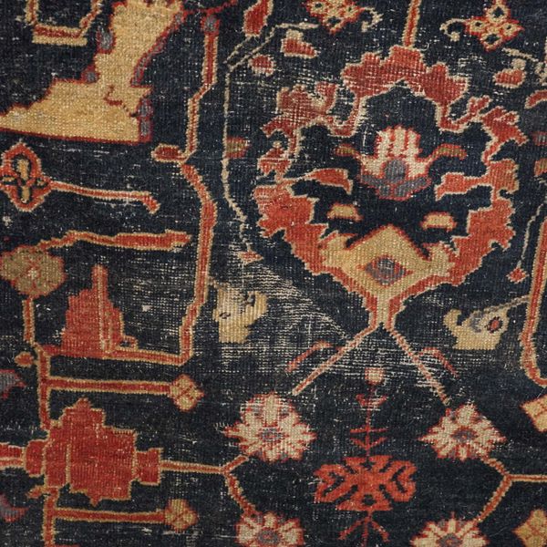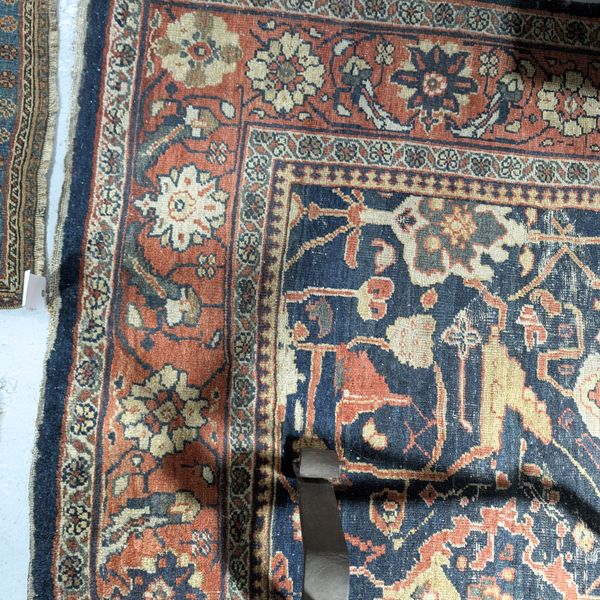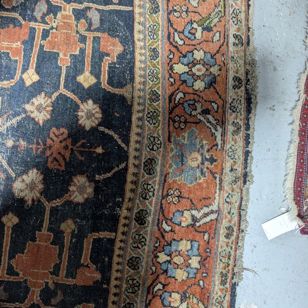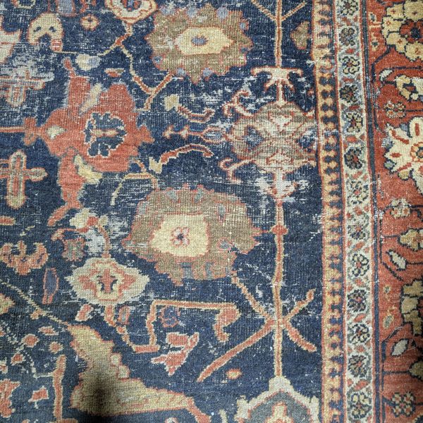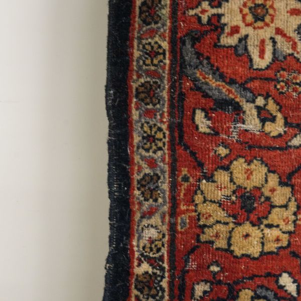 Condition is fair.  Some areas of wear to centre and areas of moth at ends - treated.  Needs a clean.  Overall worn, with numerous thread bare patches. One end is curled up and irregular along the edge, possibly due to some water damage or  other unexplained cause. Dirt, dust and residue dog hairs apparent. Fading commensurate with age and use.