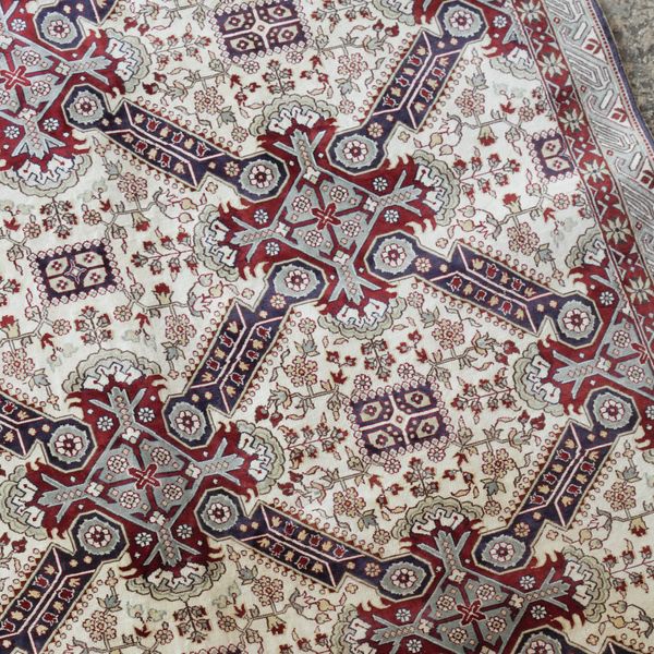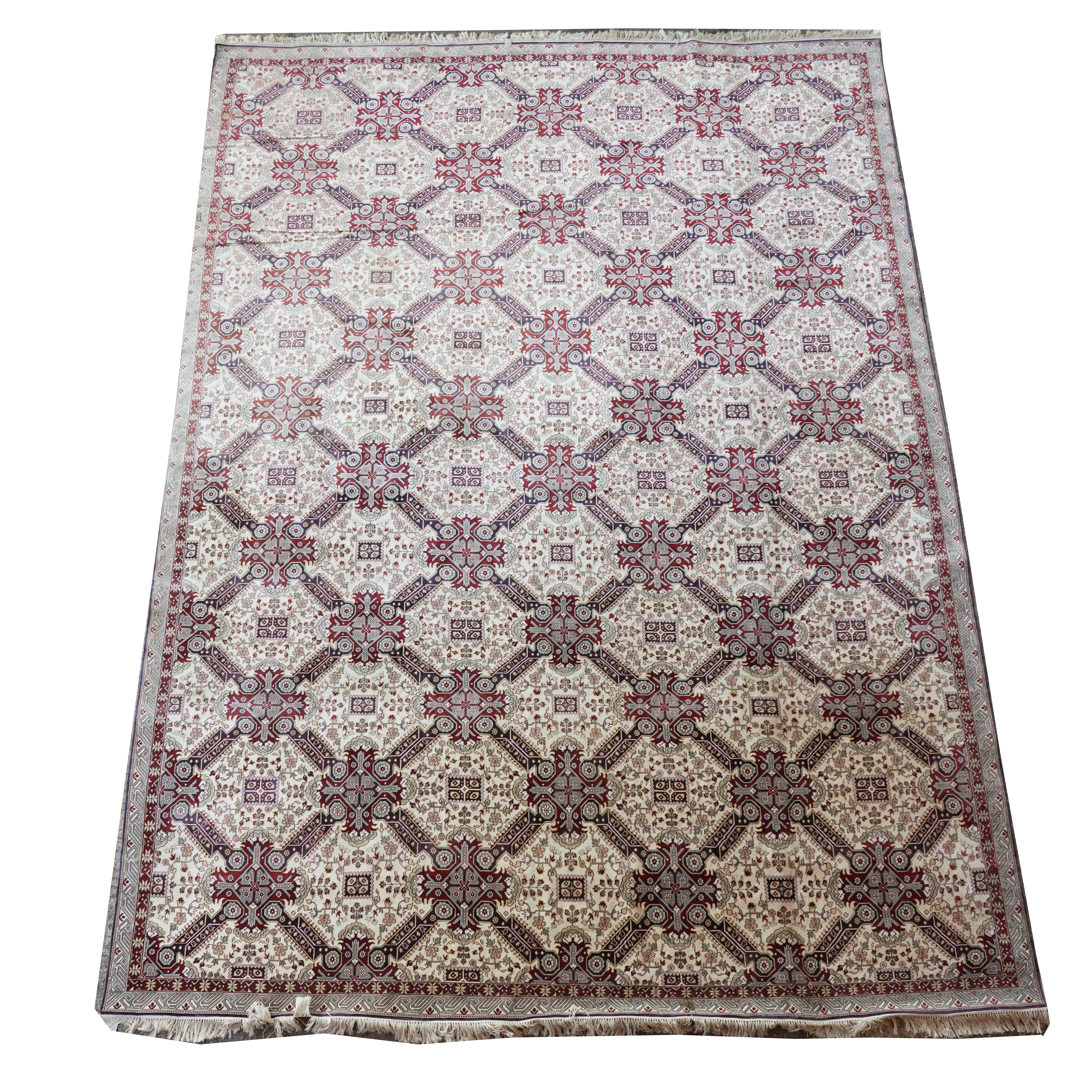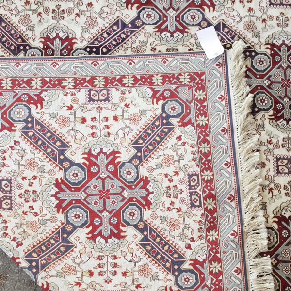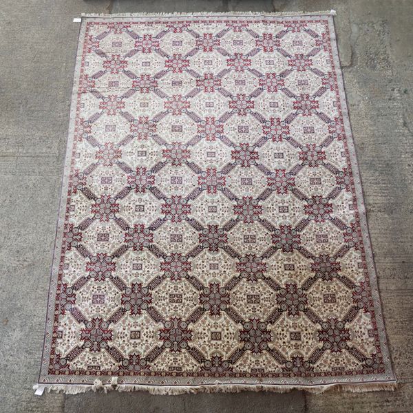 Modern, the ivory field with an indigo trellis with madder cross medallions, floral sprays; an ivory waved border. 418 x 304cm