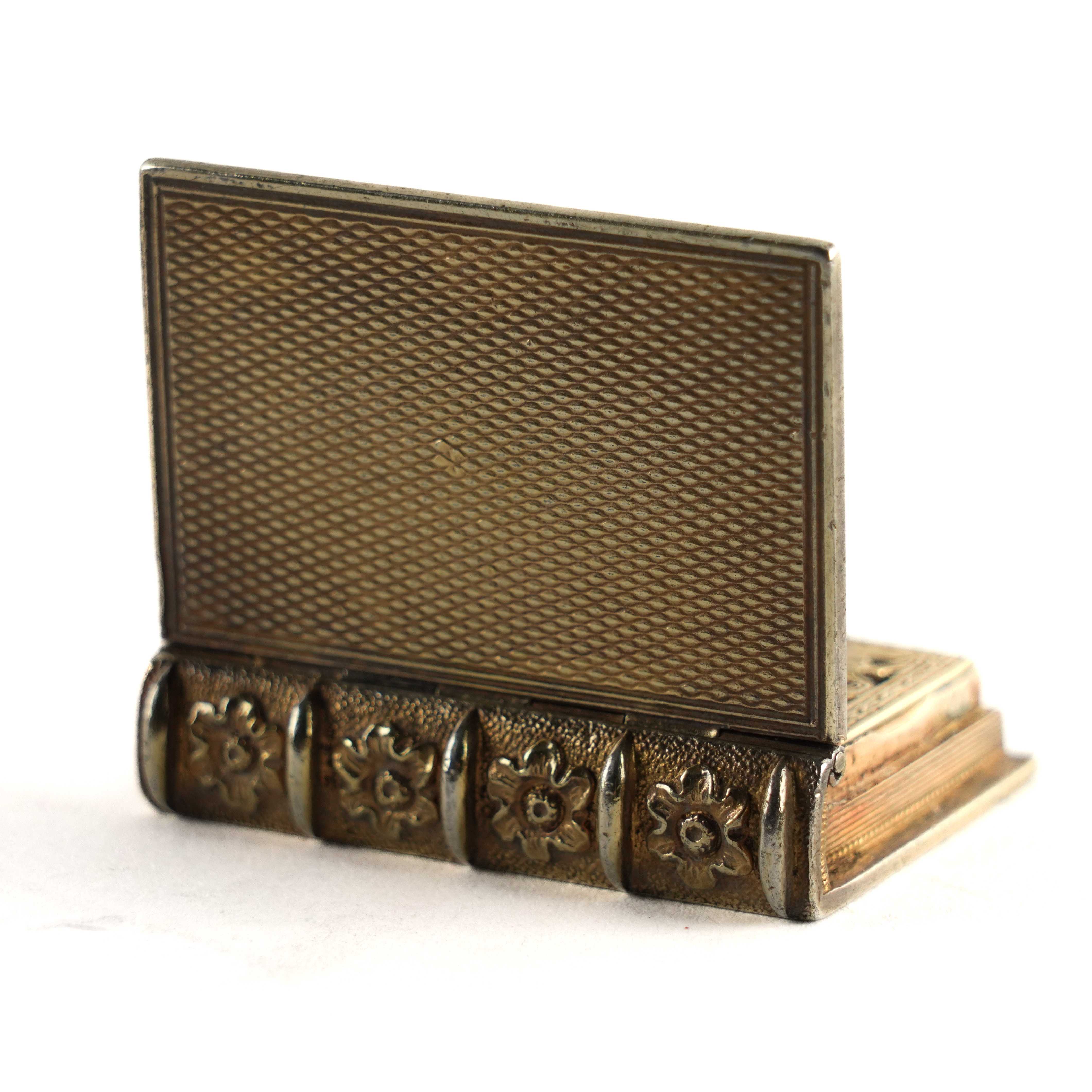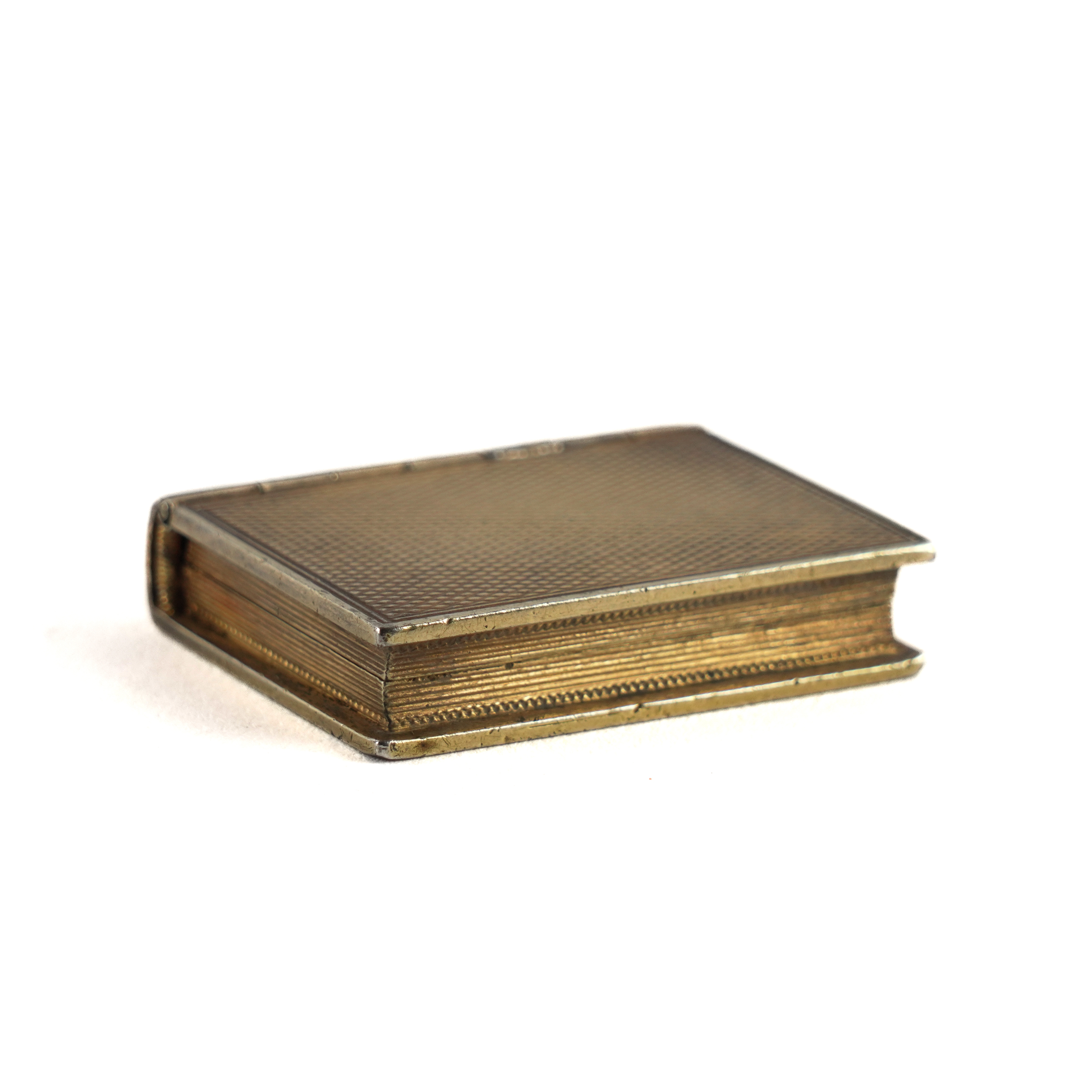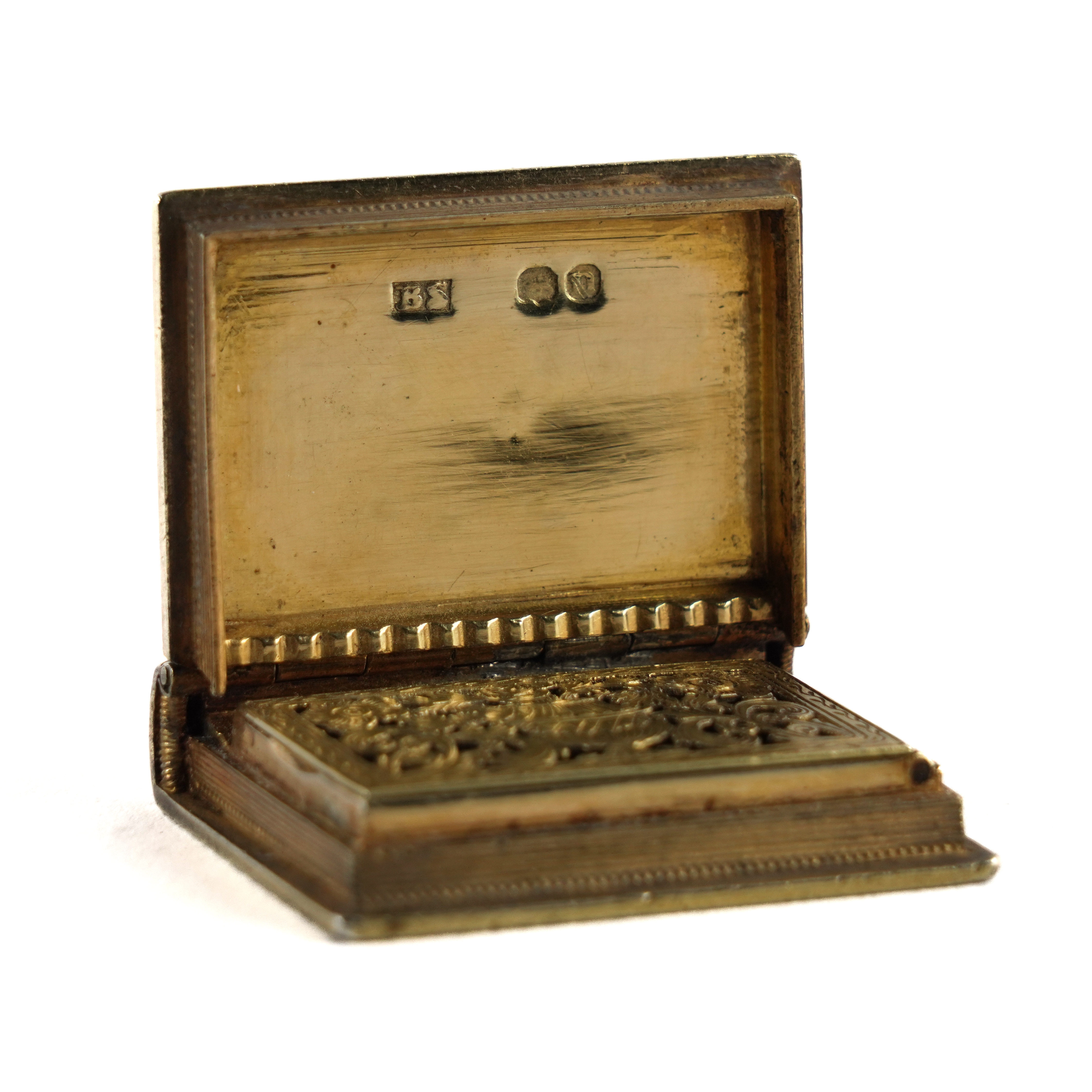 Designed as a book, with a floral, scroll and urn pierced and engraved grille, floral motifs to the spine of the book, otherwise engine turned, maker Benjamin Smith, London 1828, size 3.4cm x 2.7cm, weight 27 grams