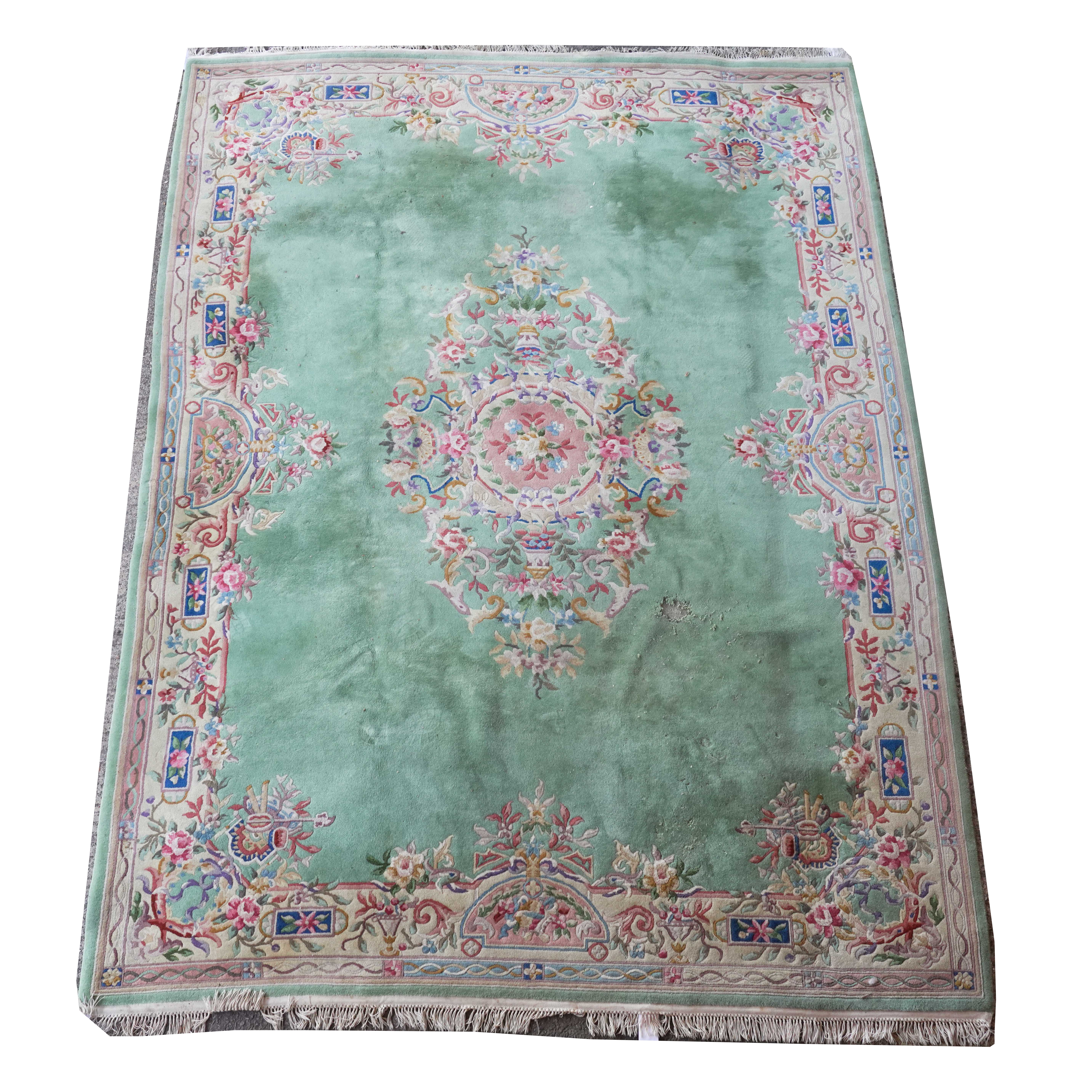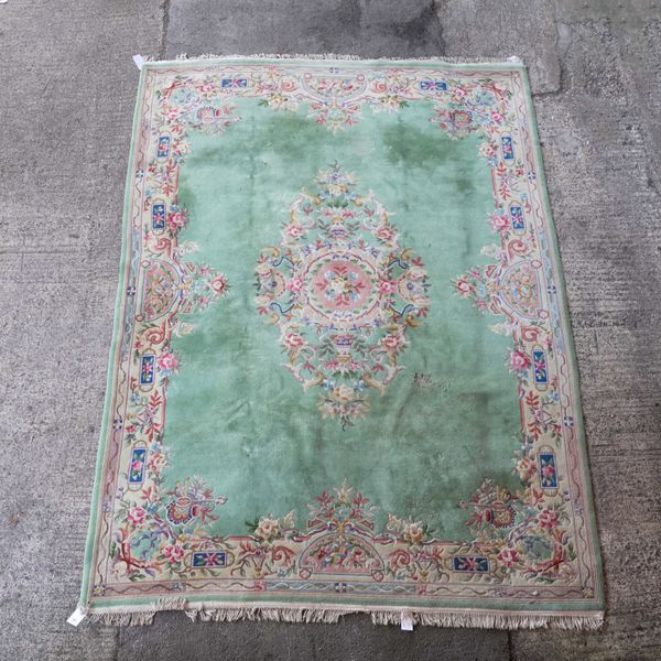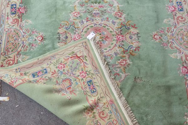 Modern, the plain sage field with a bold floral medallion and a shaped complementary border. 371 x 280cm.