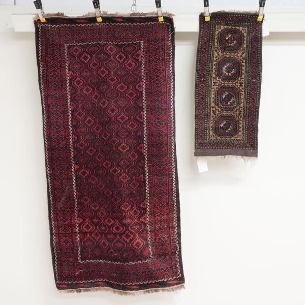 Late 19th Century, the field filled with a trellis of diagonal rows of single flowers; a madder border of single motifs, 173 x 91cm, a 20th century Beshir rug, the madder field with four columns of tulip flowers and flower centred diamonds; a madder flowerhead and bracket border, 210 x 162cm and a 1920s small Afghan Beluche mat, the camel field with four single medallions; a zigzag border, 91 x 41cm