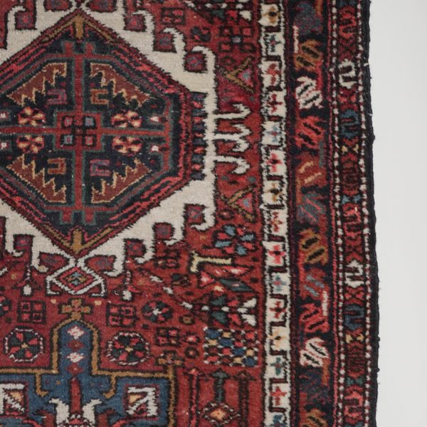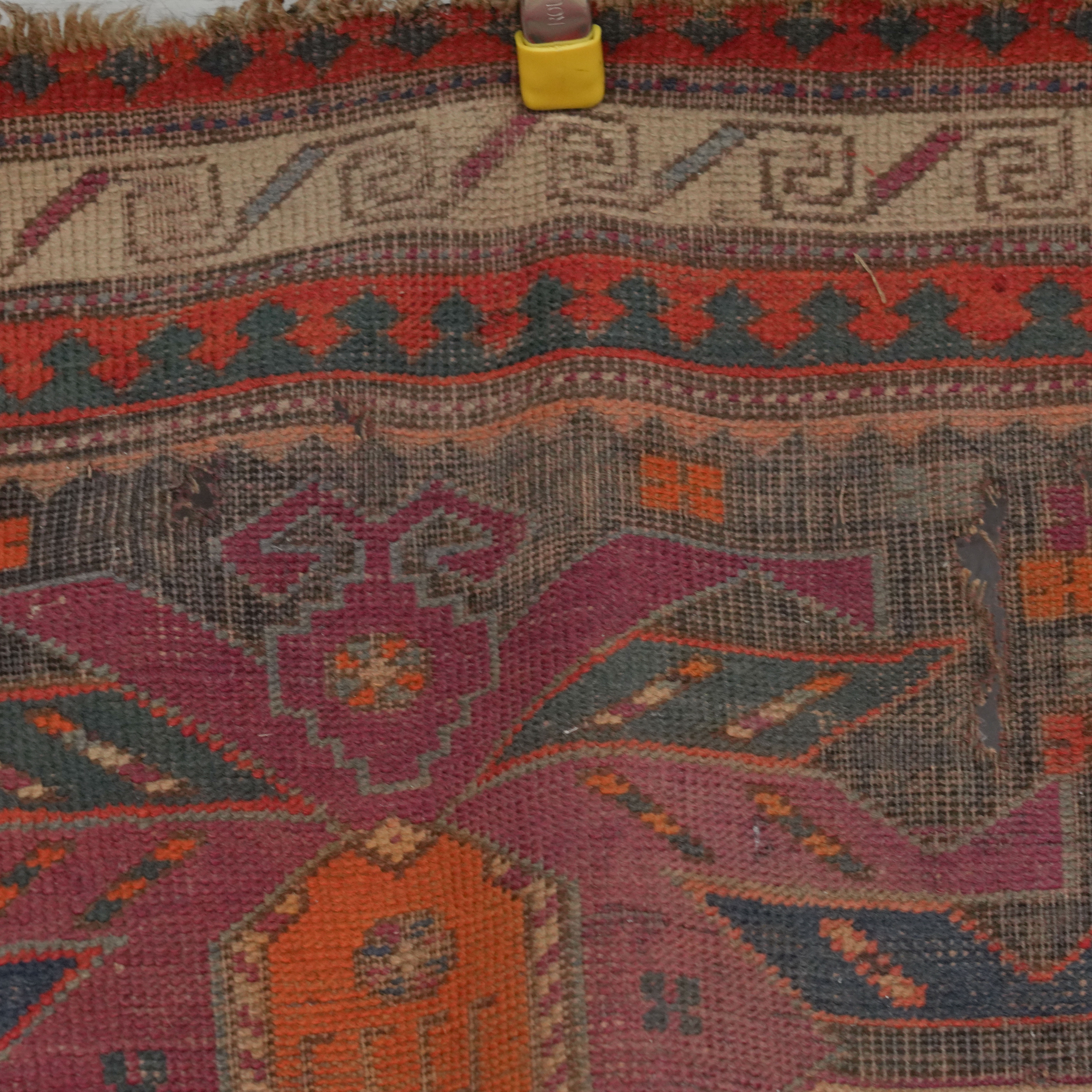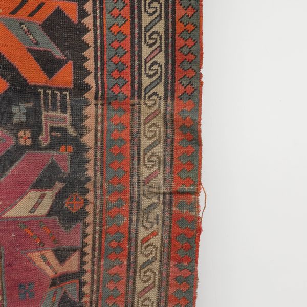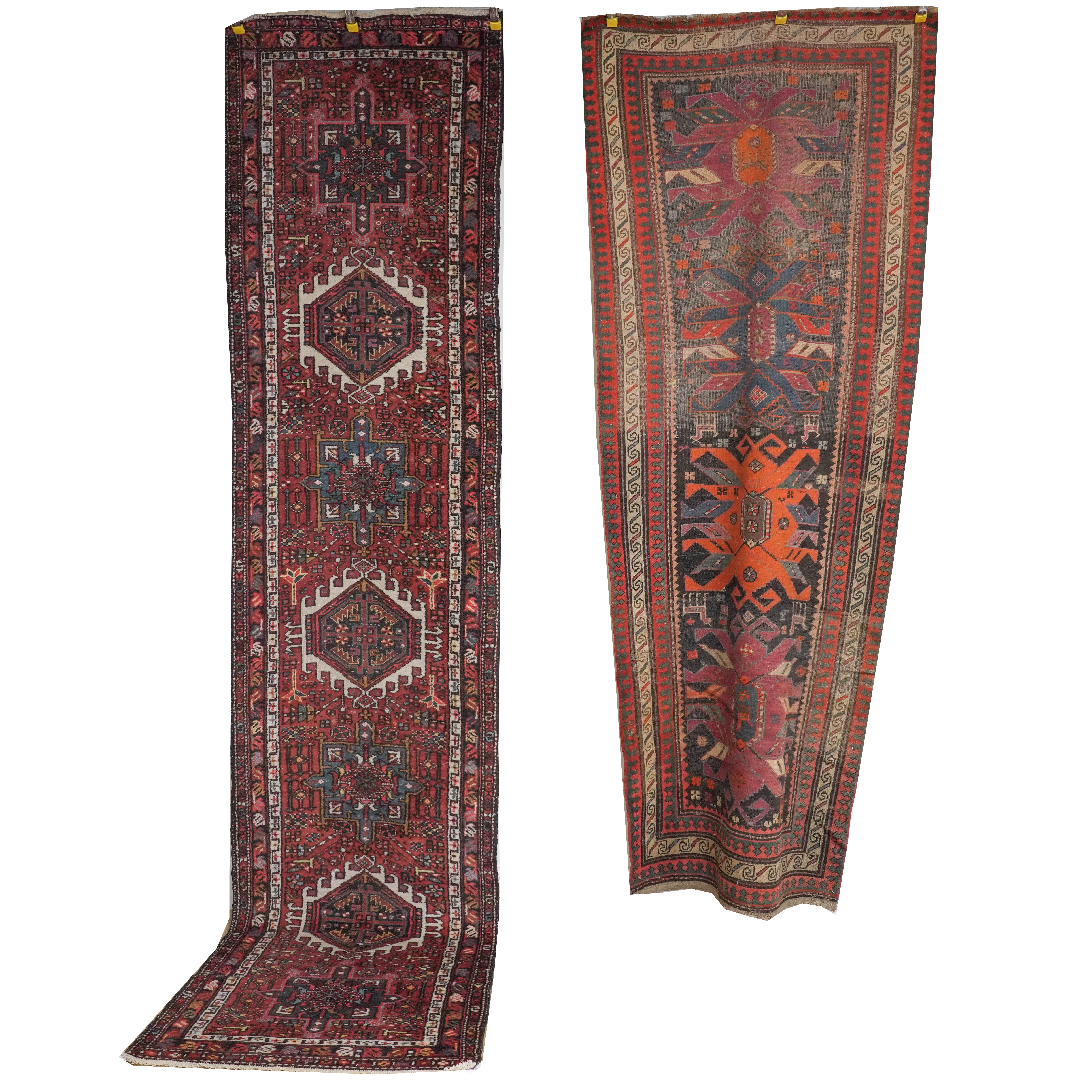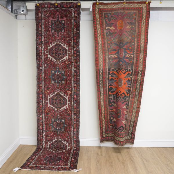 Circa 1950s, the madder field with seven medallions supported by minor stylised motifs; a black trailing flower border, 341 x 83cm, together with a Kazakh runner, circa 1900s, Caucasian, the black field with four stylised serrated medallions, pairs of sheep and minor motifs, 252 x 99cm