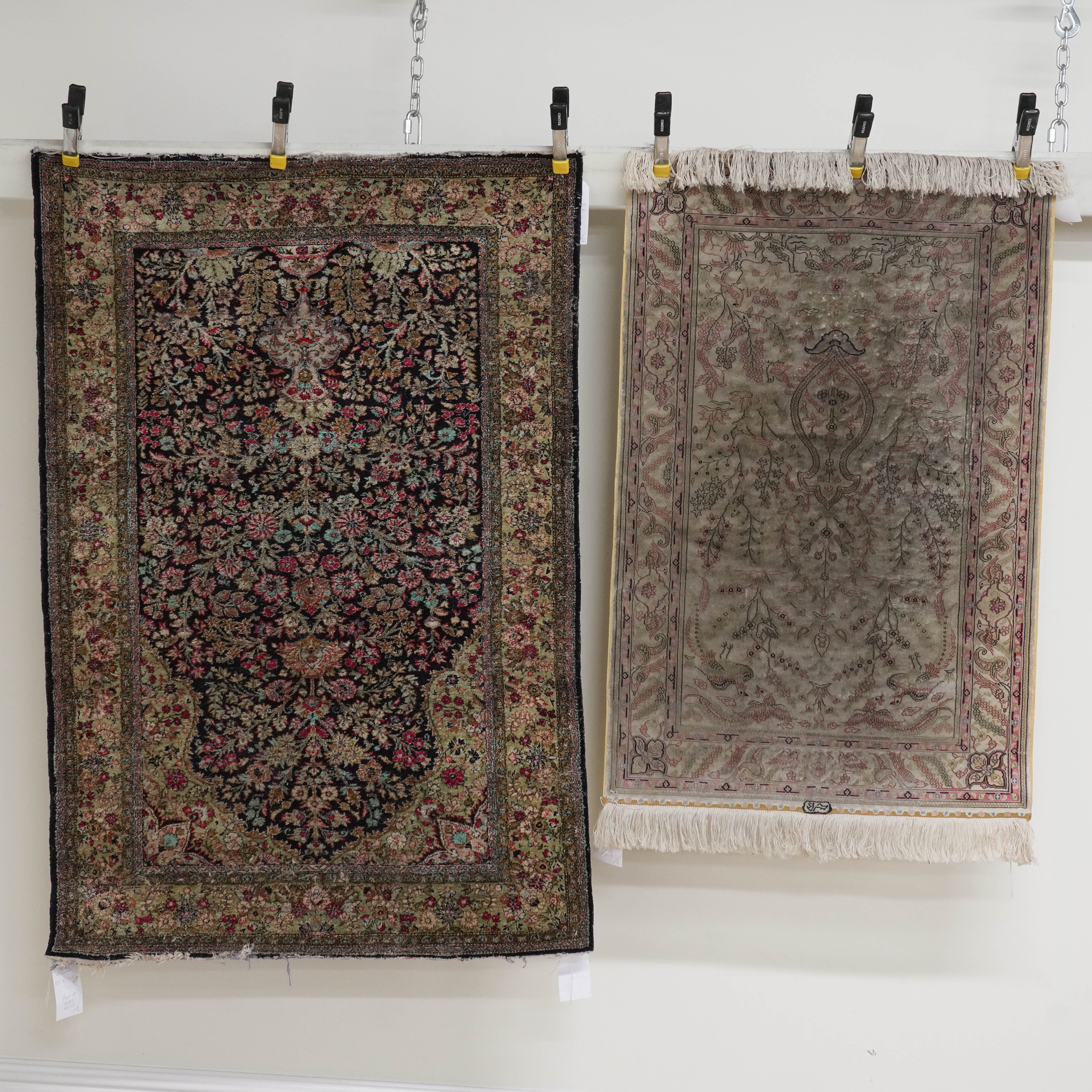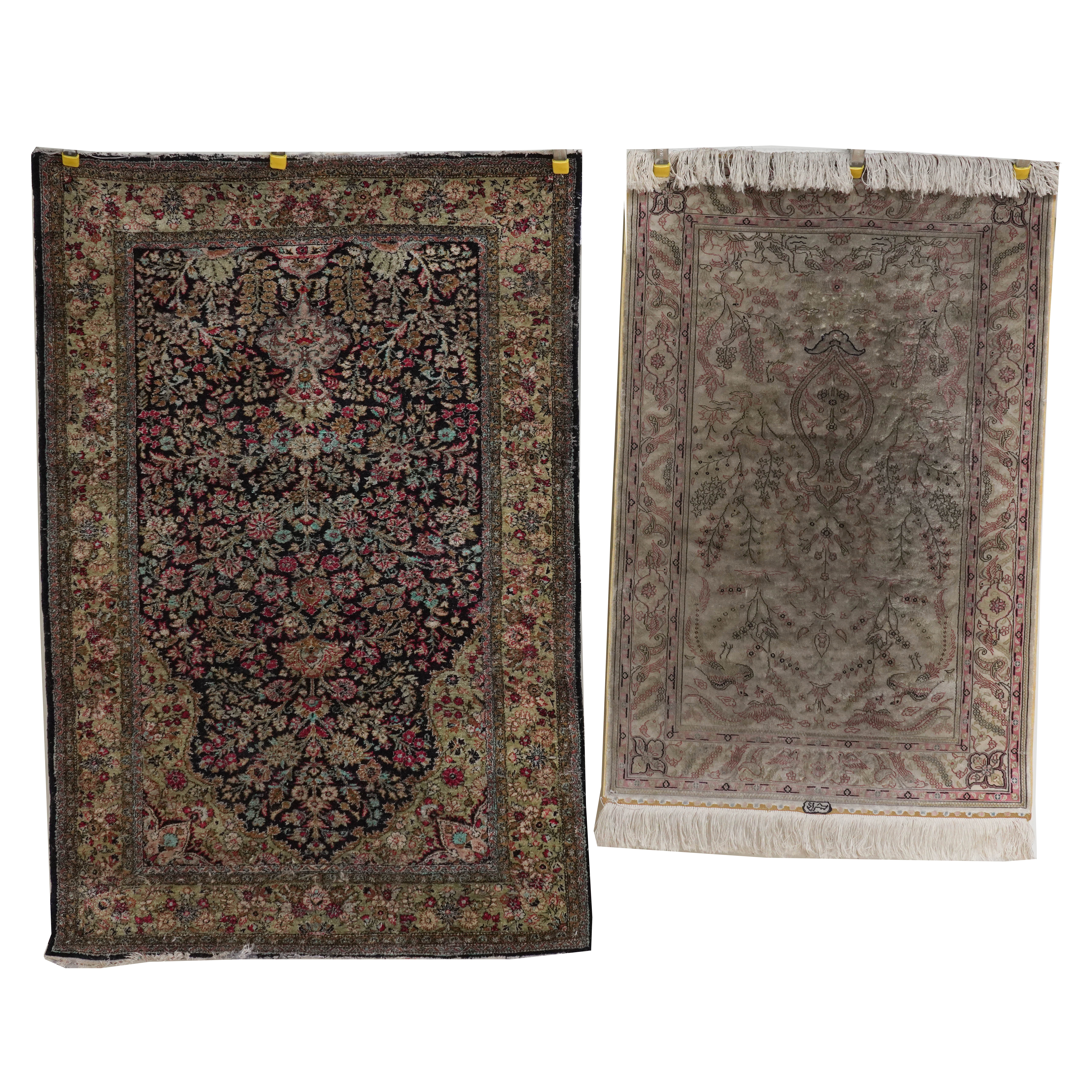 Late 20th century, the ivory field with a stylised vase supported by floral sprays, birds and animals; a complementary ivory border, inscription, 122 x 79cm, together with a silk Ghom prayer rug, Persian, the black mehrab with a vase filled with abundant floral sprays, a sage arch above; a sage floral border, 151 x 100cm, circa 1970s