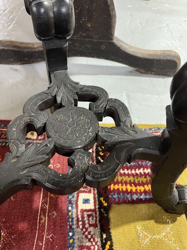 old marks and scratches present to both with scuffs and losses to the ebonised decoration, one table has a later ear fitted which is not ebonised, a loose section of the frieze and a break to the bottom stretcher, see images.