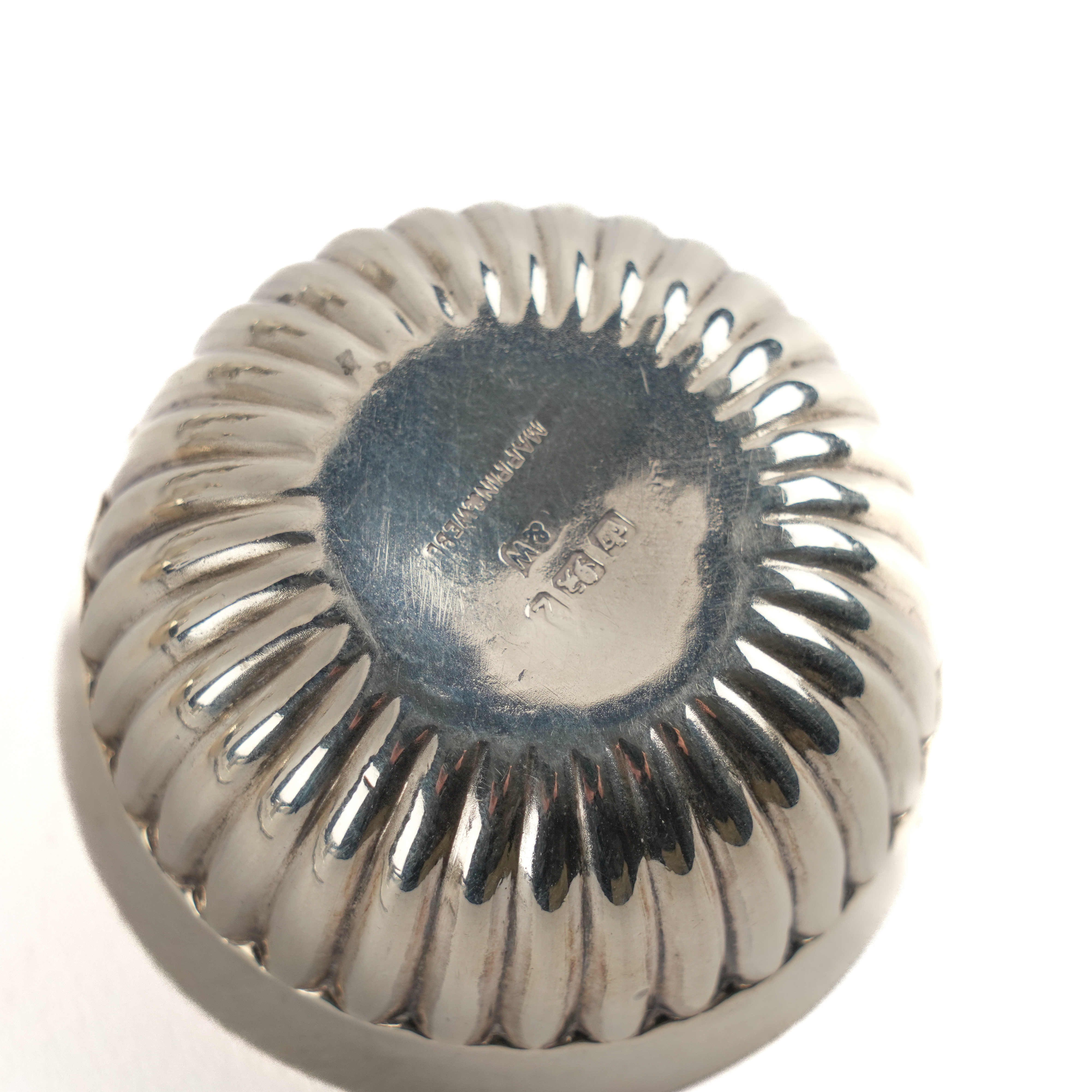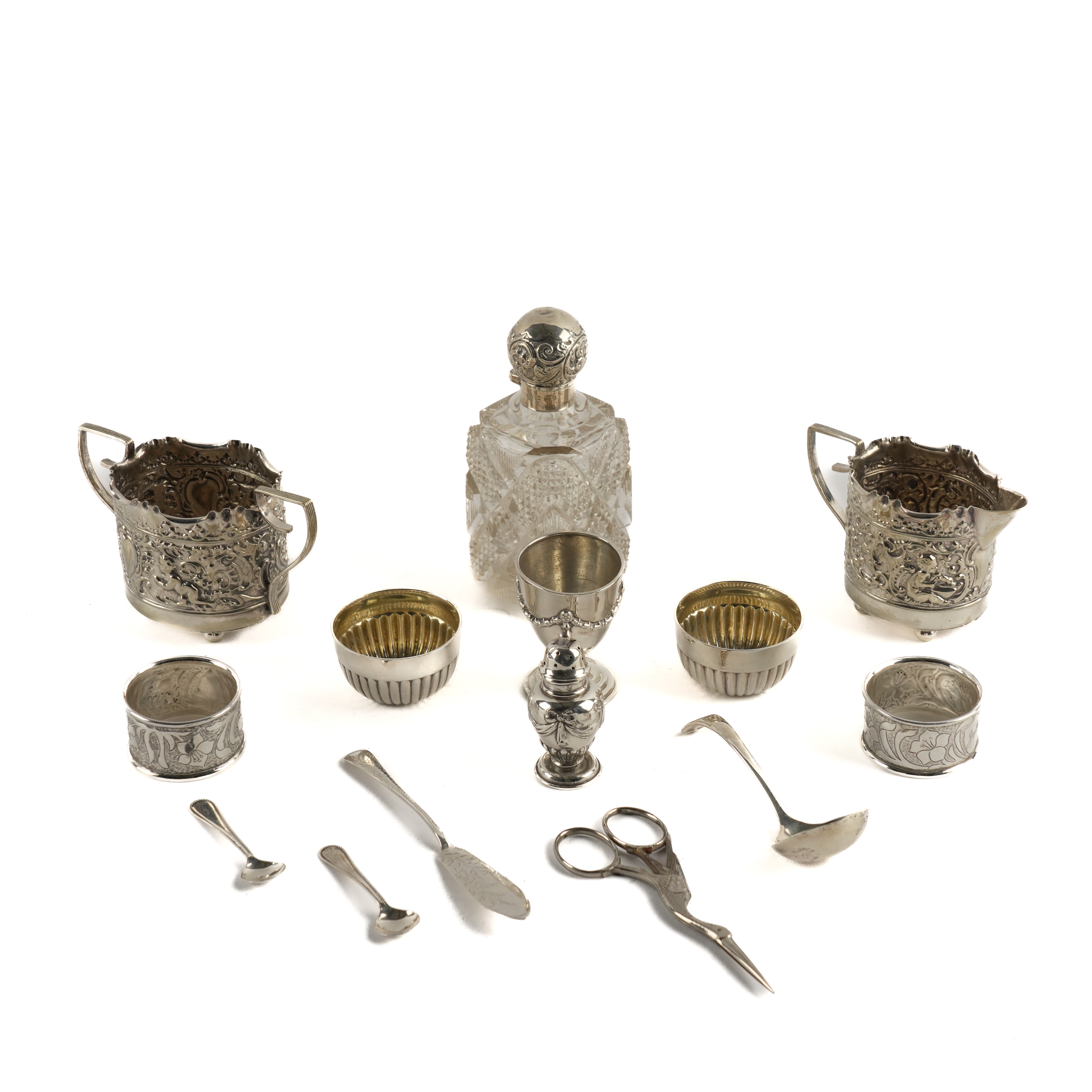 The silver comprising; a pair of salts, Sheffield 1892, a pair of salt spoons, Birmingham 1920, an egg cup, a pepperette, a cream ladle and a butter knife, combined weight 157 grams and also a Victorian faceted glass scent bottle, Birmingham probably 1898, height 13cm, also plated and metal wares, comprising, a milk jug with matching sugar bowl, a pair of napkin rings and a pair or scissors, designed as a stork