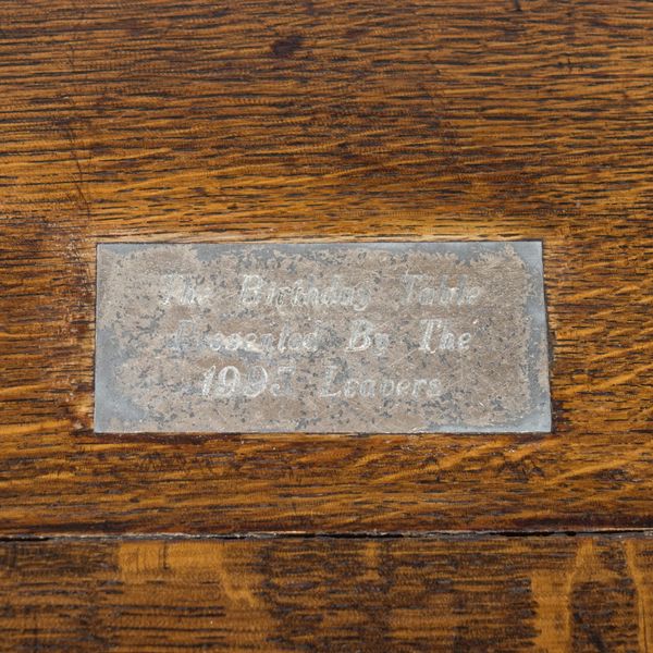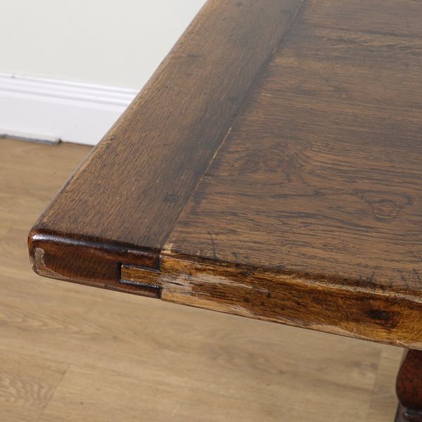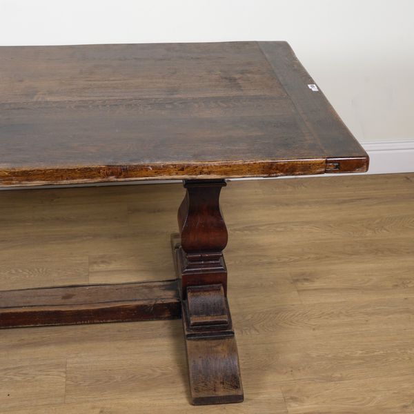20th century, the cleated plank top on square baluster supports united by stretcher, 91cm wide; 214cm long; 76cm high