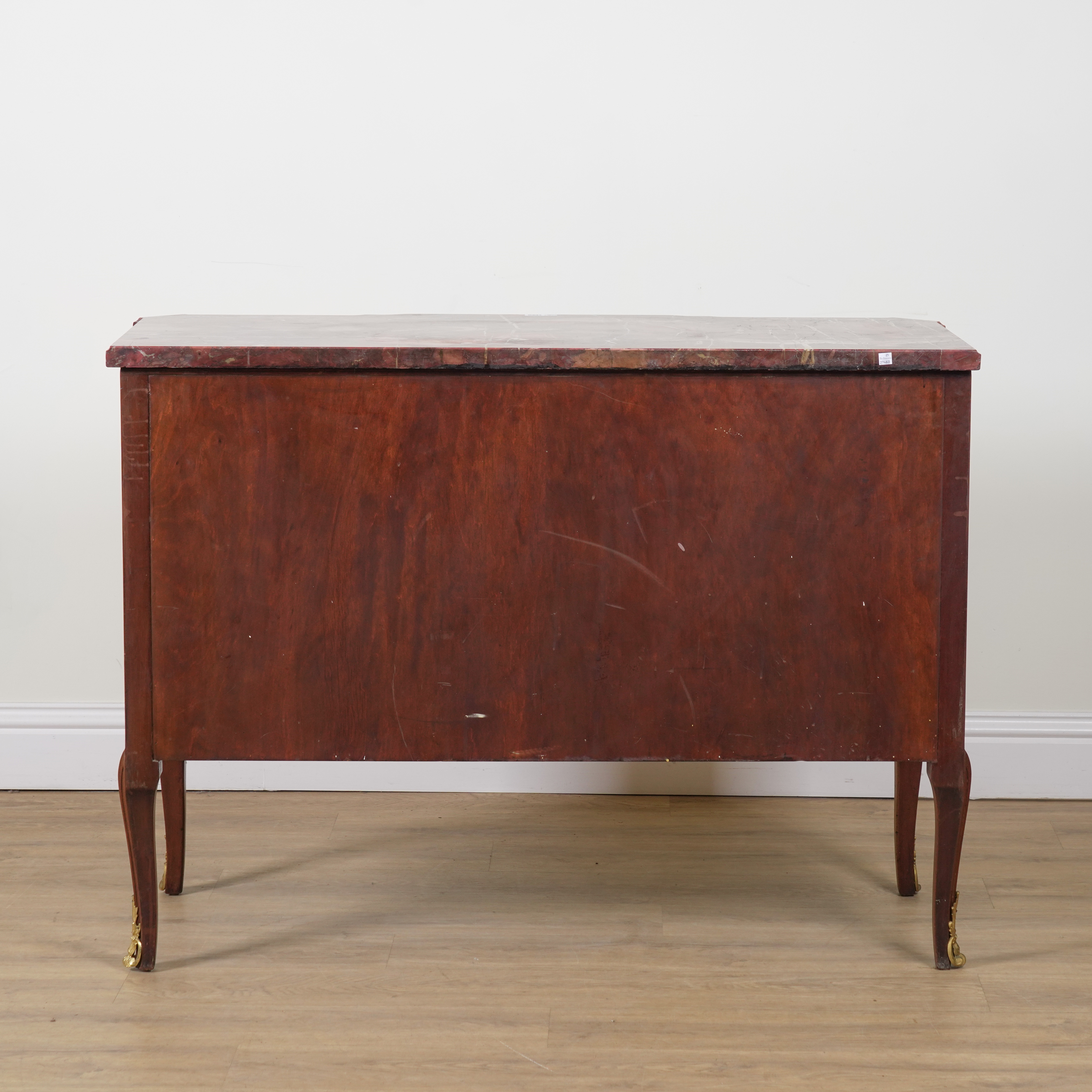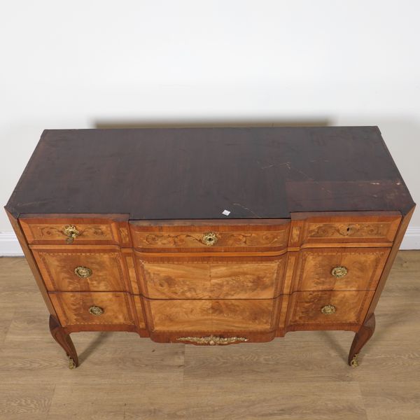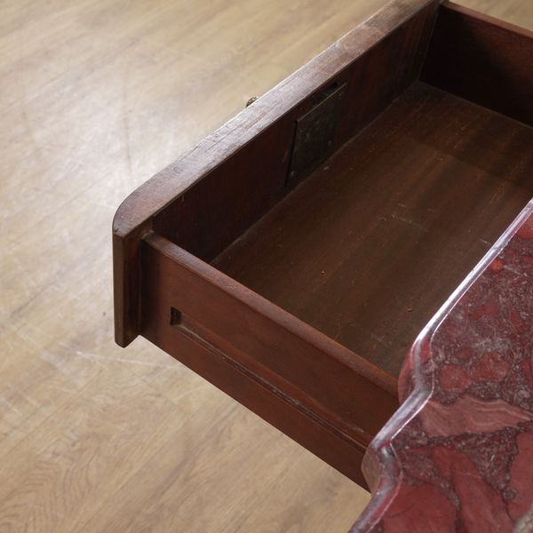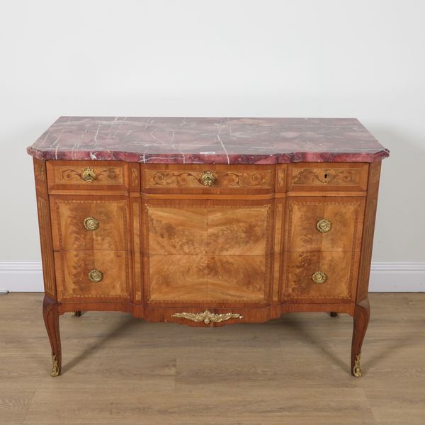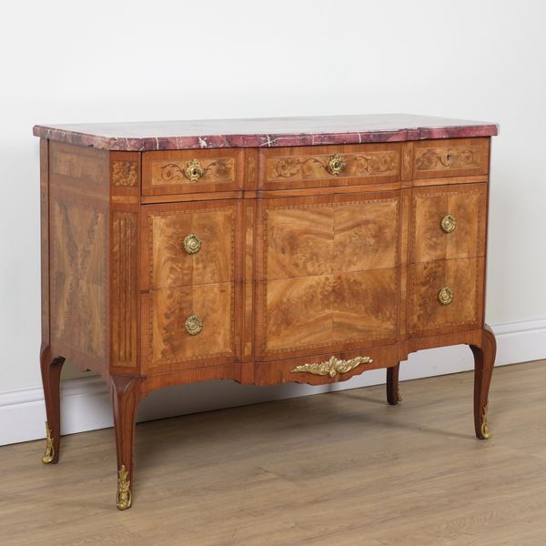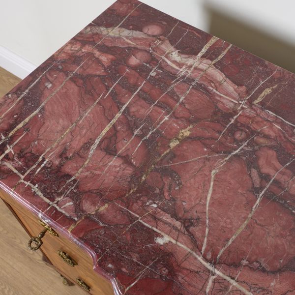 20th century, the rouge marble top over a gilt metal mounted marquetry inlaid walnut three drawer base, 123cm wide; 55cm deep; 91cm high
