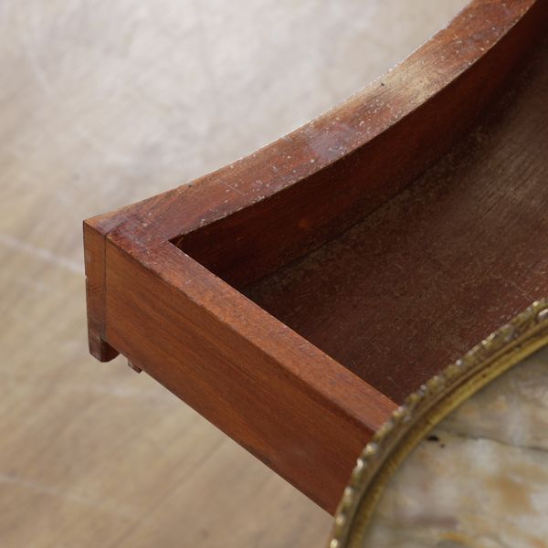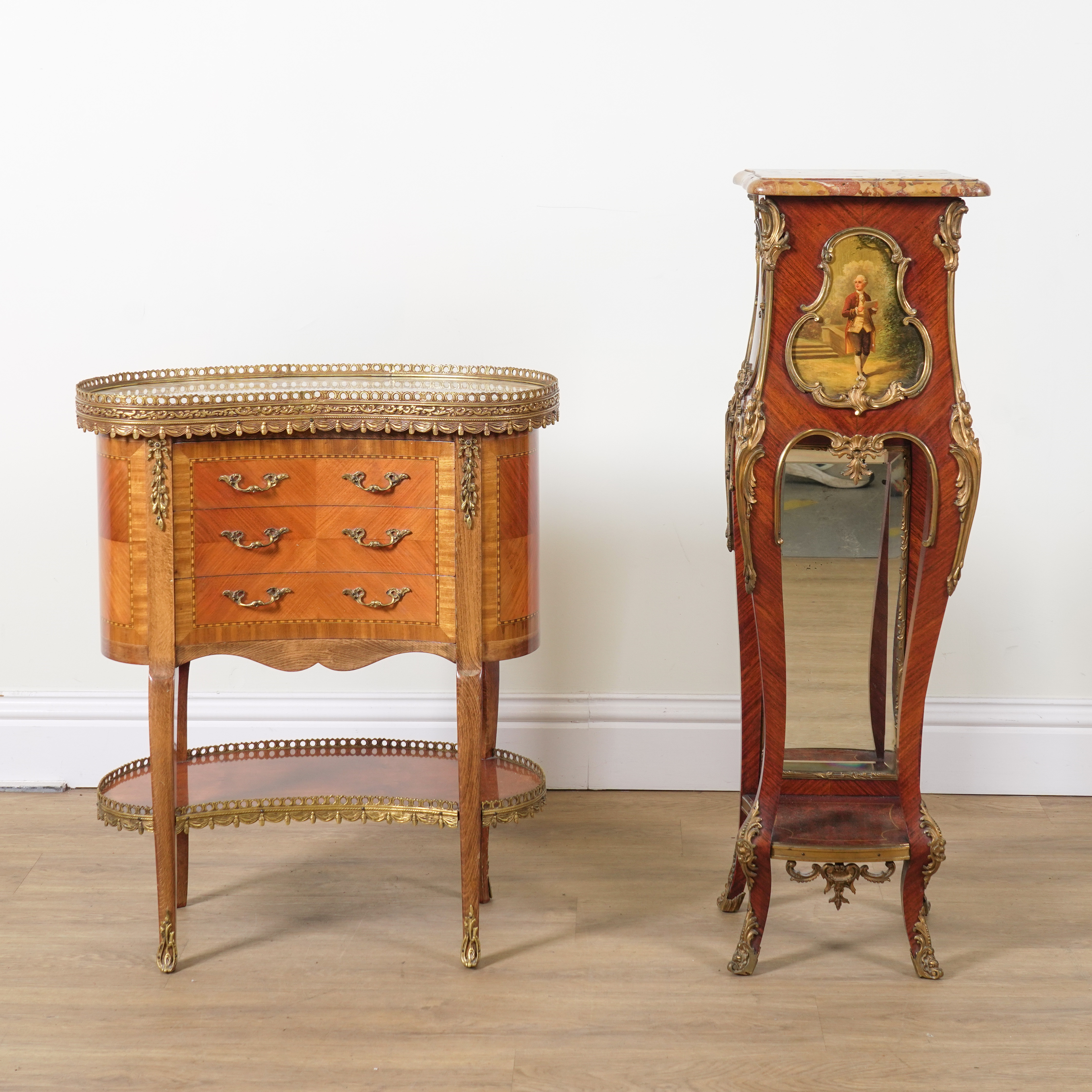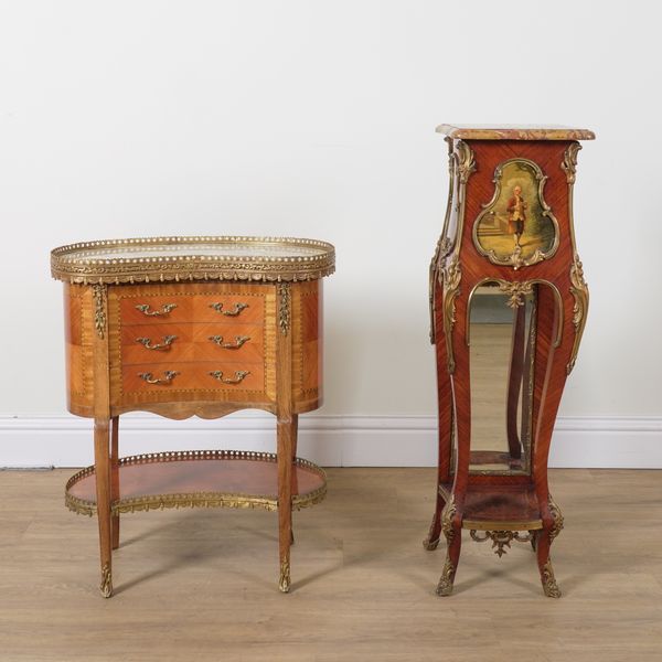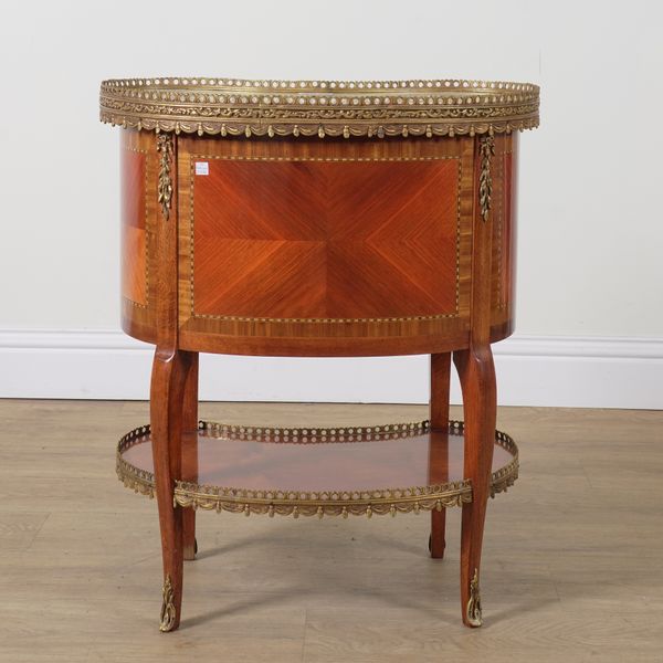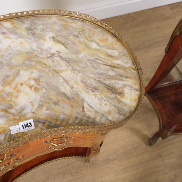 A LOUIS XV STYLE MARBLE TOPPED KIDNEY SHAPED GILT METAL MOUNTED KINGWOOD THREE DRAWER OCCASIONAL TABLE (2)