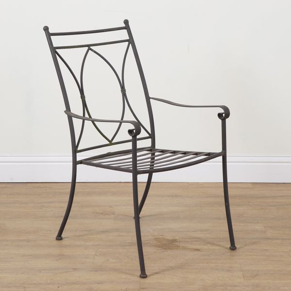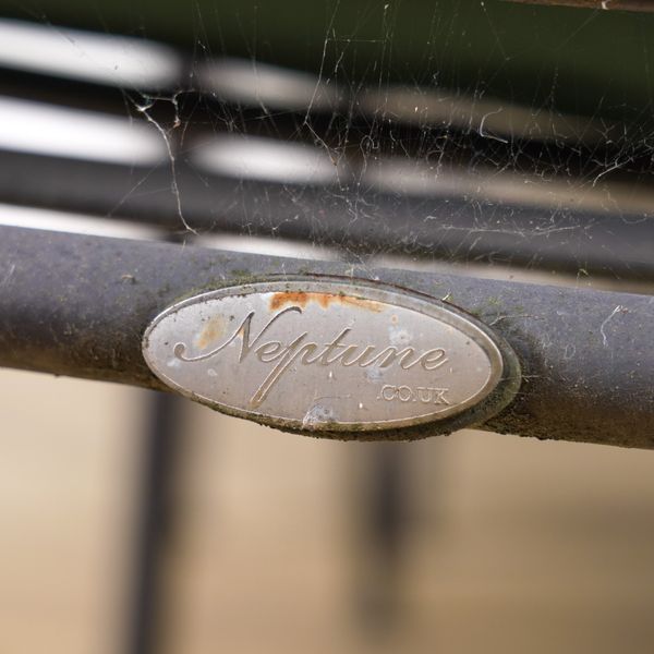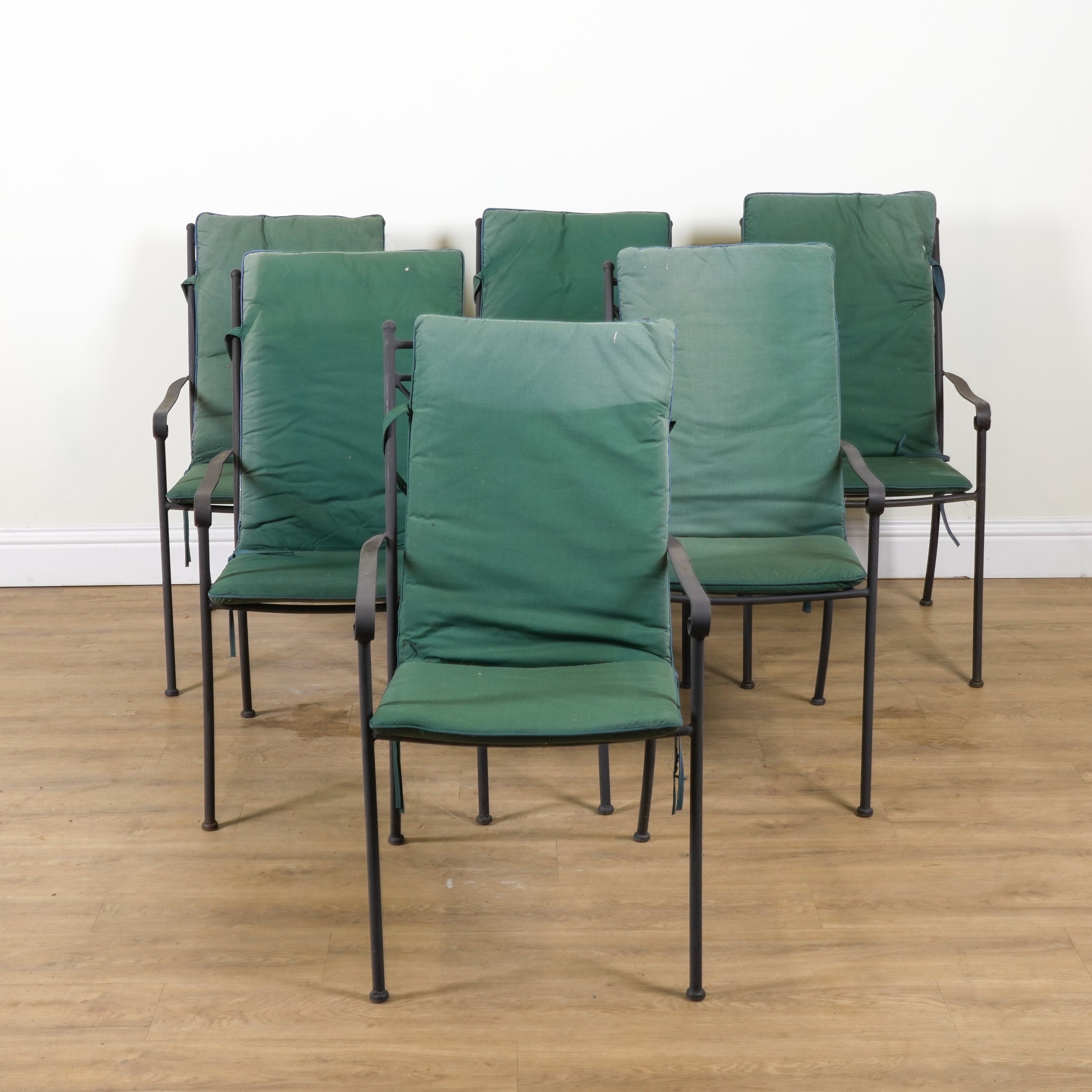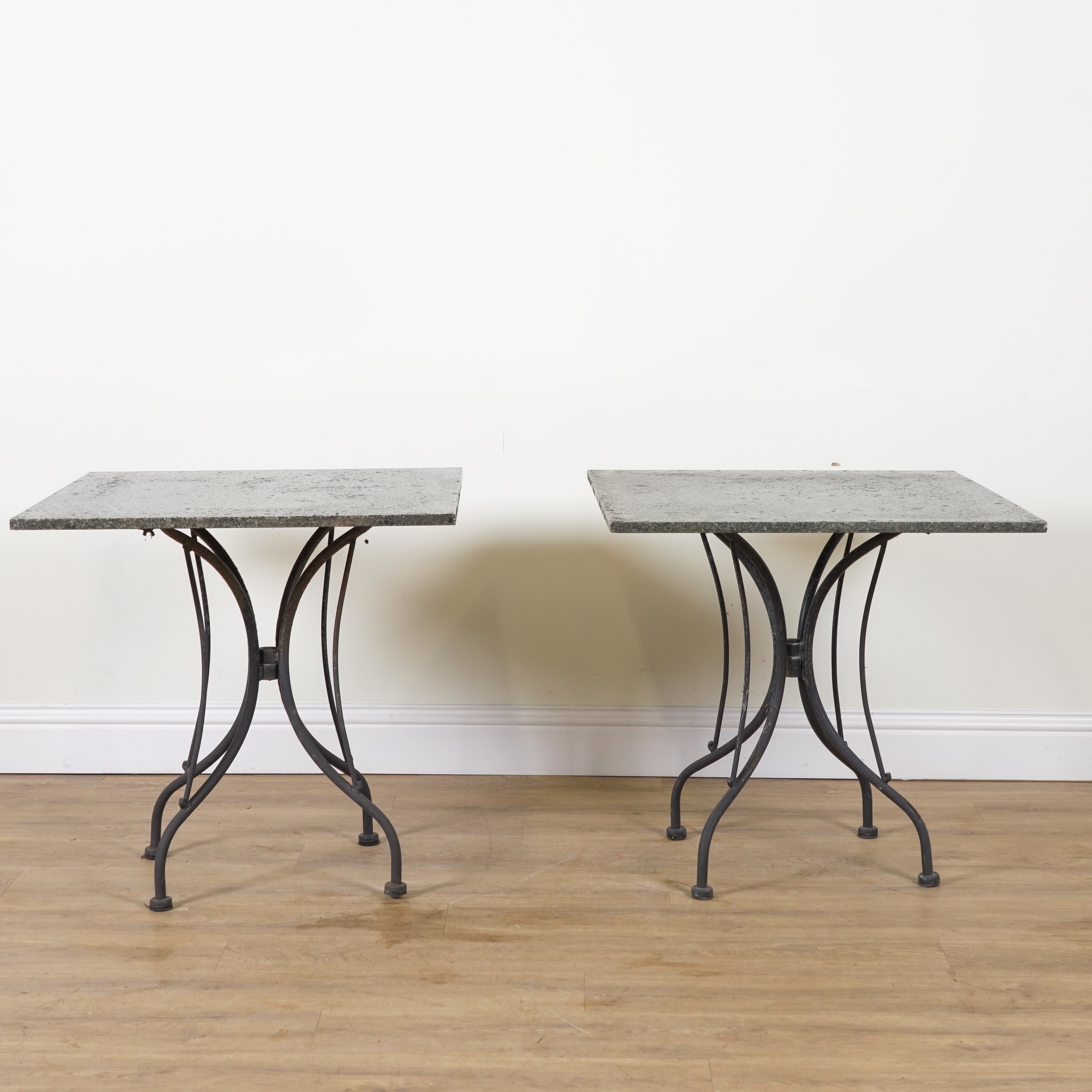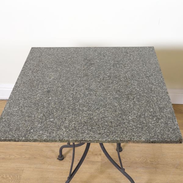 55cm wide; 98cm high, and two marble topped square tables on black metal bases, 75cm wide; 72cm high