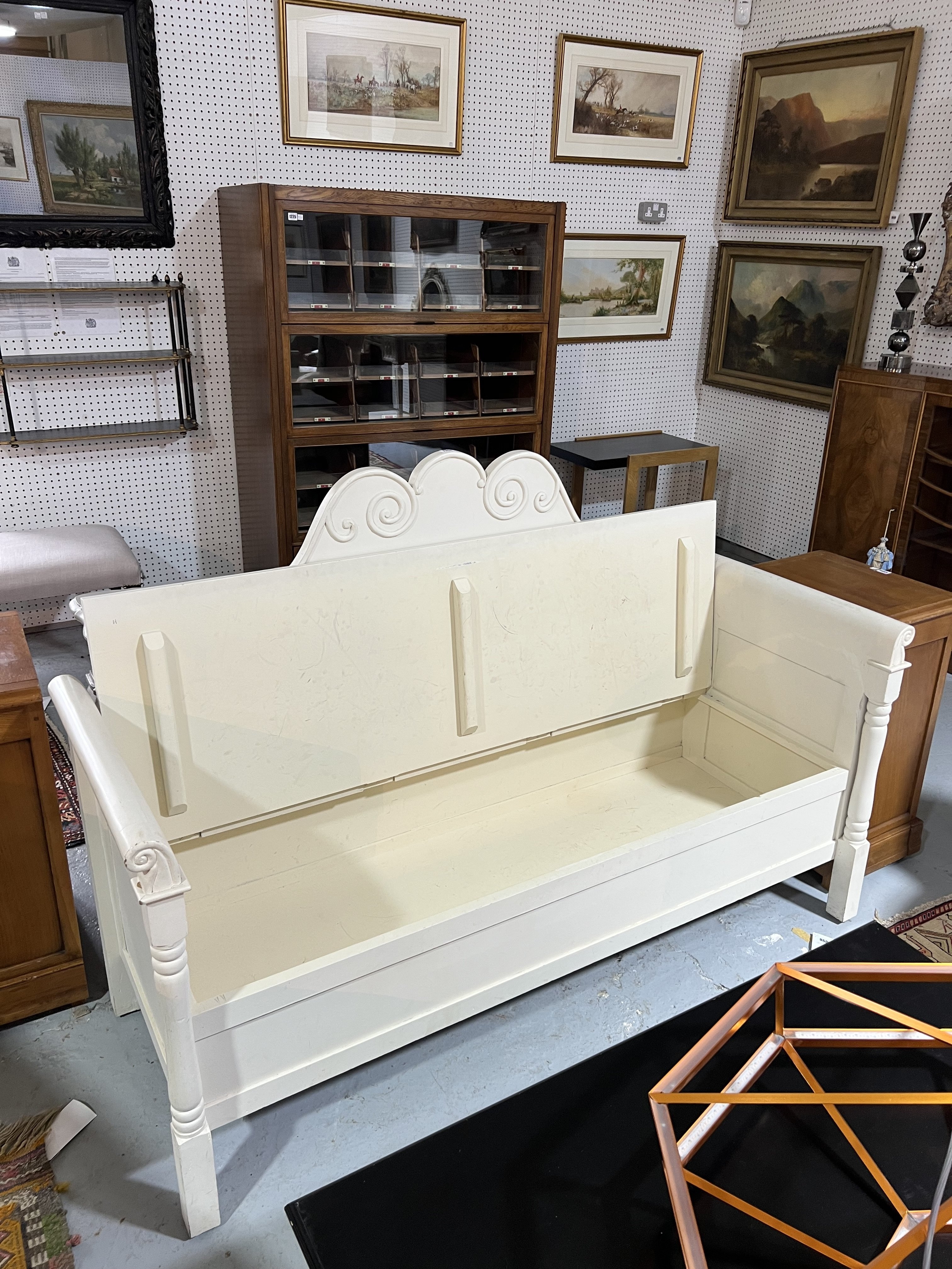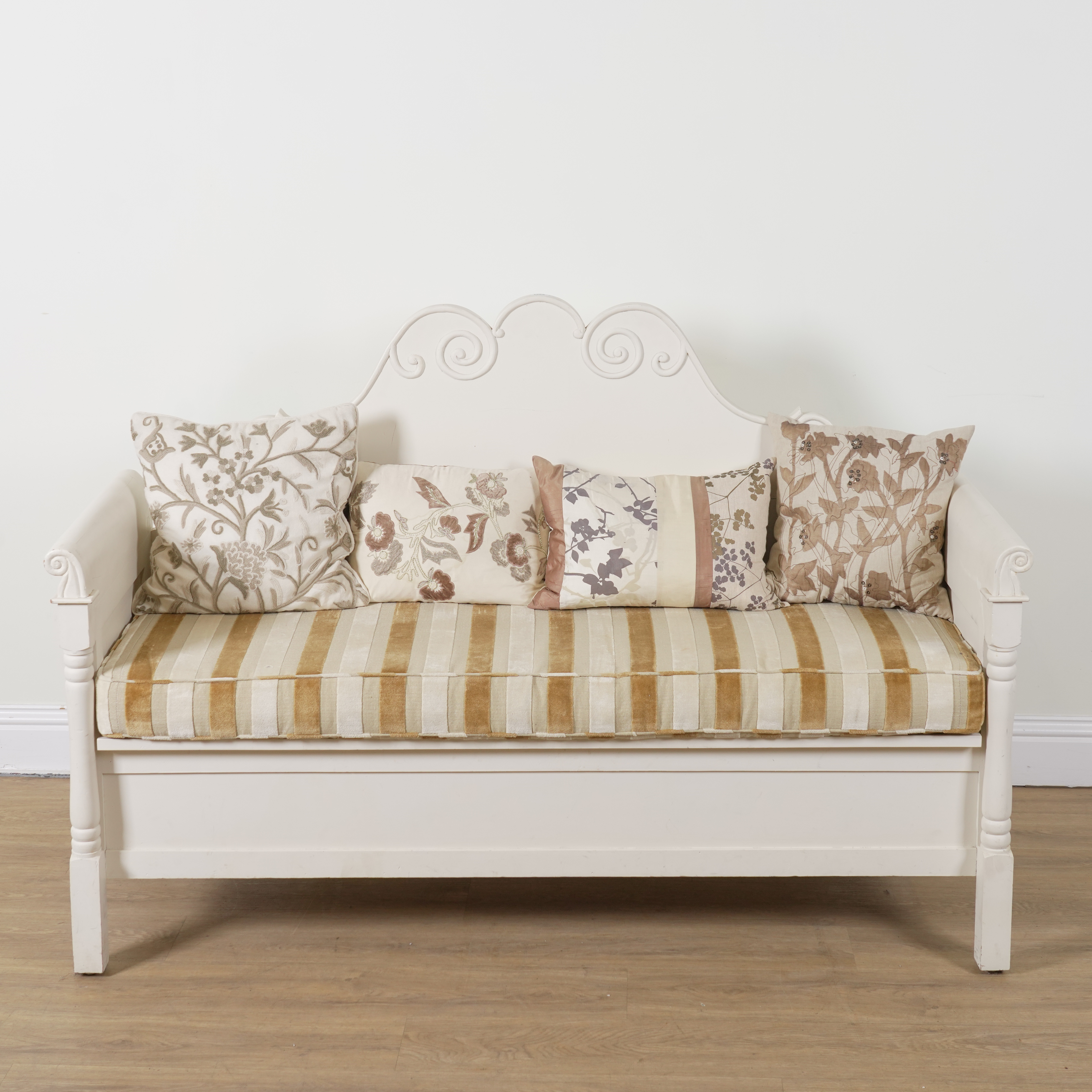 A MODERN CREAM PAINTED SHAPED BACK BOX SEAT SETTLE