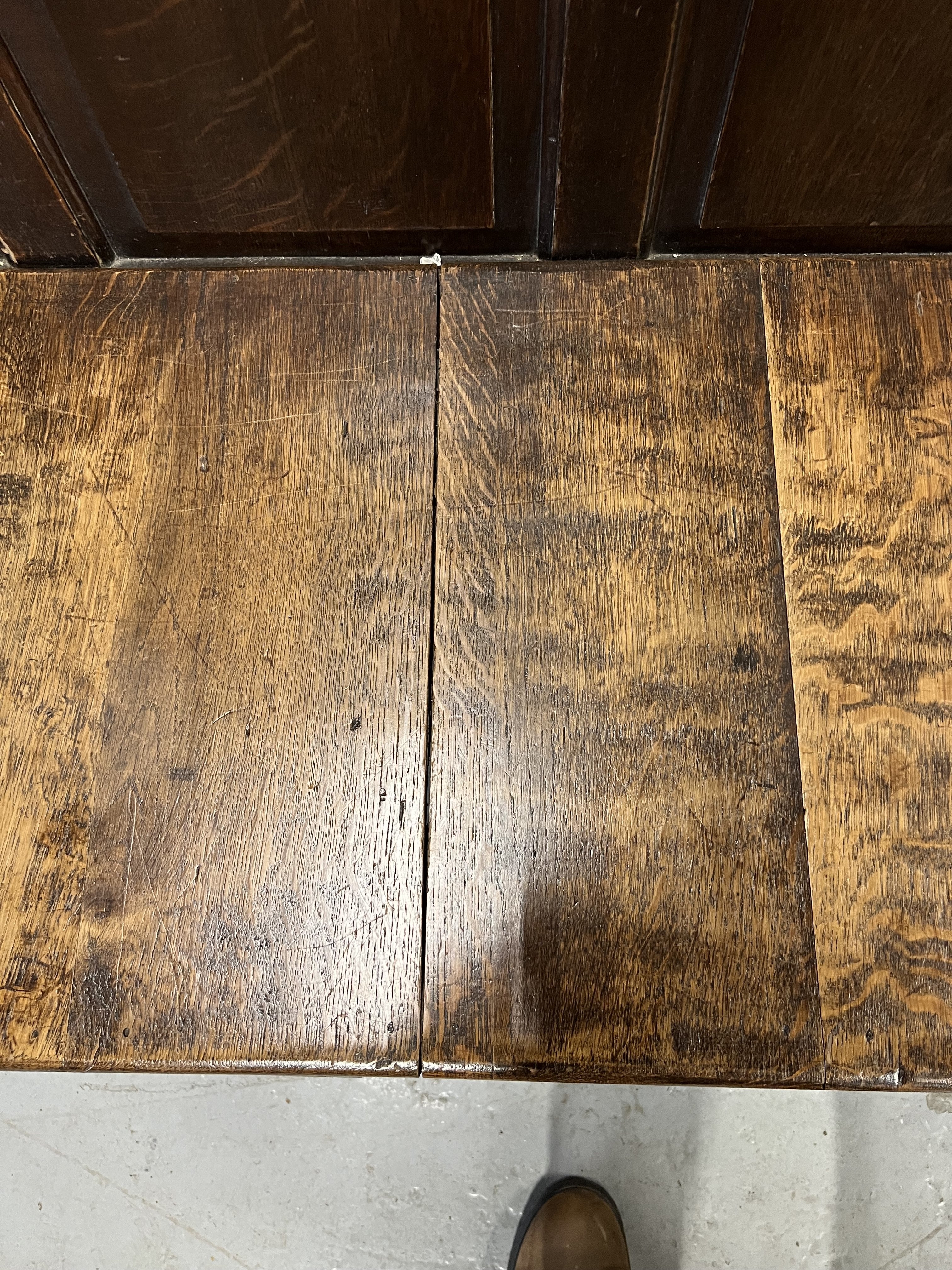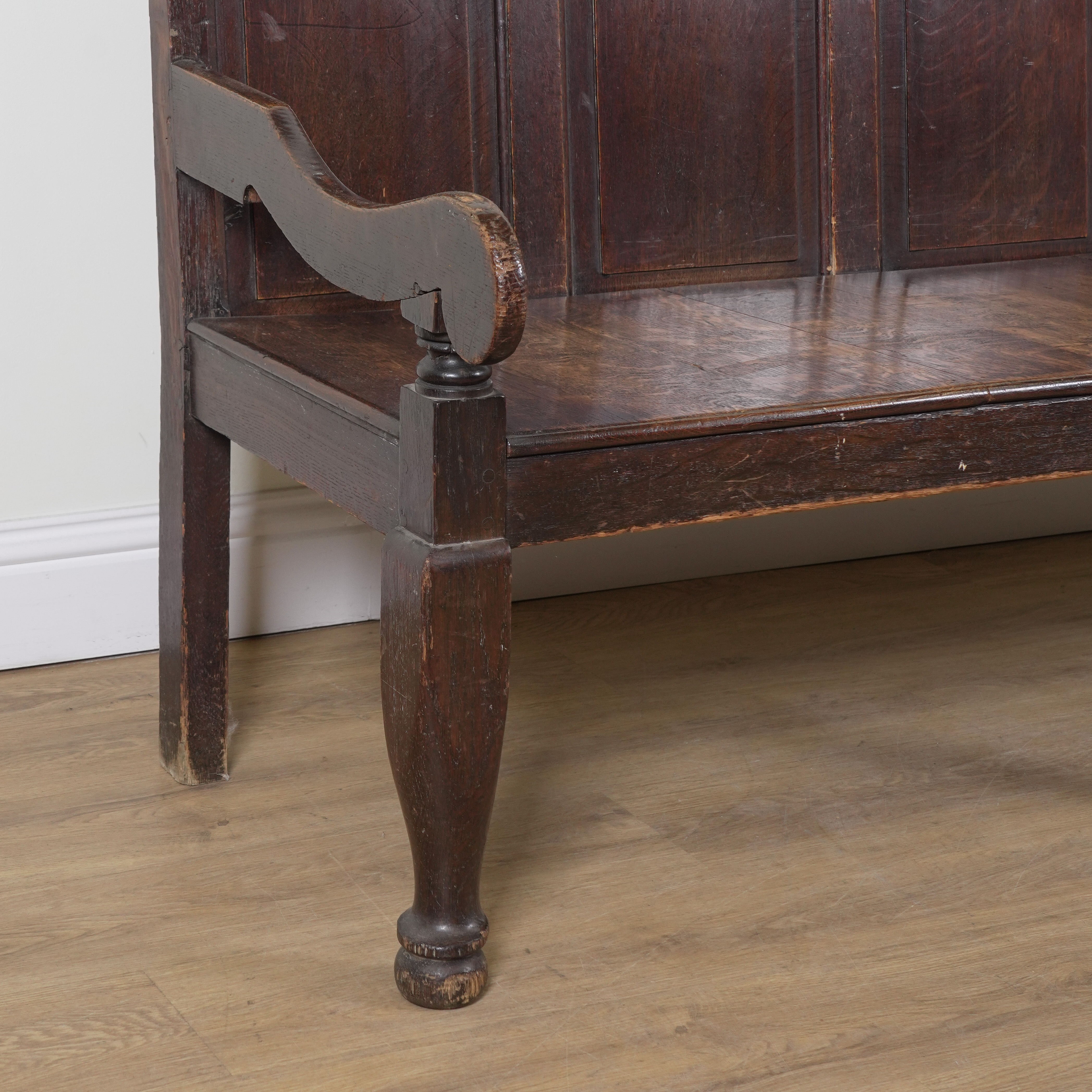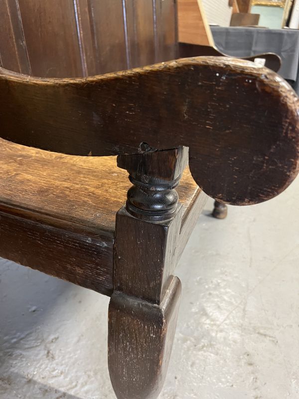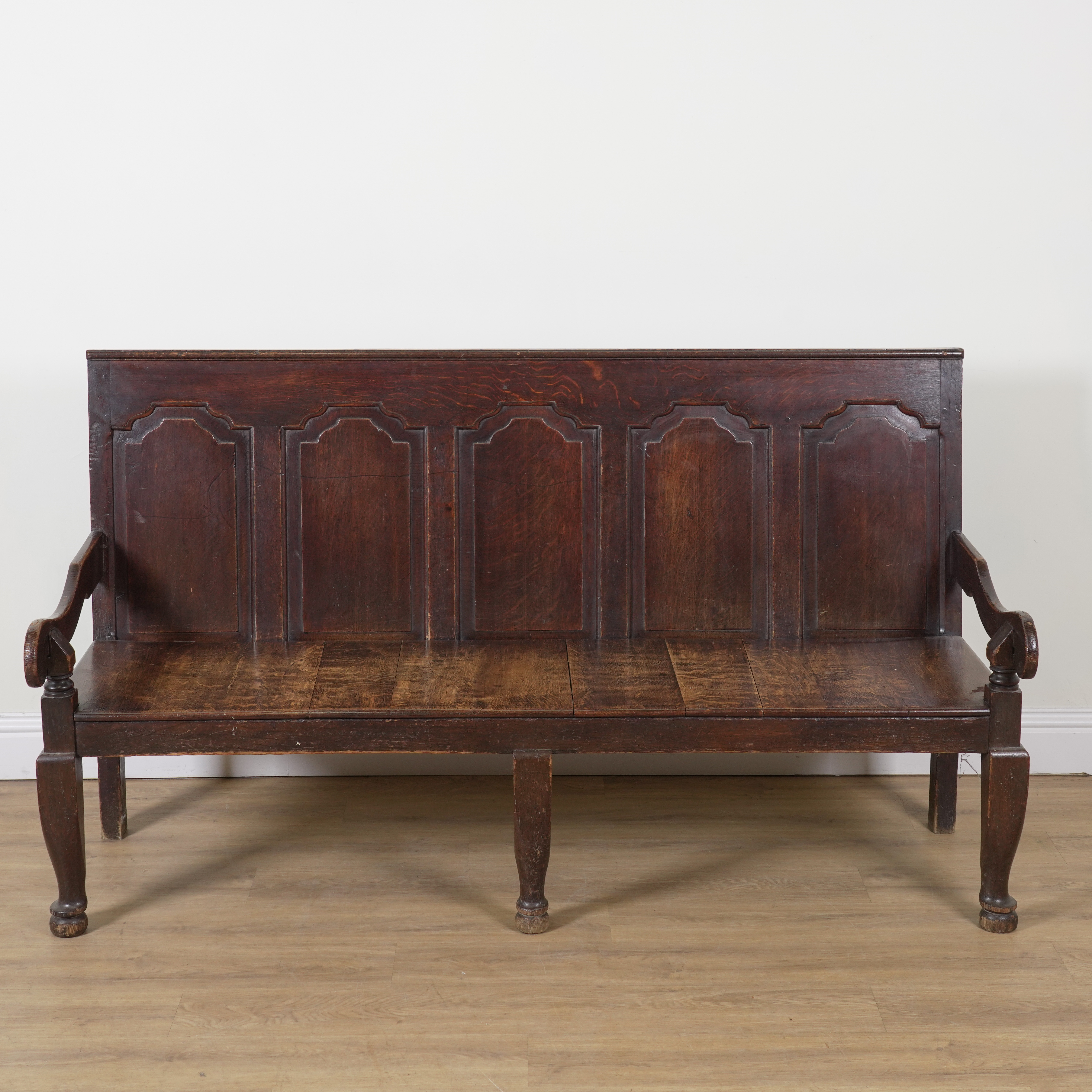 AN 18TH CENTURY OAK FIVE PANEL BACK OPEN ARM SETTLE