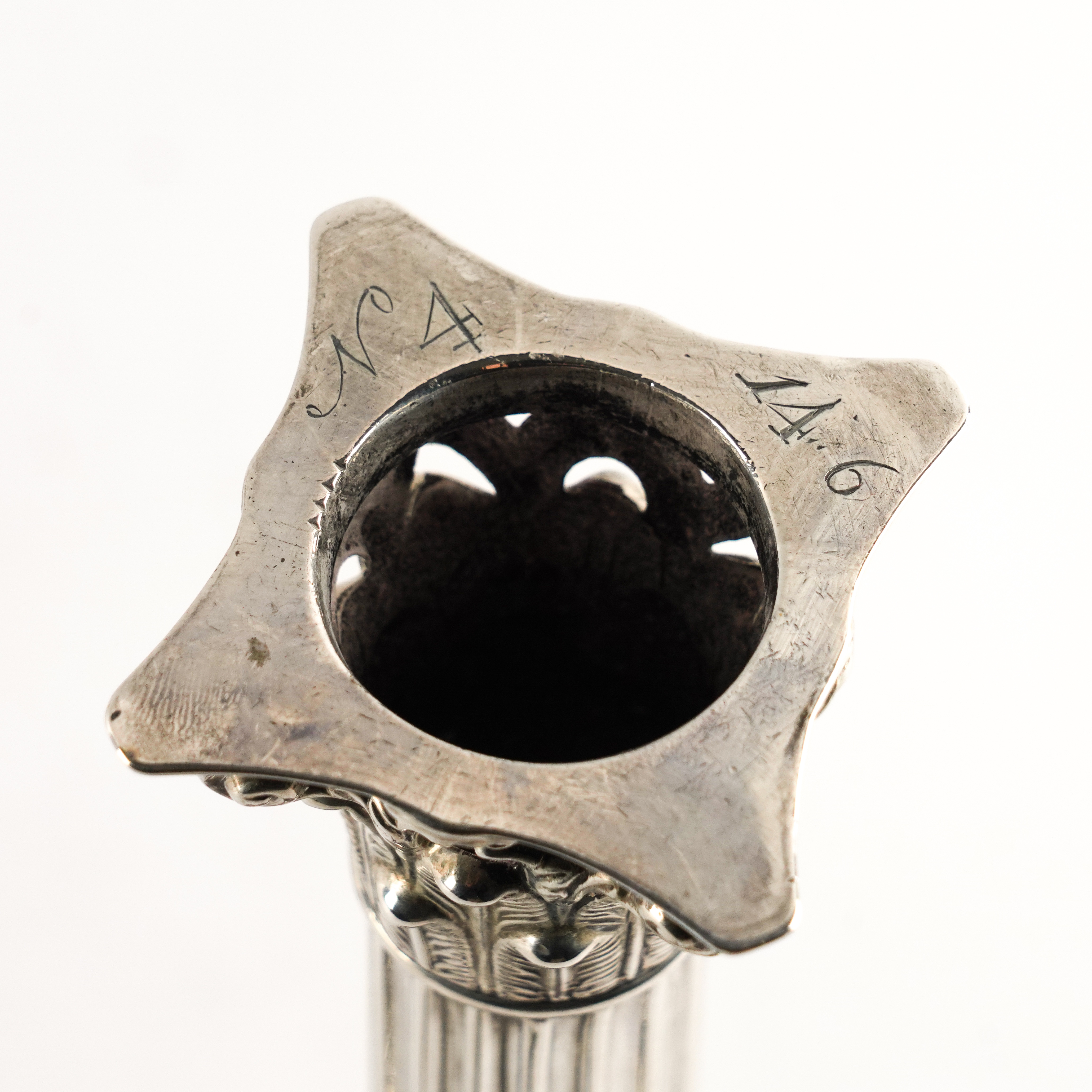 Each formed as a Corinthian column, with fluted decoration and gadrooned borders to the stepped square base, London 1770, the candlesticks and one sconce engraved with matching crests, the other sconce having a differing crest, all bearing maker's mark I.C (loaded), sample height 31.5 grams