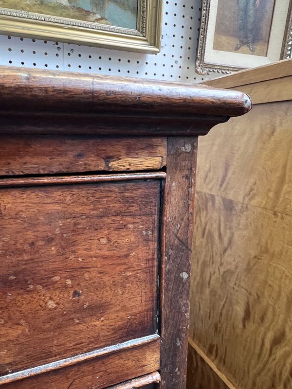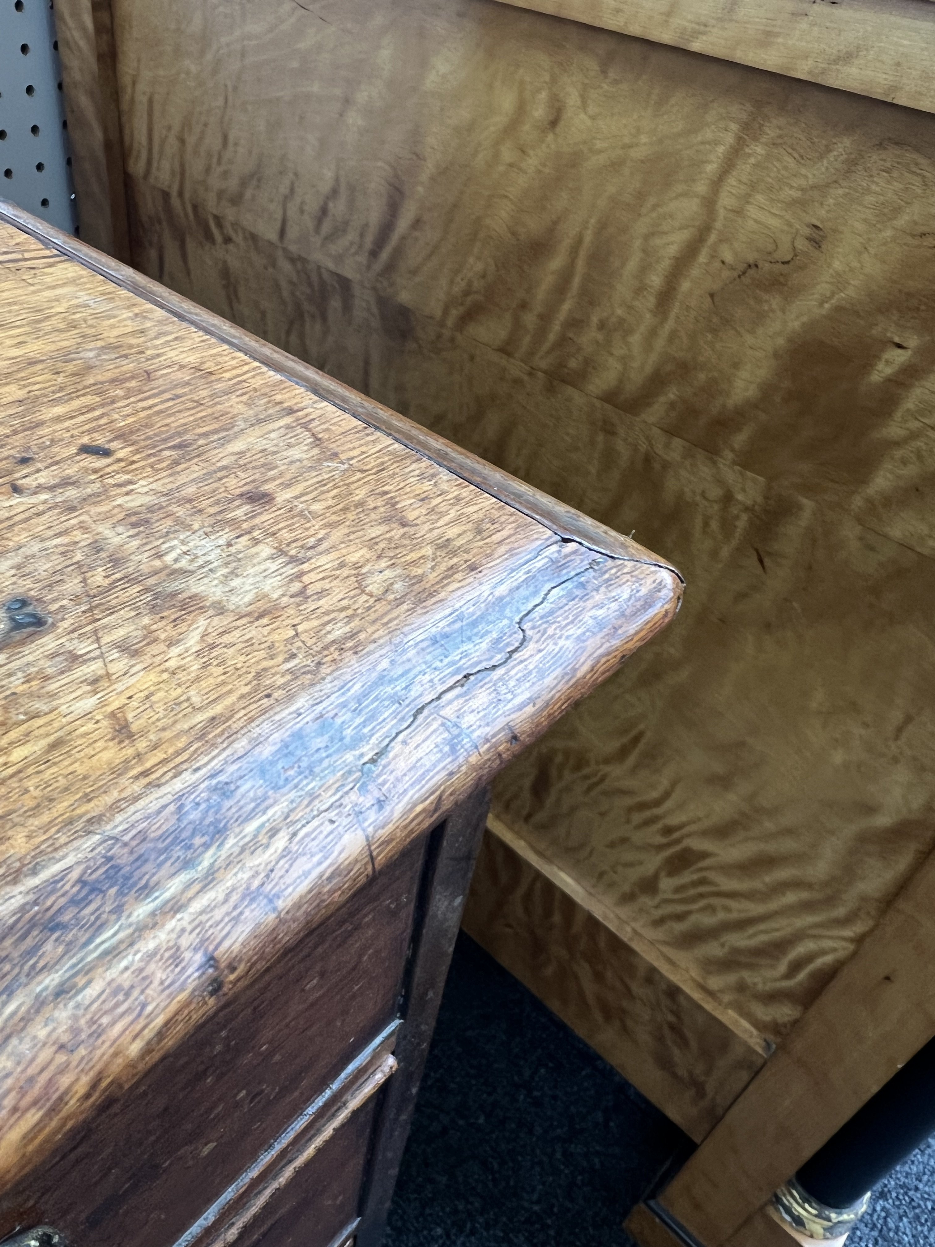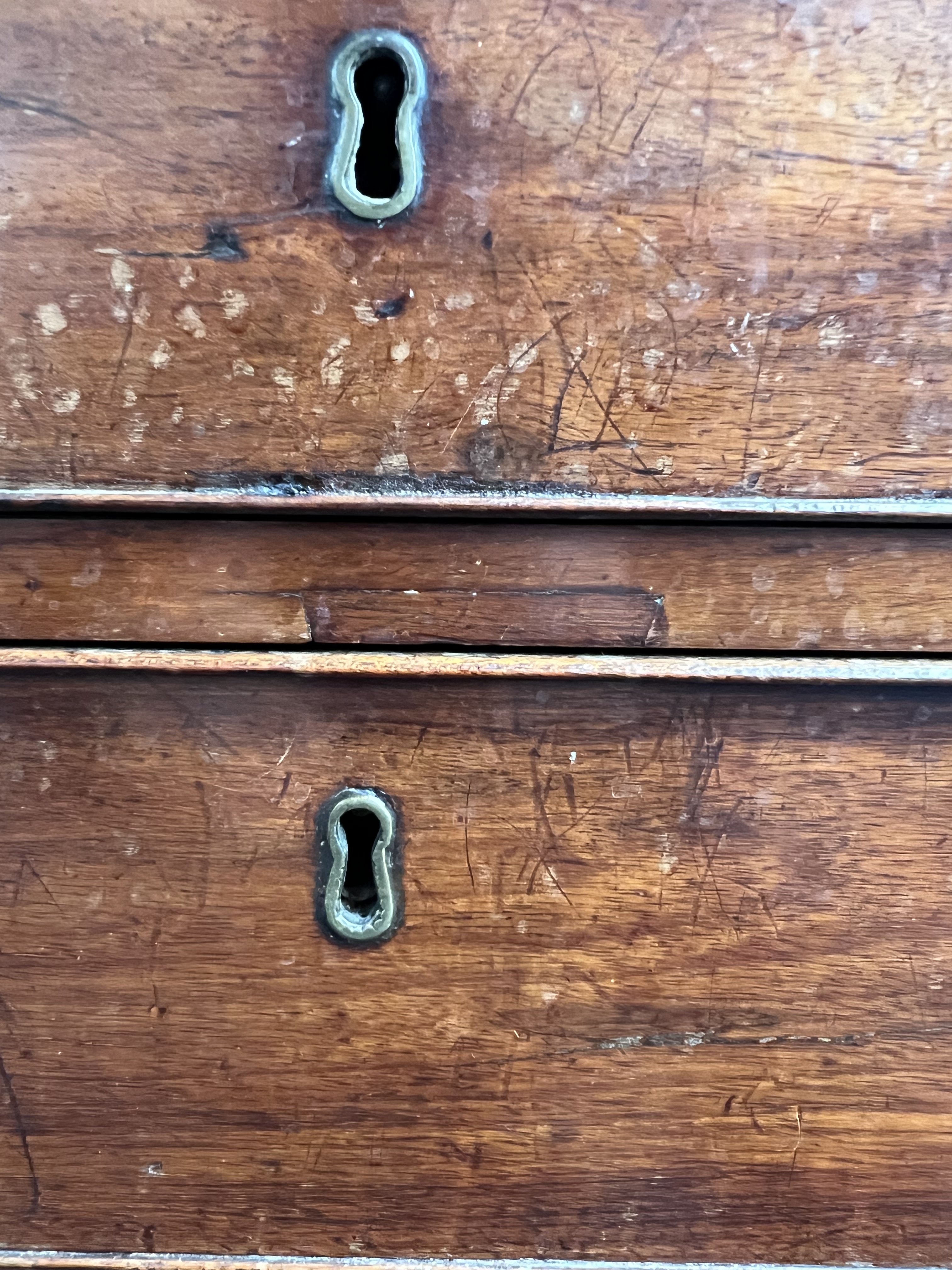 old marks and scratches present, both the left and right sections of moulding around the top are later, one split/crack to front right corner of the top, later handles fitted, some small sections of later wood inlaid around the top two drawer fronts, see images.