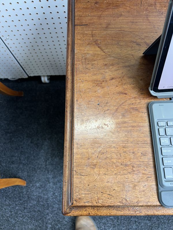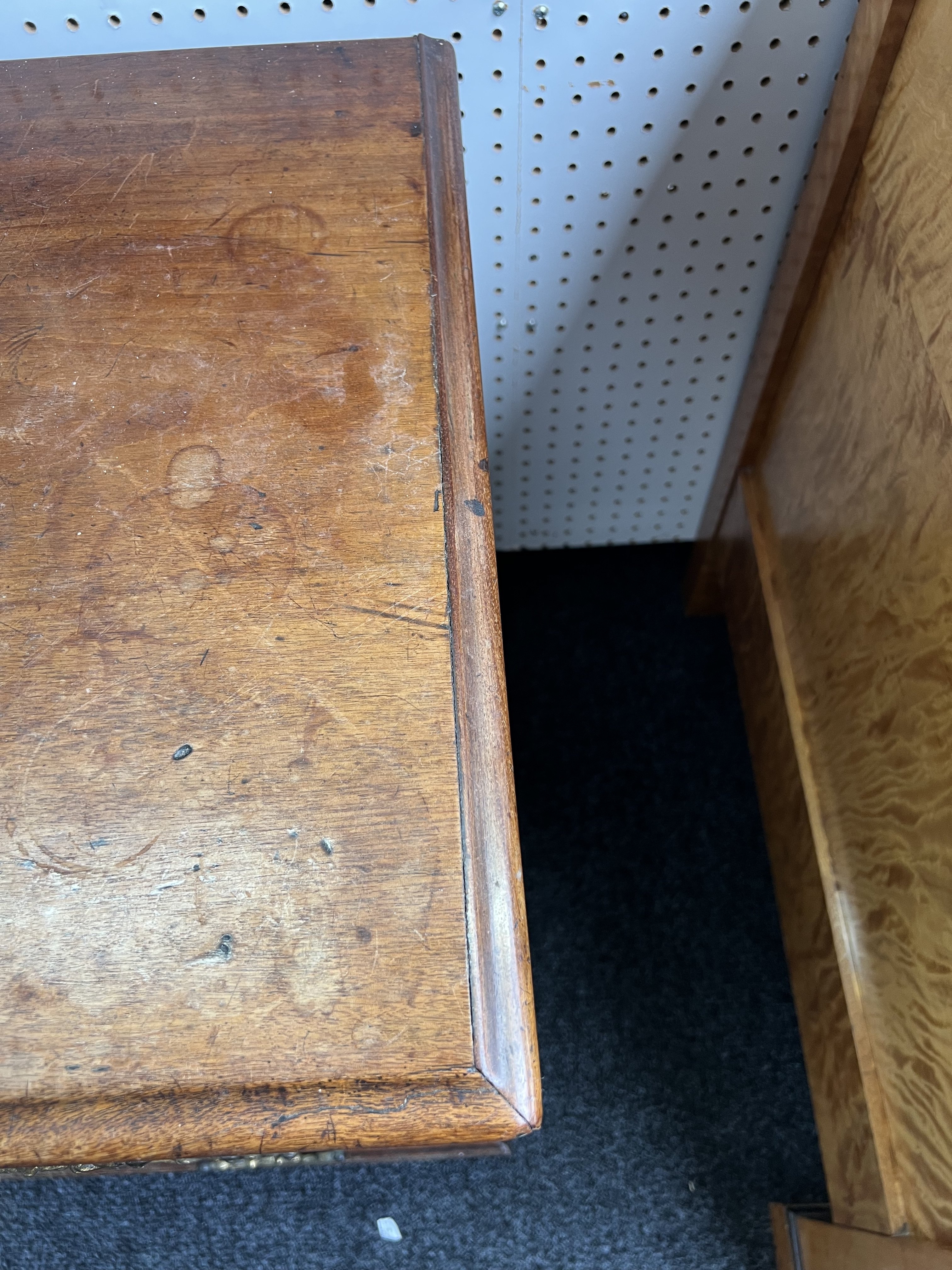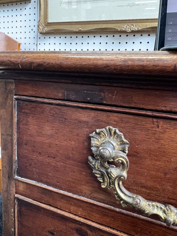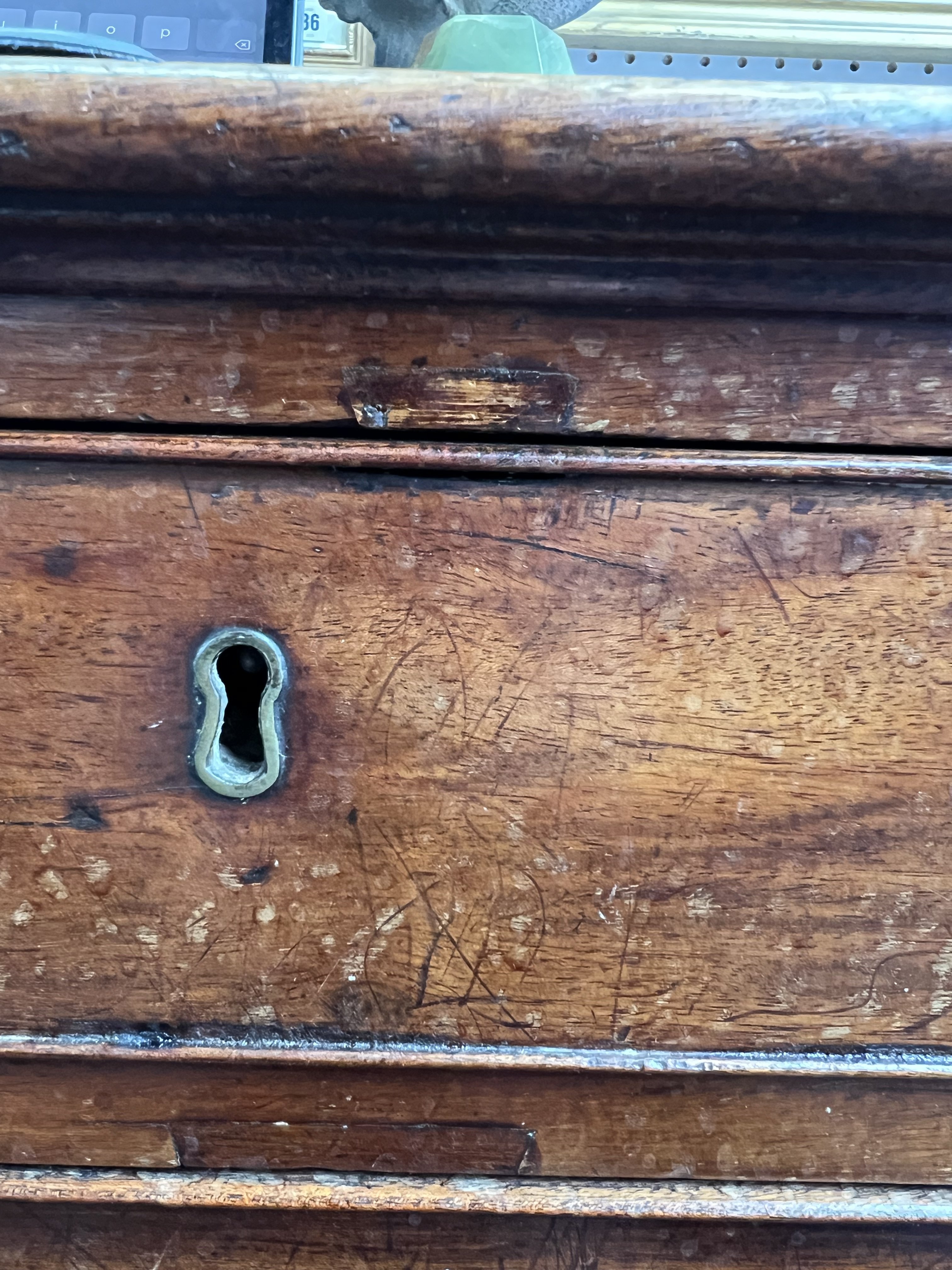 old marks and scratches present, both the left and right sections of moulding around the top are later, one split/crack to front right corner of the top, later handles fitted, some small sections of later wood inlaid around the top two drawer fronts, see images.