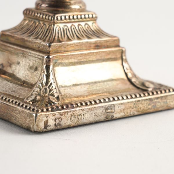 Each of urn form to the top, decorated with standing classical female figures above floral festoons, raised on a swept square base, having a beaded rim, London 1882, height 11cm (loaded)