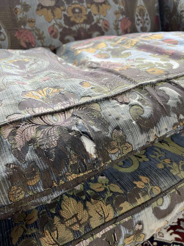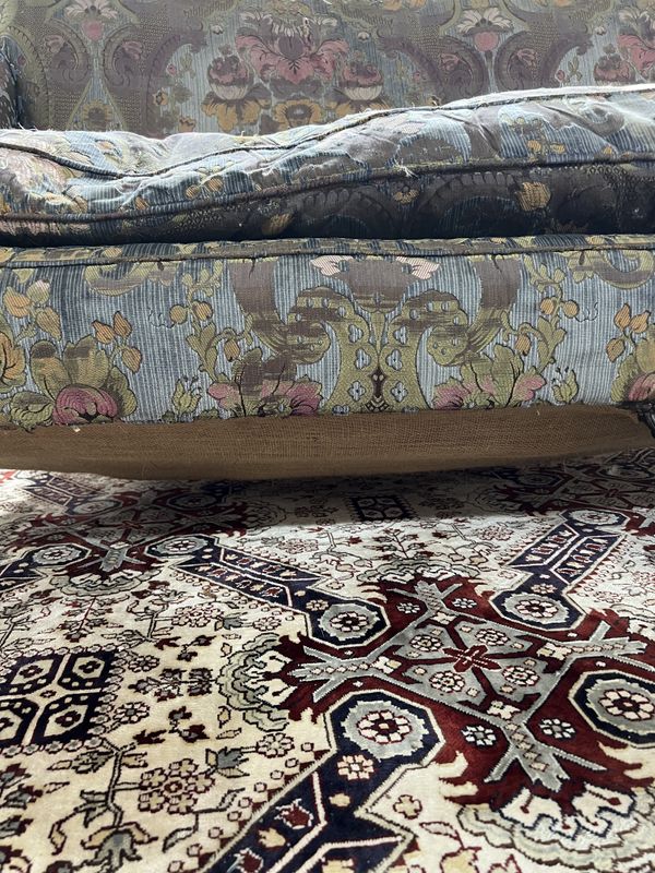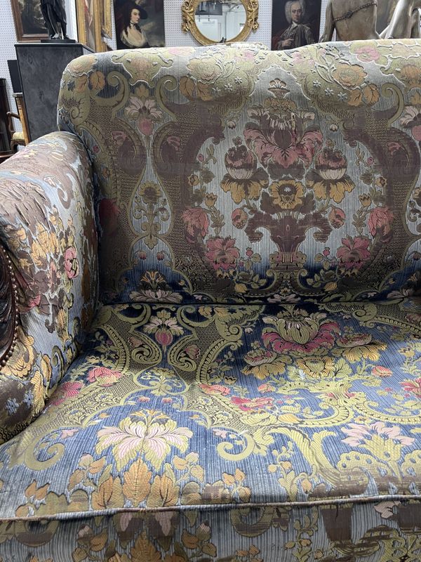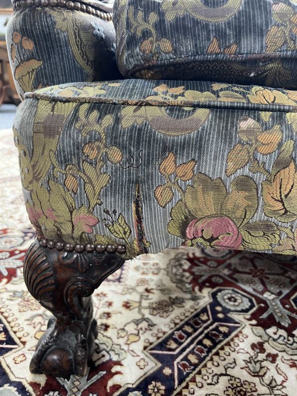 old marks and scratches to the arms and supports, springs have gone to both sides of the seat more so the left side, small amount of movement to the arms, cushion is feather filled, upholstery fairly worn in places with some rips and tears around the sofa, see images.