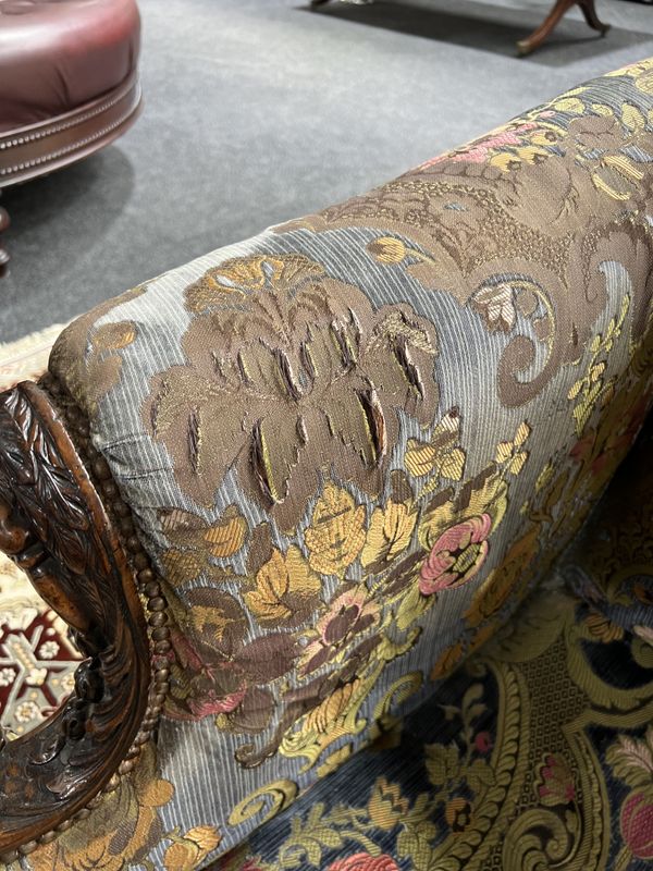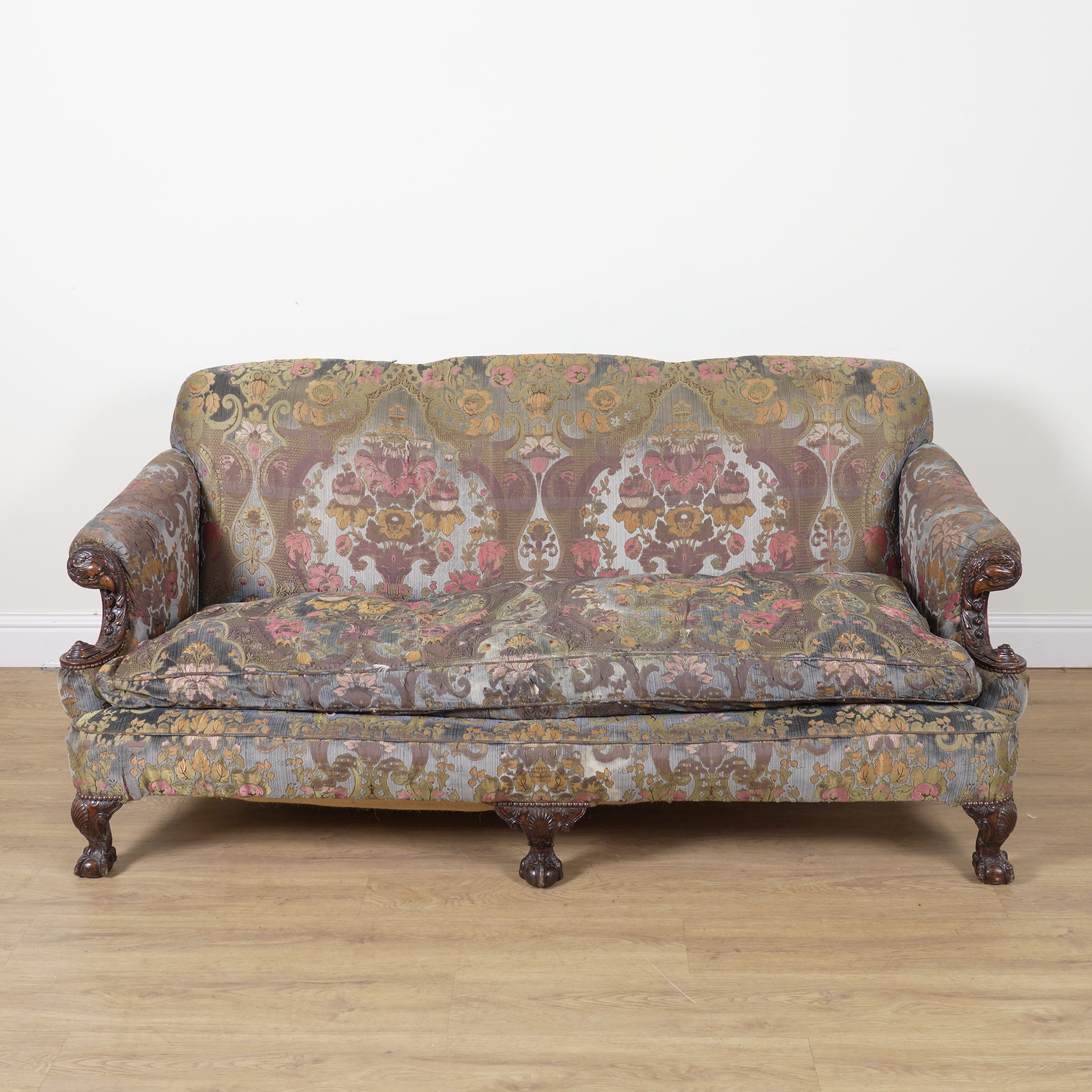 Circa 1900, with carved eagles head arm finials and claw and ball feet, 195cm wide; 90cm high