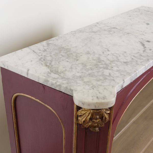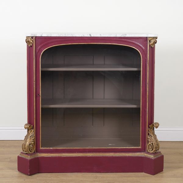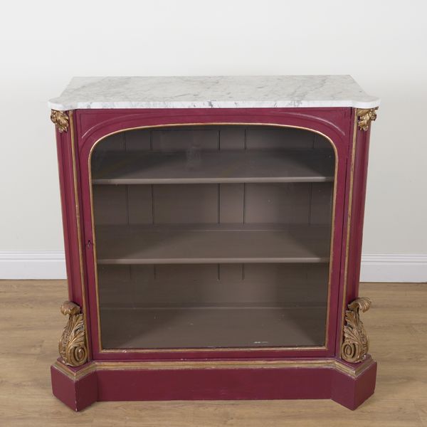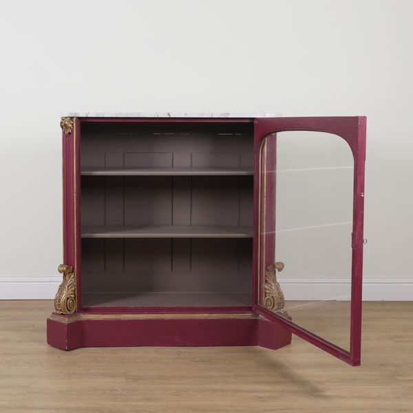 With later painted parcel gilt burgundy red single glazed door base, 113cm wide; 43cm deep; 118cm high