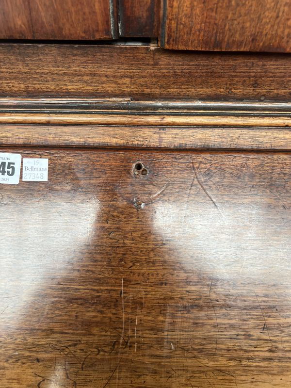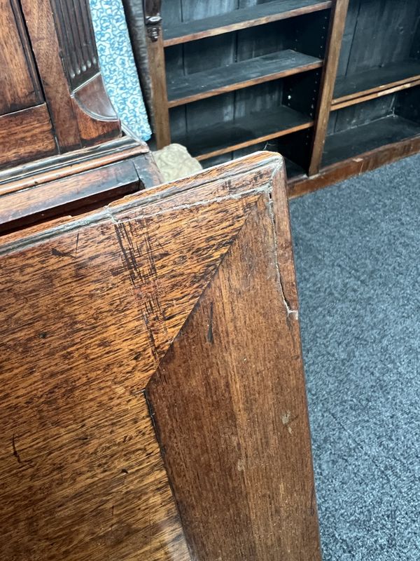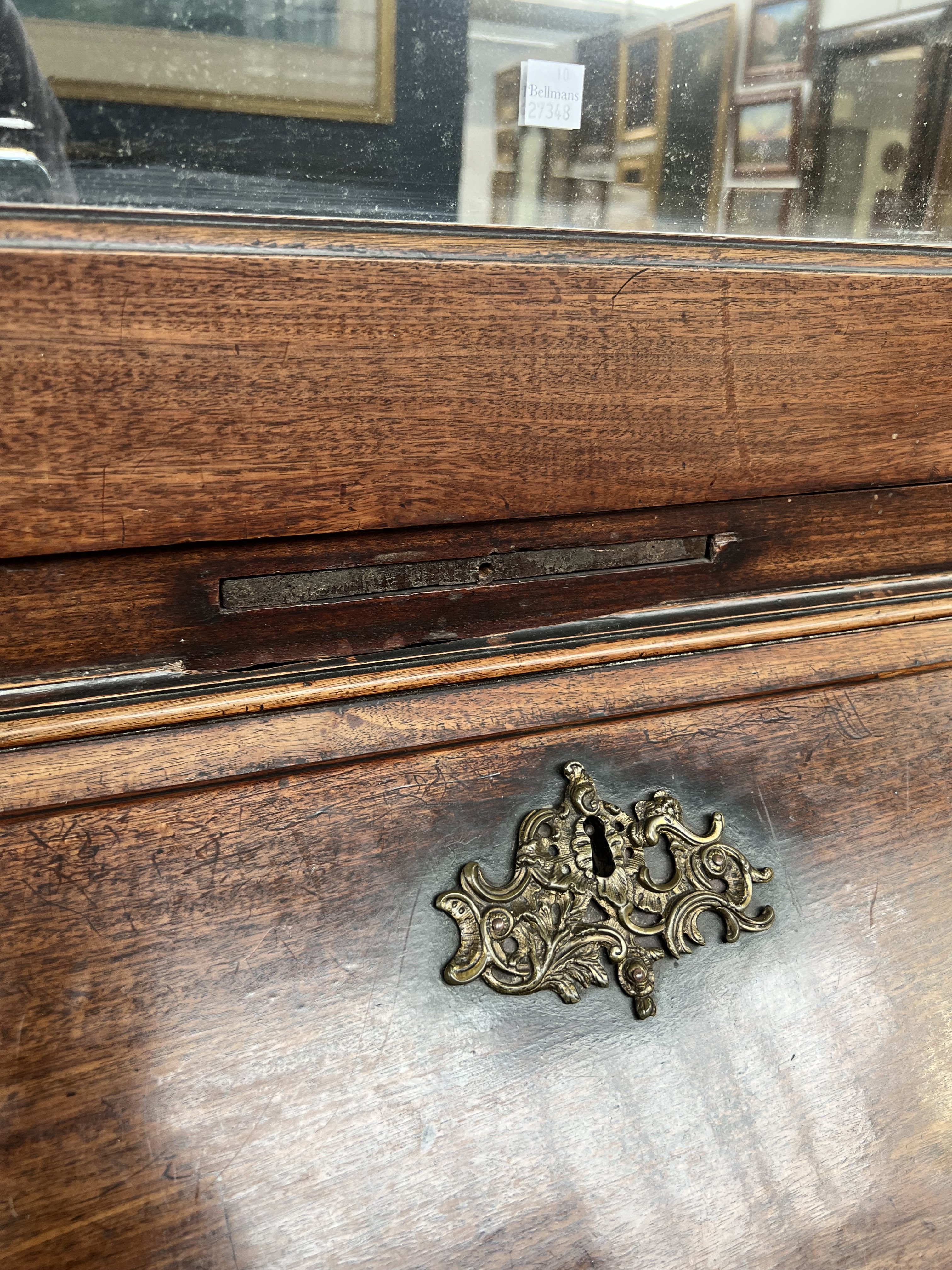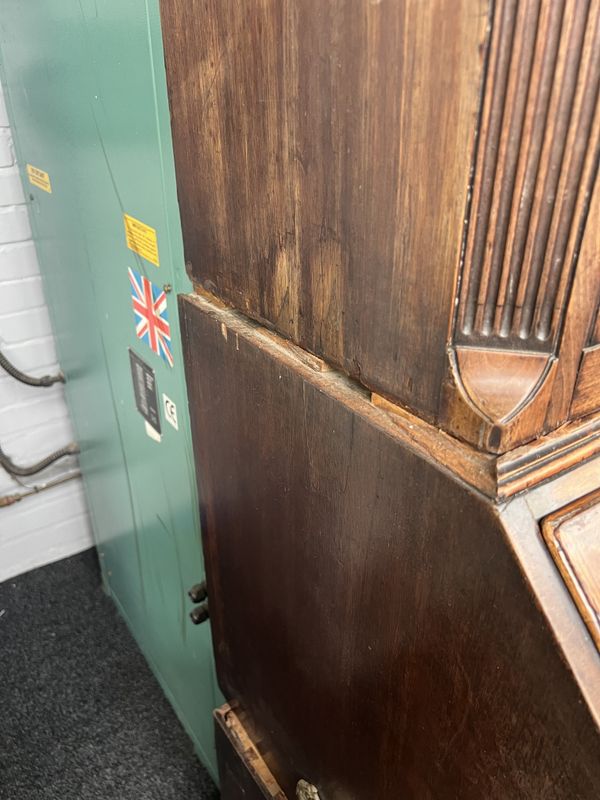 old marks and scratches present throughout the piece, signs of later restoration/alterations. handles originally fitted to the sides of the top section, missing a section of moulded edge to left side of bureau top, see images.