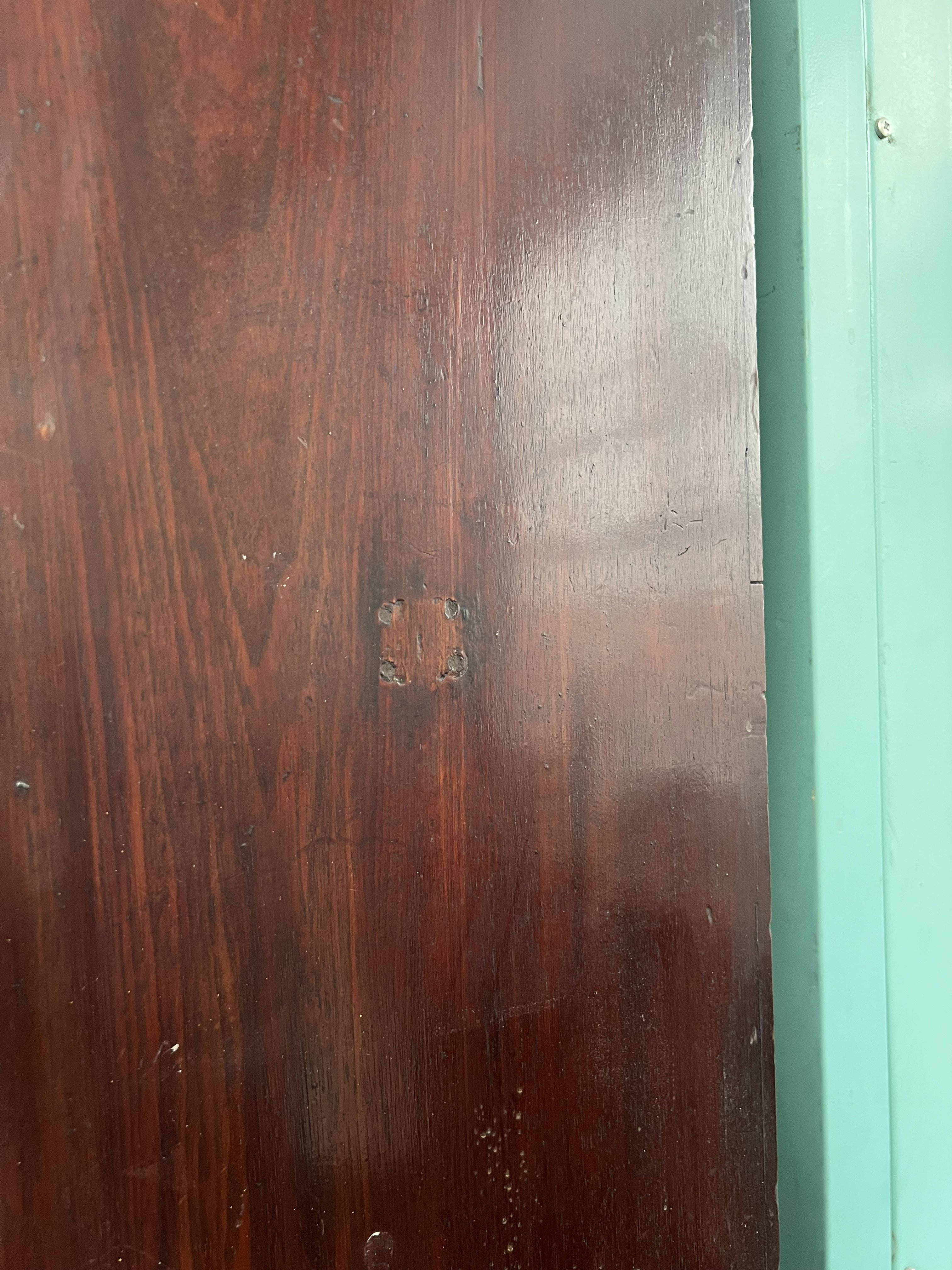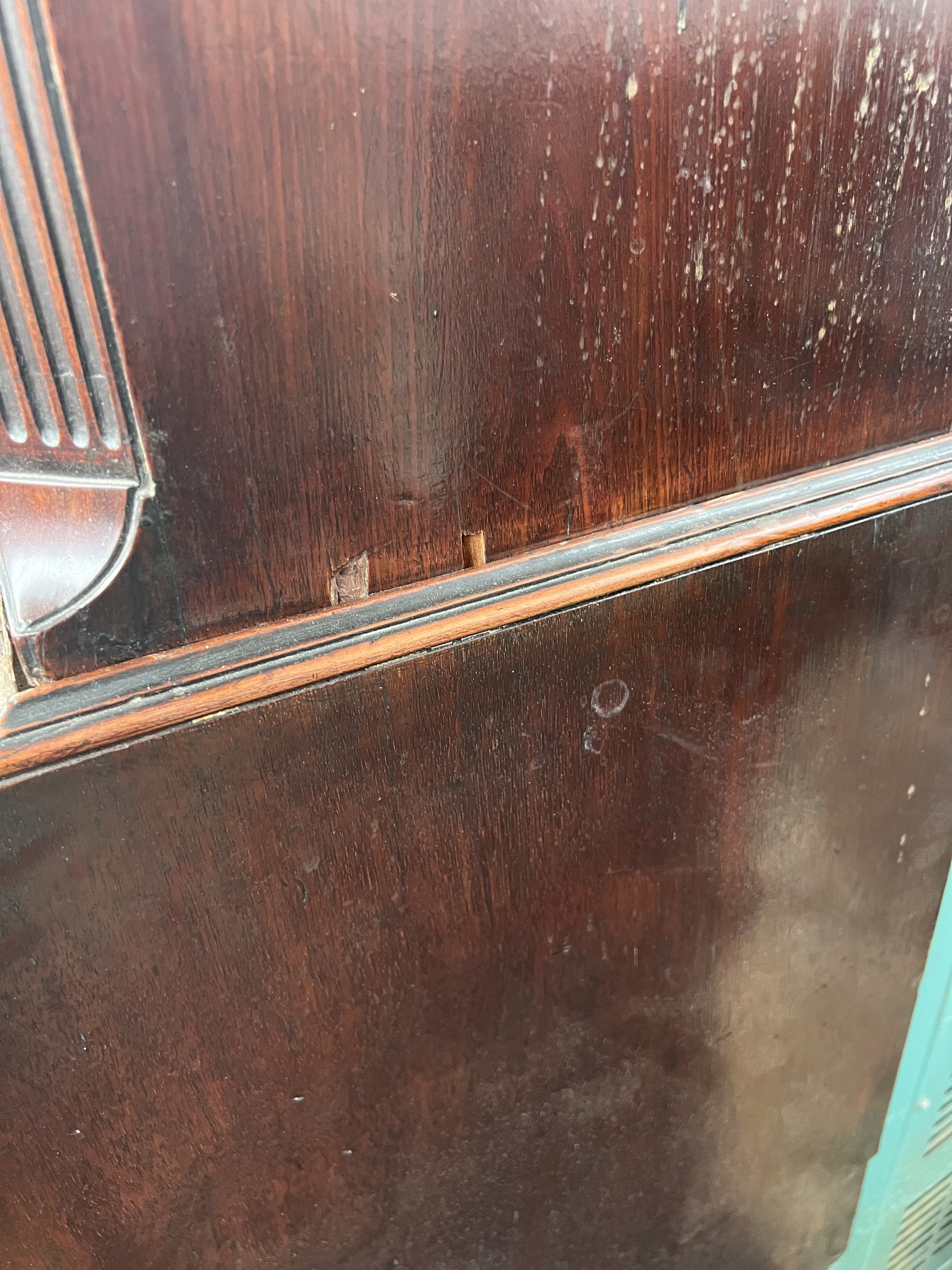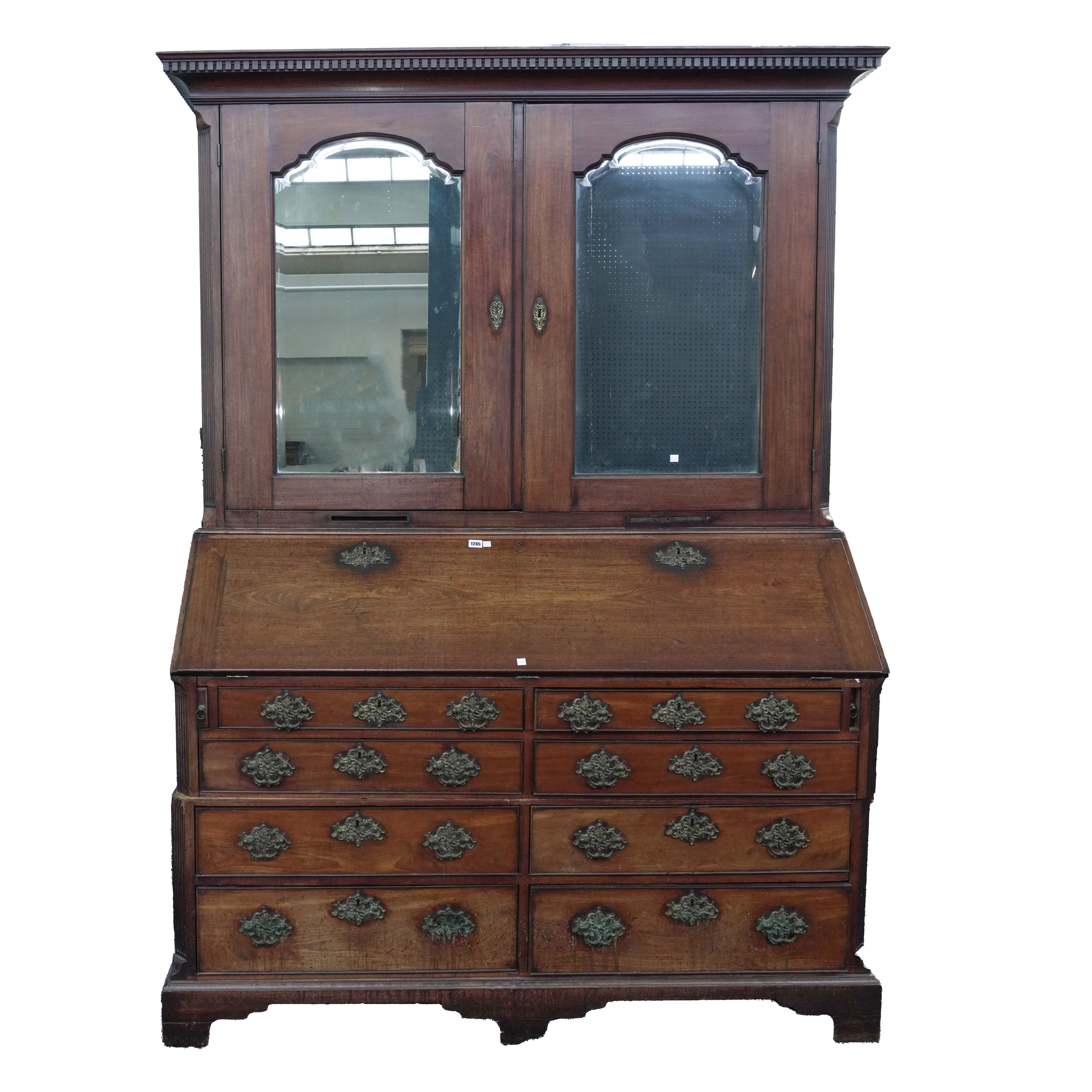 old marks and scratches present throughout the piece, signs of later restoration/alterations. handles originally fitted to the sides of the top section, missing a section of moulded edge to left side of bureau top, see images.