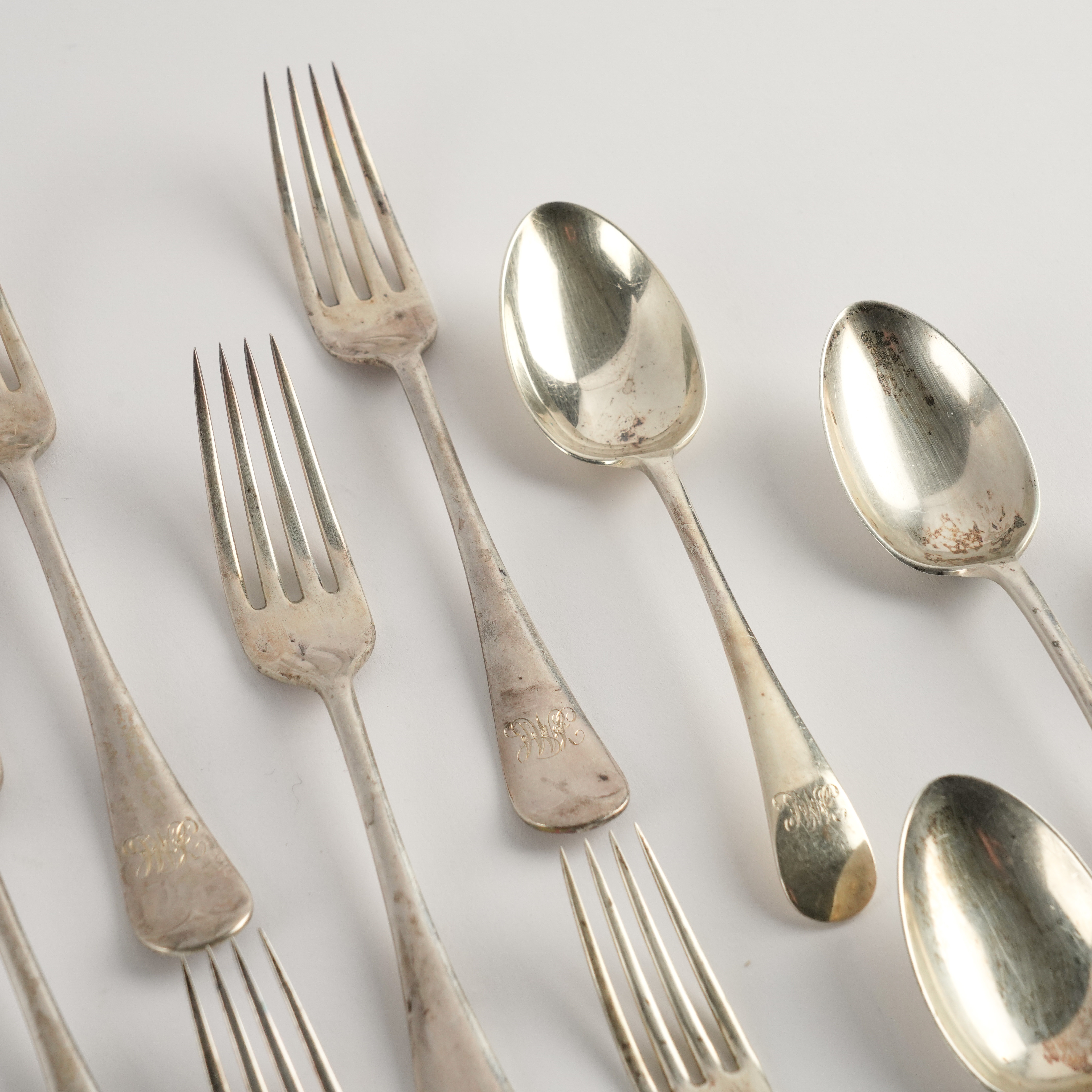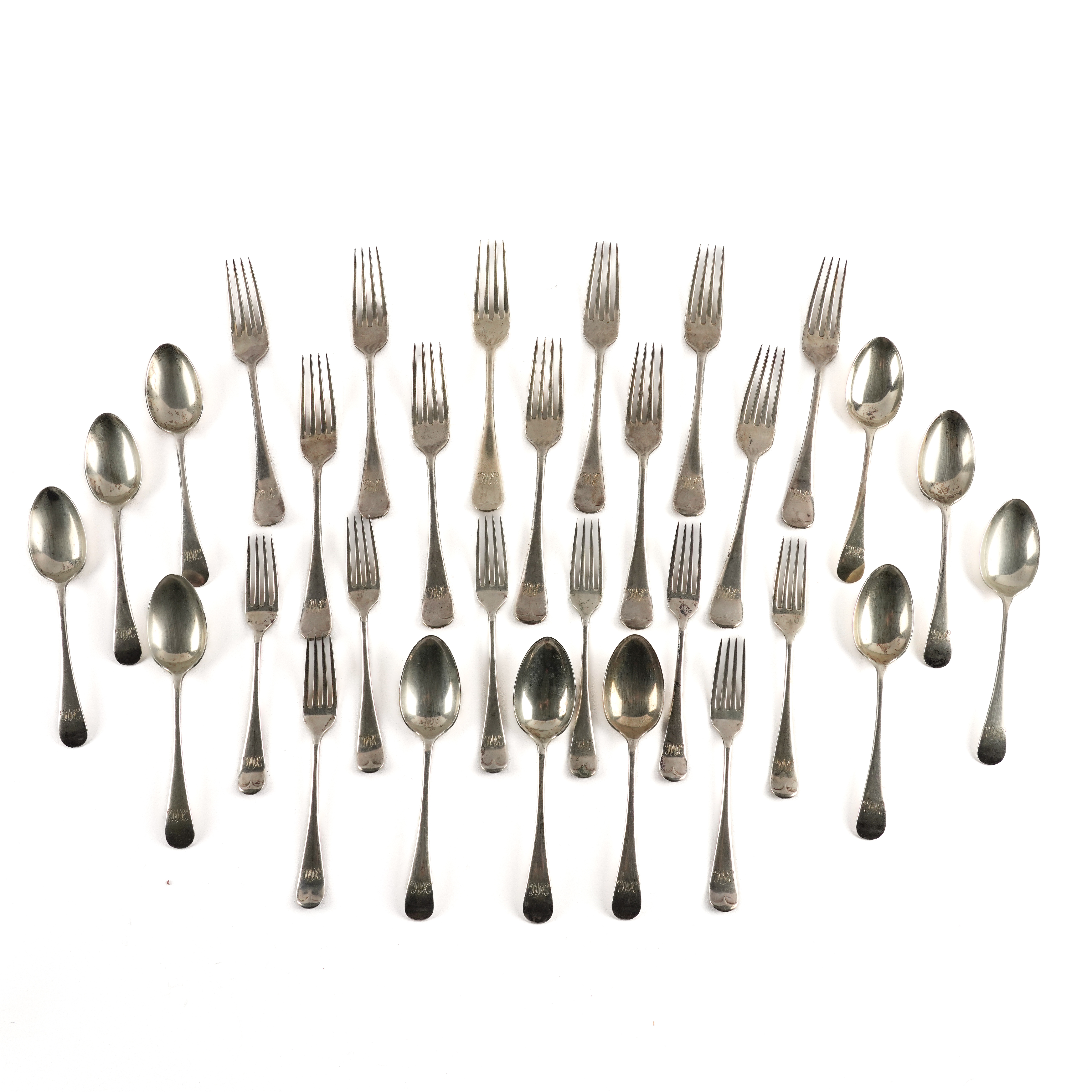 Comprising; twelve table forks, twelve dessert spoons and twelve dessert forks, all monogram engraved, Sheffield 1904, combined weight 2155 grams