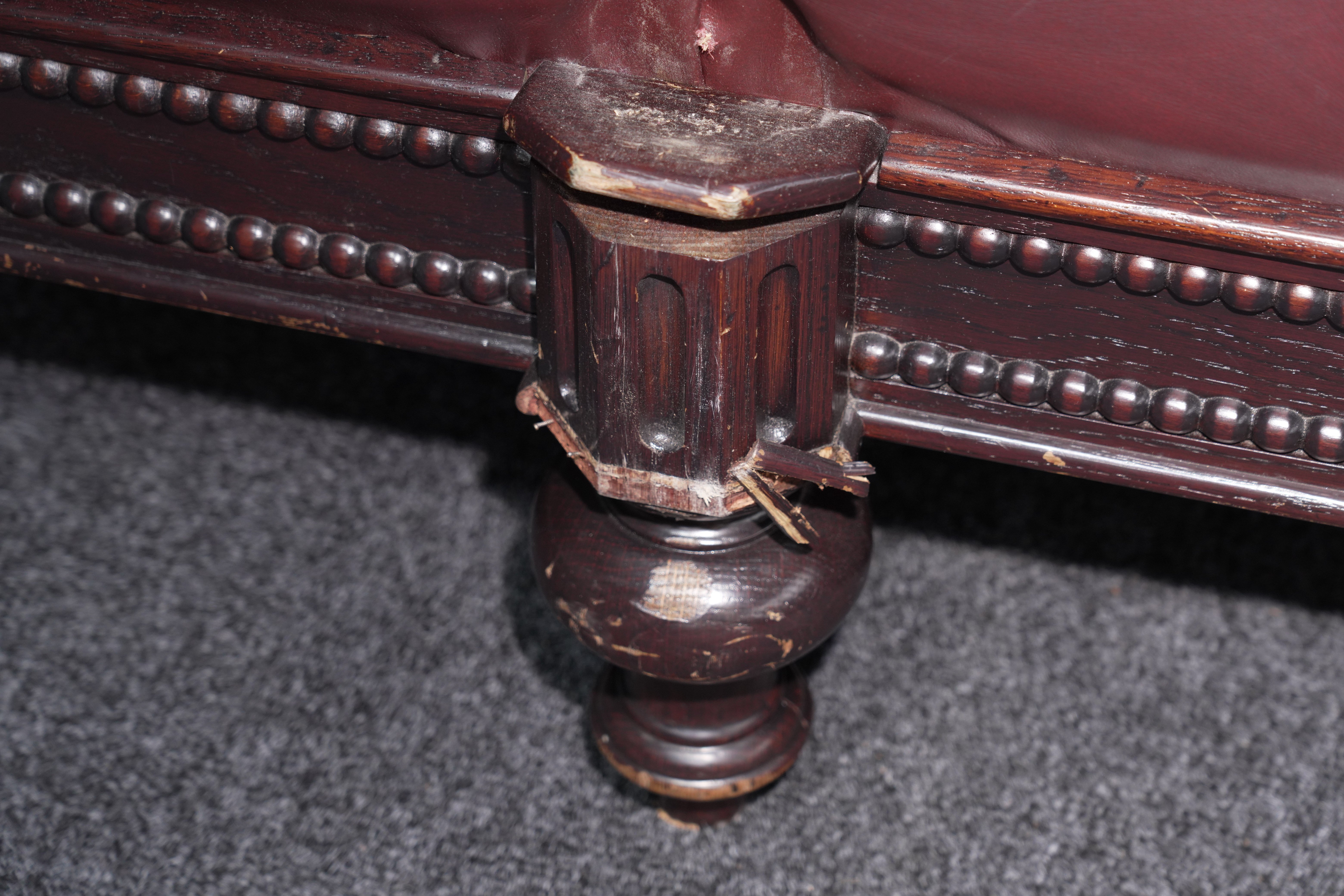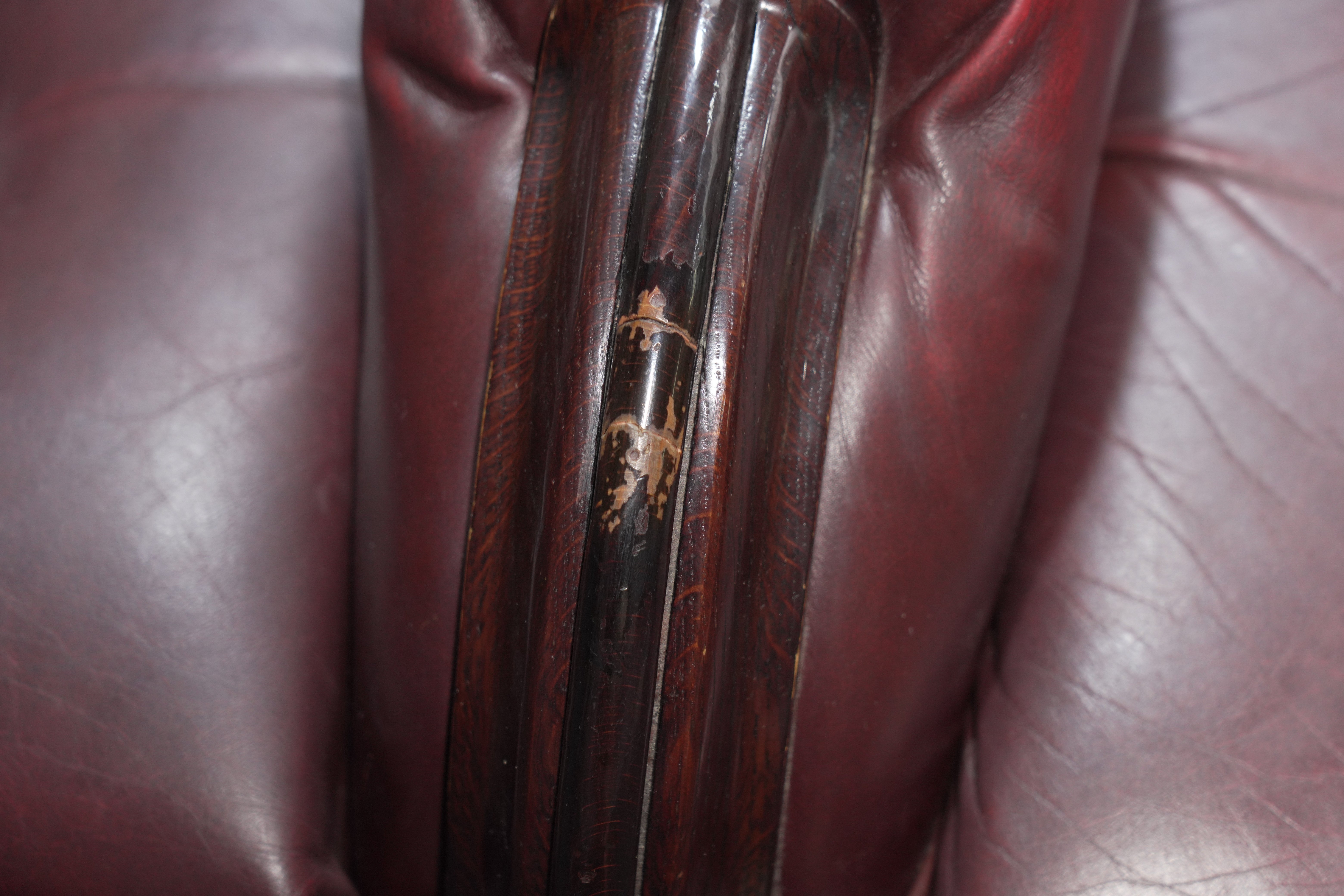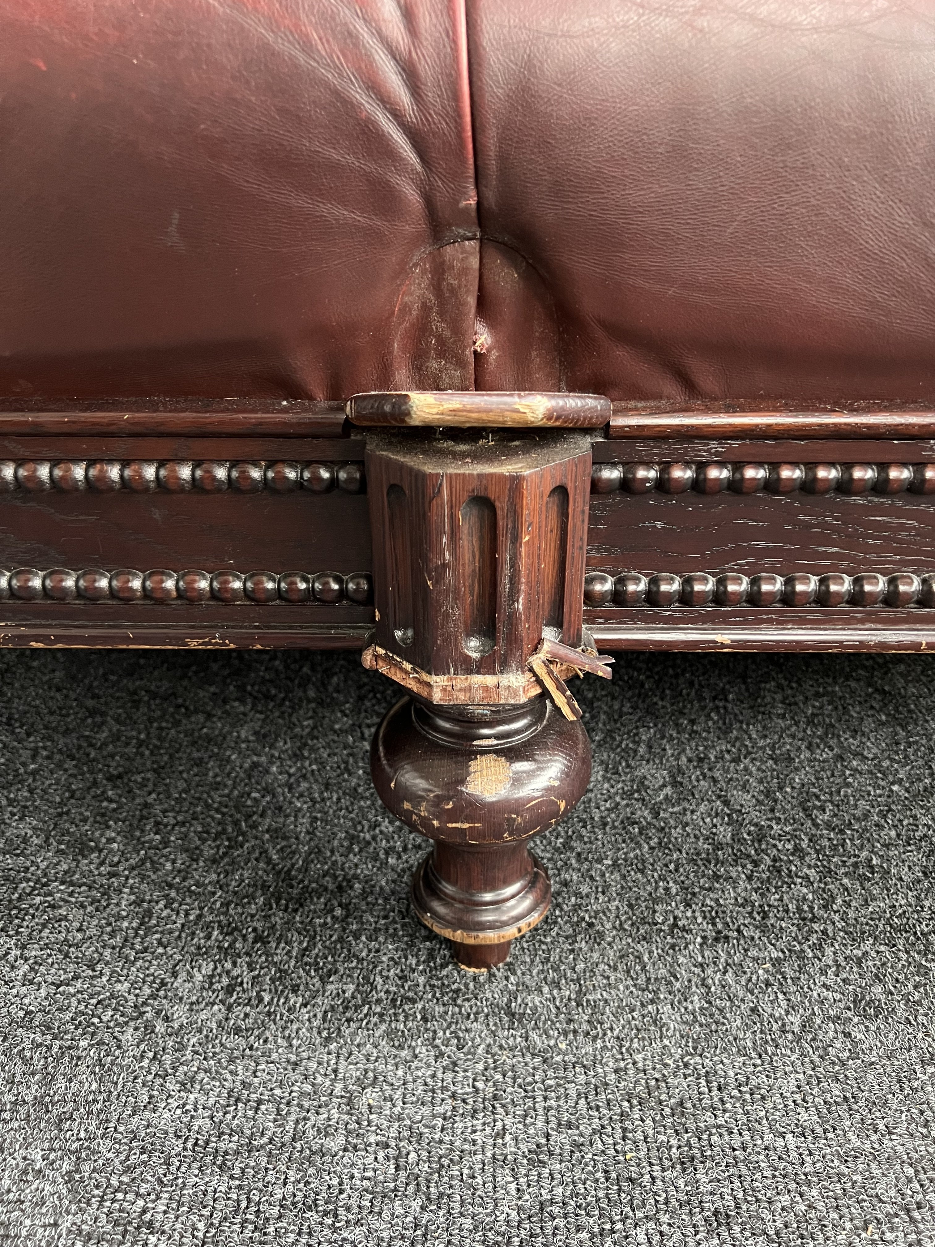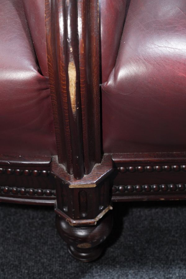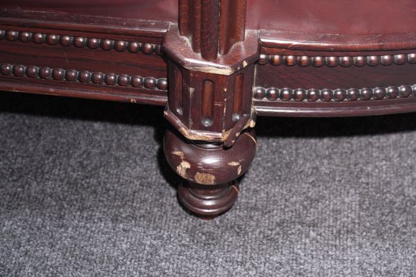 Condition Report: In structurally sound condition, there are no wobbles to the back or arms. There is some minor cracking and fading to the leather. The extreme edges have scuffs and marks consistent with public use. The leather would benefit from nourishing and the frames could do with a light repolish. There is some loss to the moulded edge to four of the eight legs. The leather is also discoloured primarily to the arm rests. Some buttons to the upholstery are lacking the leather covers and there are approximatley 10 additional buttons missing.