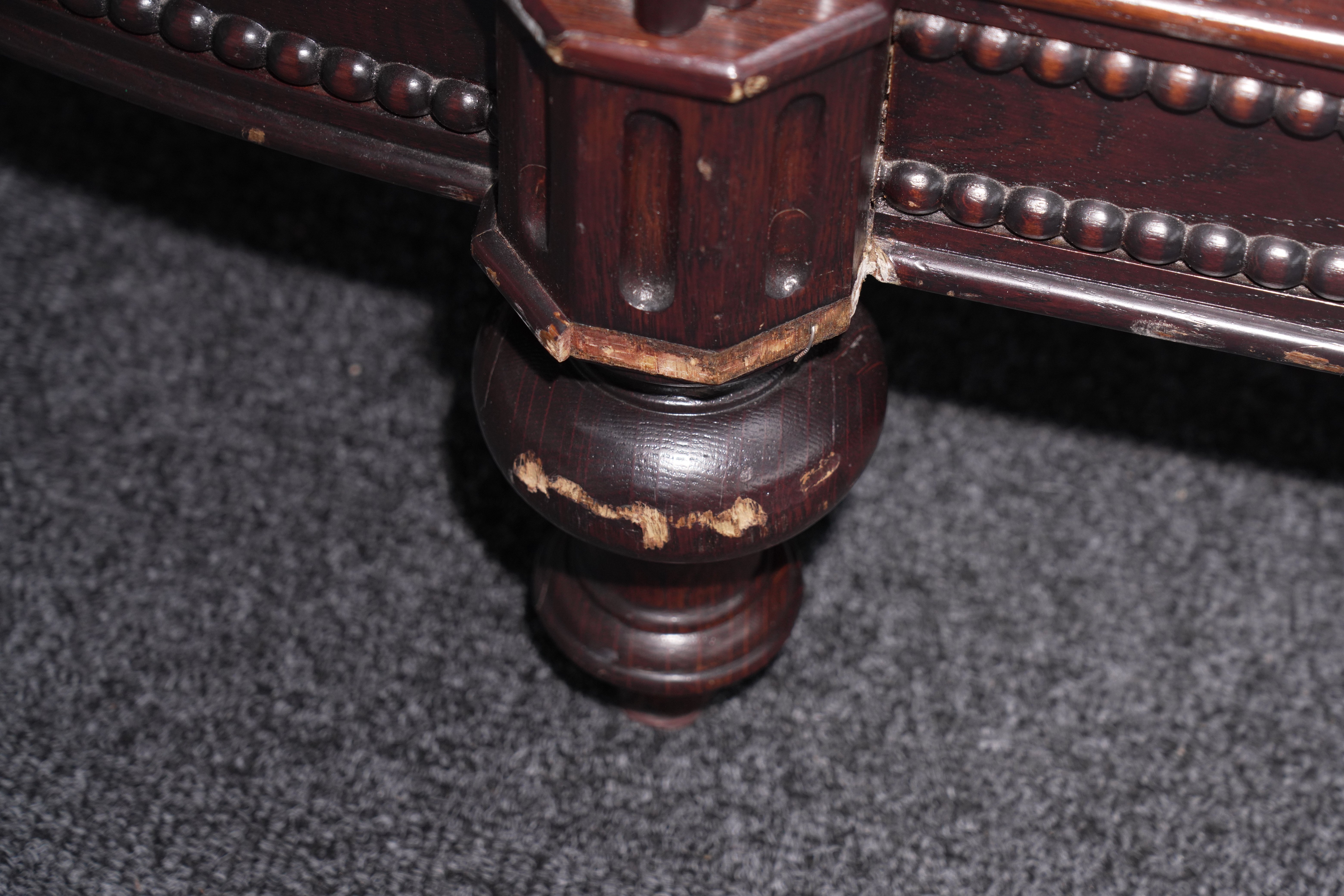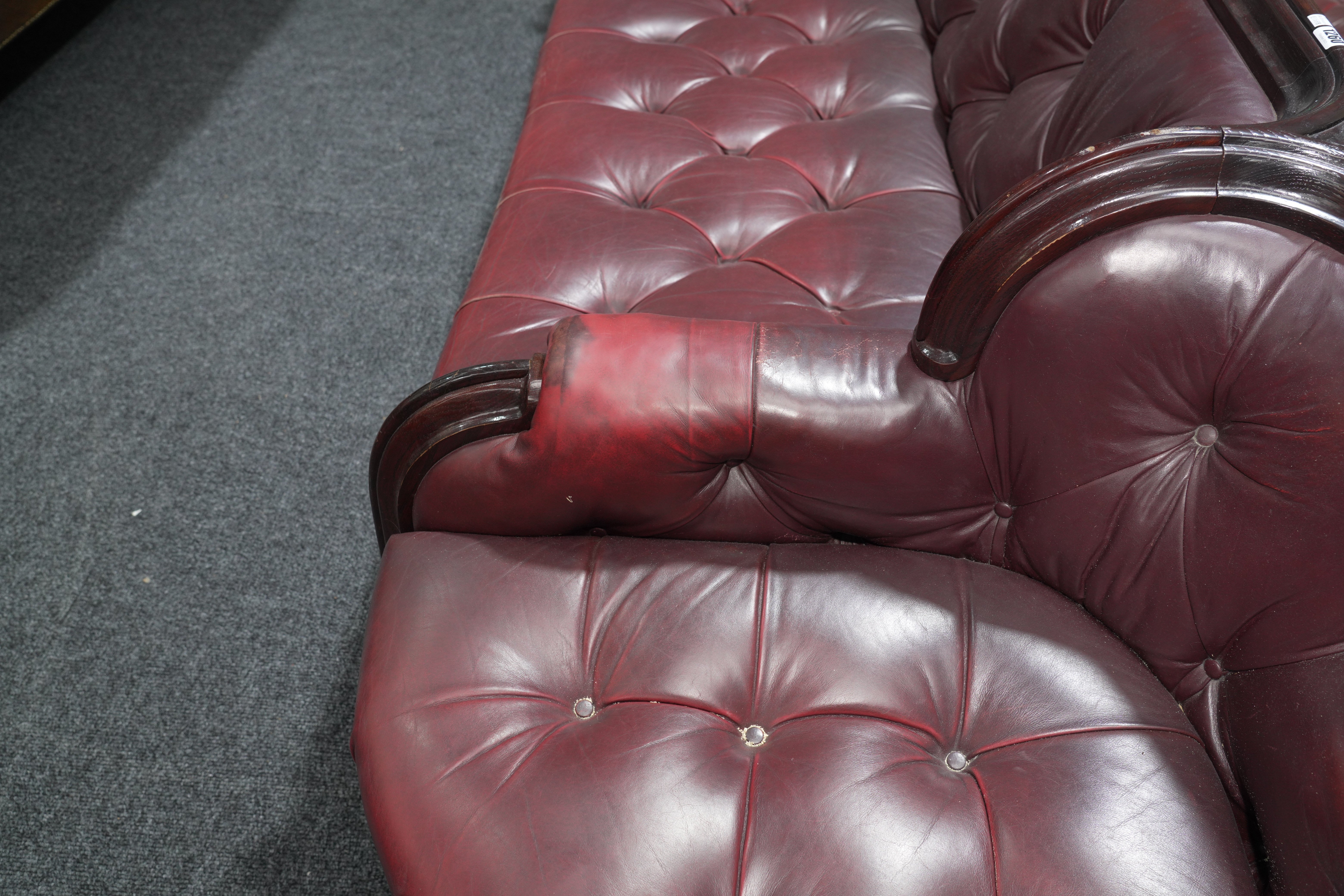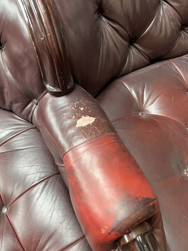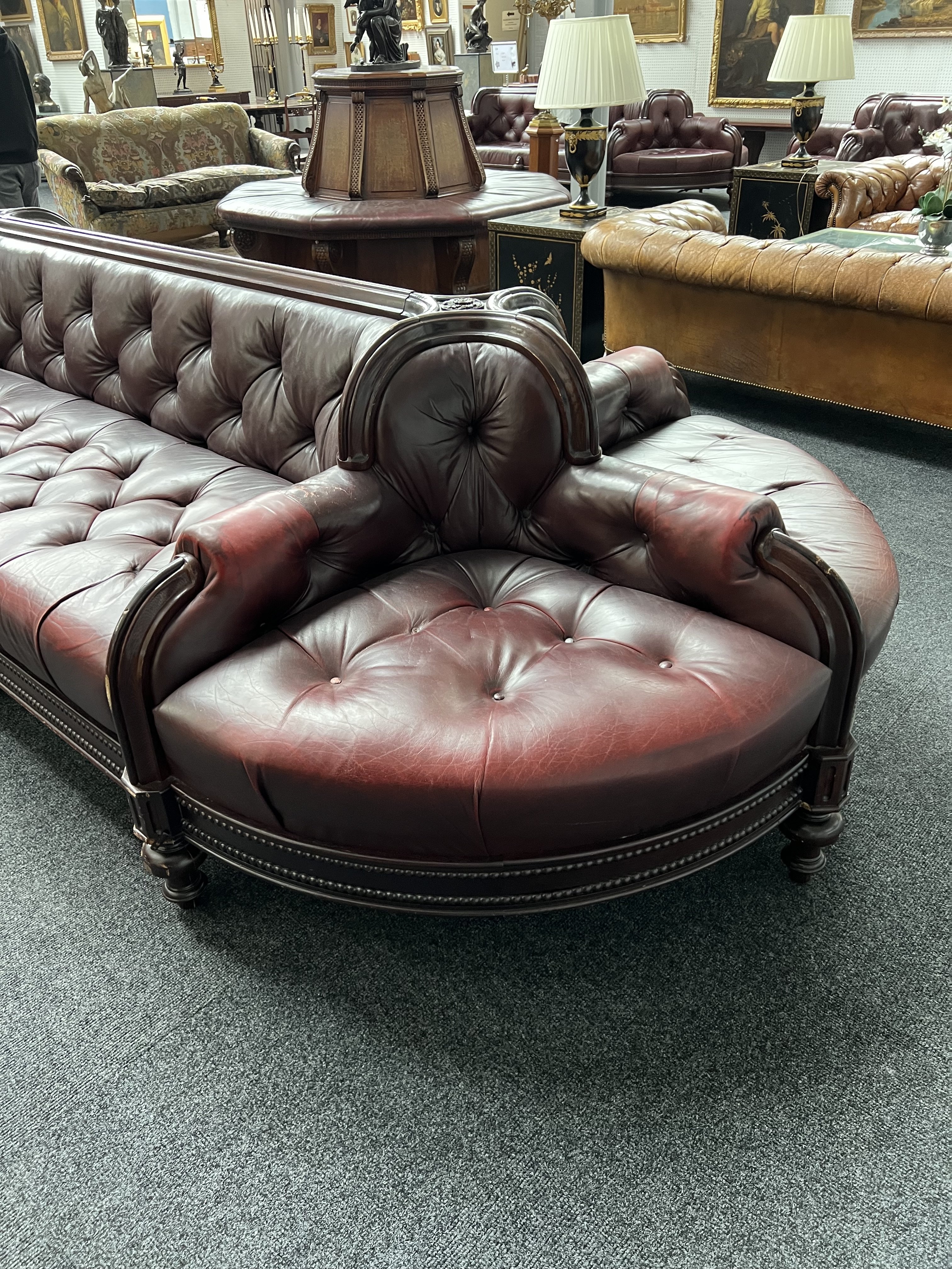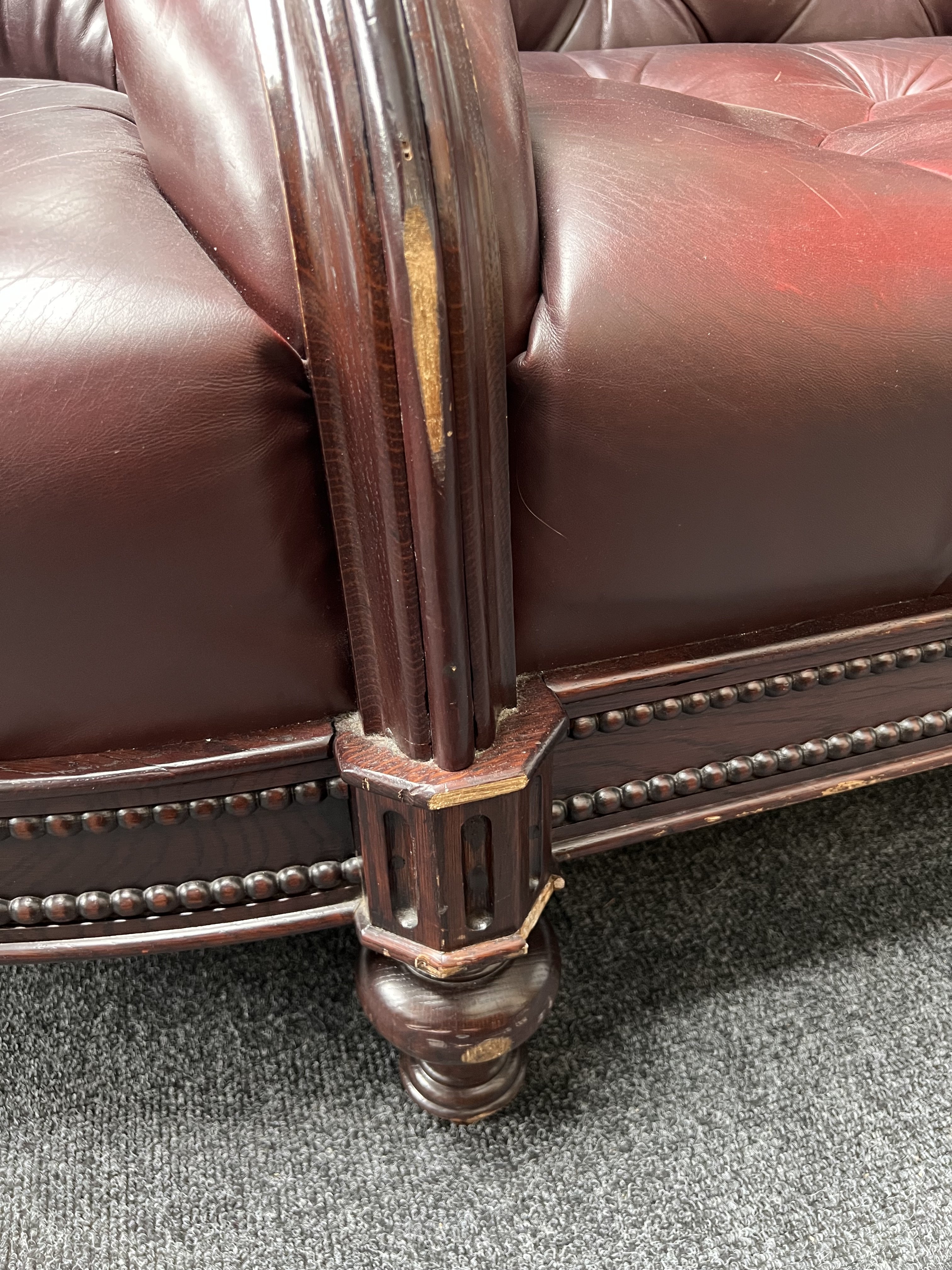 Condition Report: In structurally sound condition, there are no wobbles to the back or arms. There is some minor cracking and fading to the leather. The extreme edges have scuffs and marks consistent with public use. The leather would benefit from nourishing and the frames could do with a light repolish. There is some loss to the moulded edge to four of the eight legs. The leather is also discoloured primarily to the arm rests. Some buttons to the upholstery are lacking the leather covers and there are approximatley 10 additional buttons missing.