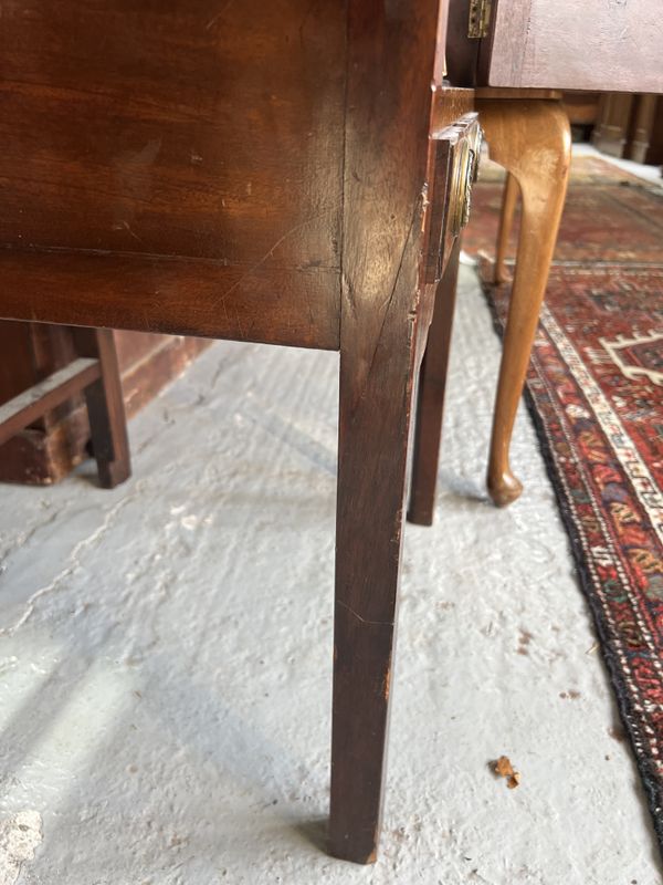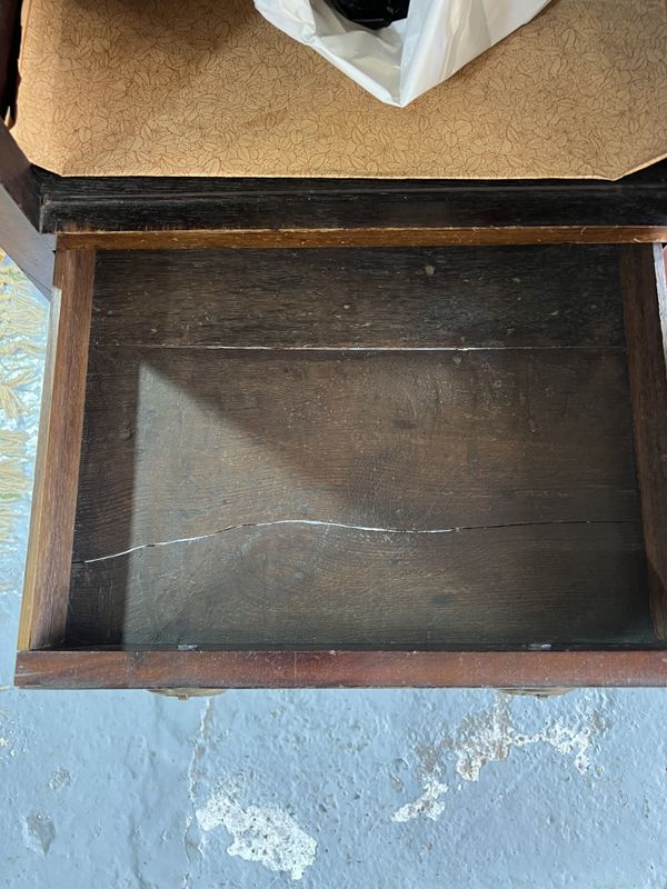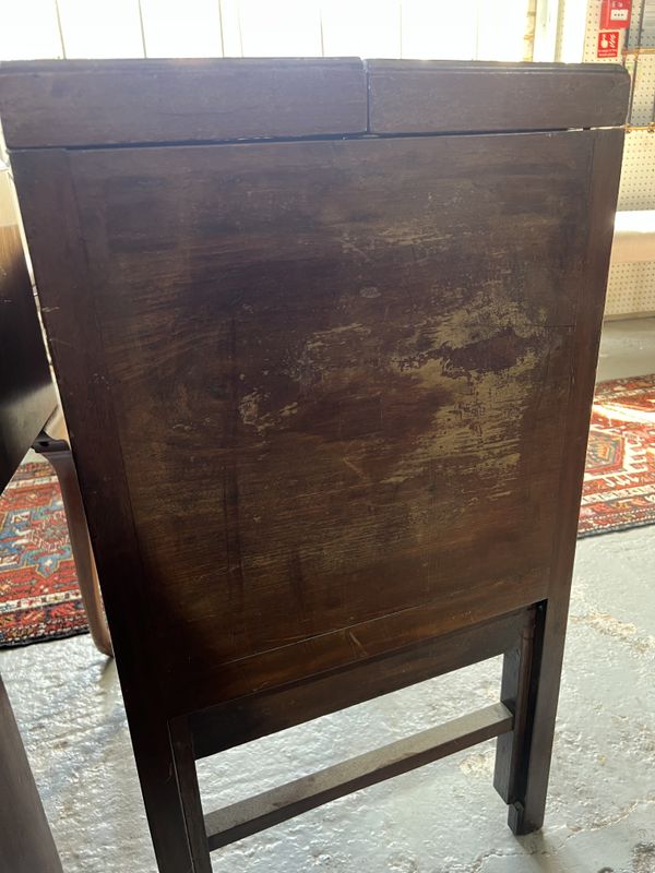 old marks and scratches present, ring marks and stains to the top, so could benefit from a polish and towards the back section, no traces of wood worm, fairly large scratch to left side with small chips along the edges of both front supports. interior fitted with original mirror,