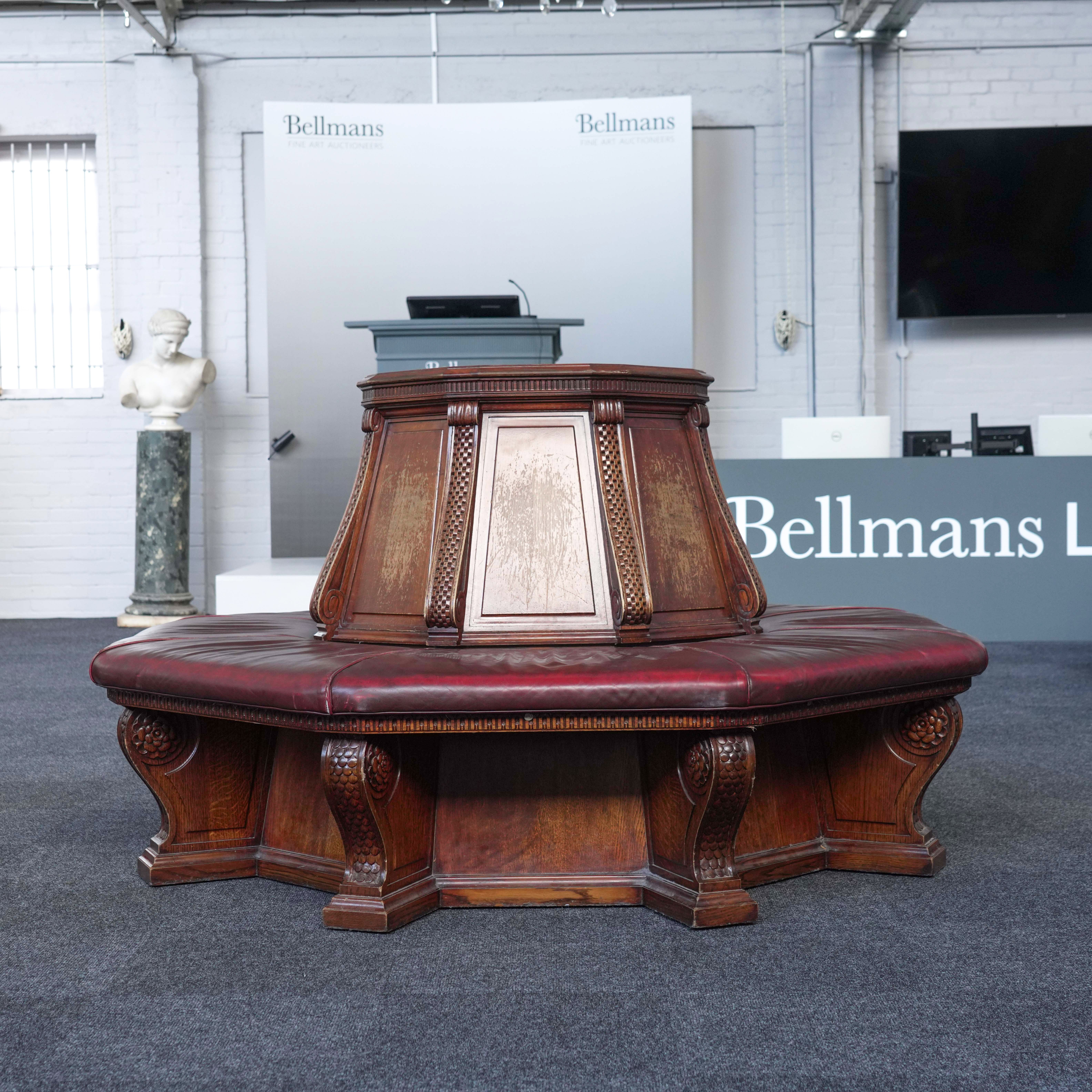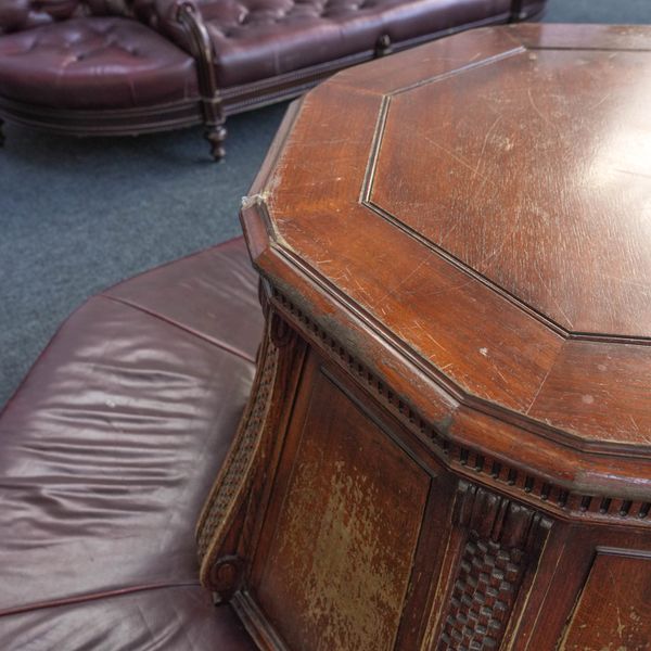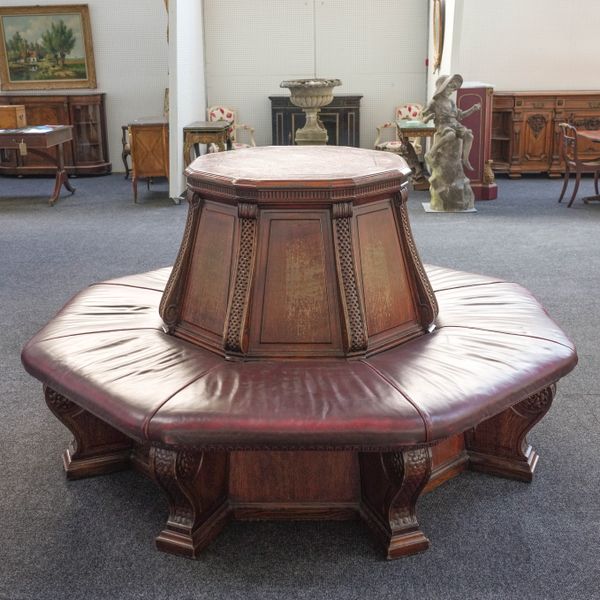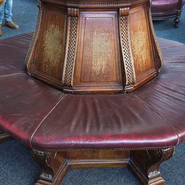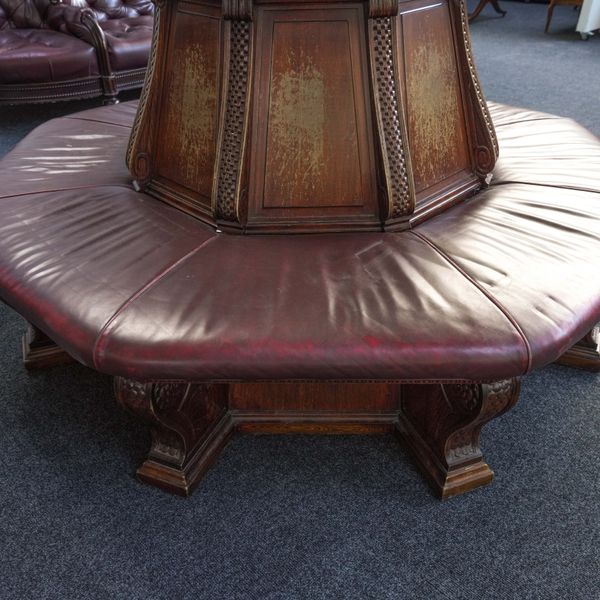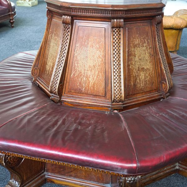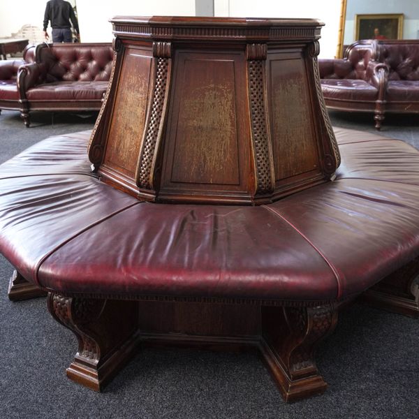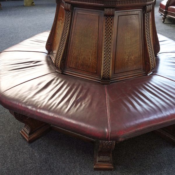 A LATE 20TH CENTURY OAK ROUGE LEATHER UPHOLSTERED OCTAGONAL GALLERY BENCH | FROM THE NATIONAL GALLERY, LONDON