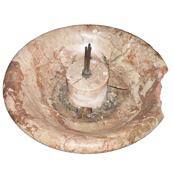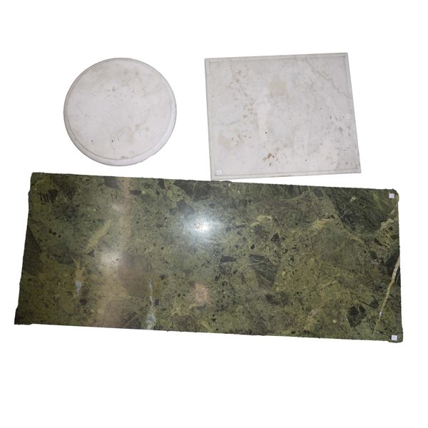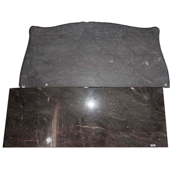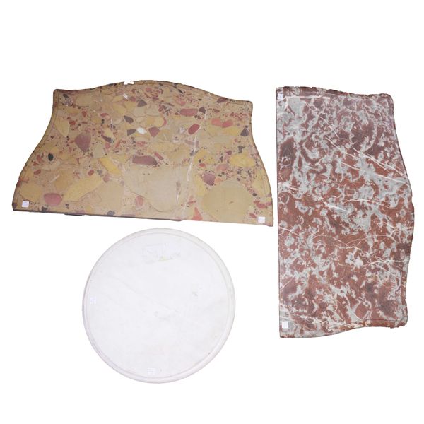 The largest grey serpentine top 136cm wide; 64cm deep, together with a pair of circular white marble tops, 42cm diameter, and a circular rouge marble water fountain, 74cm diameter