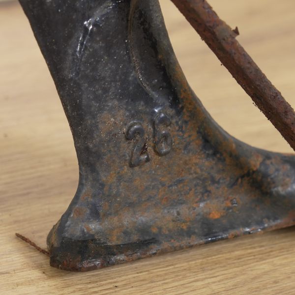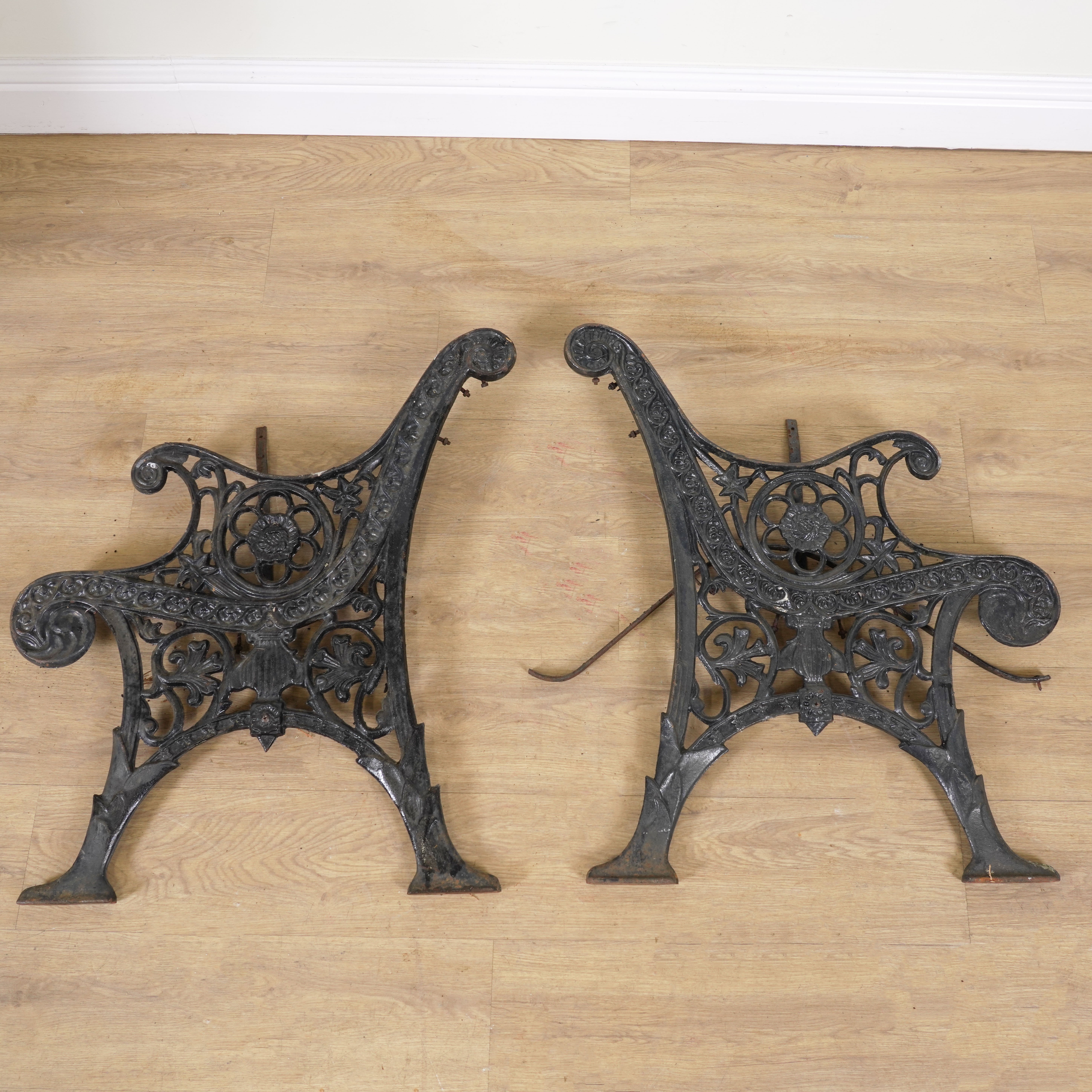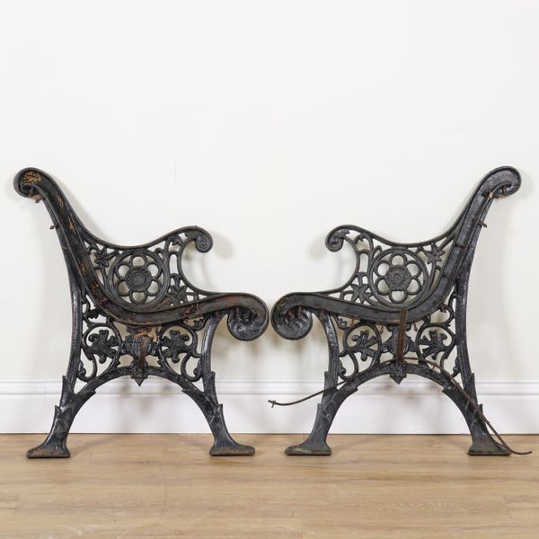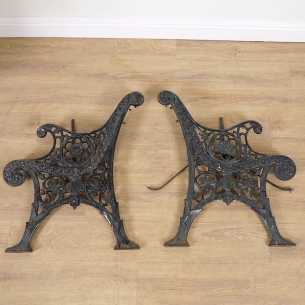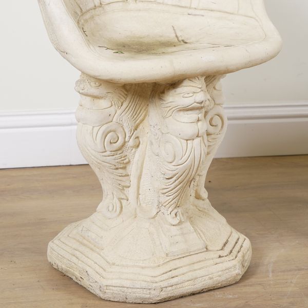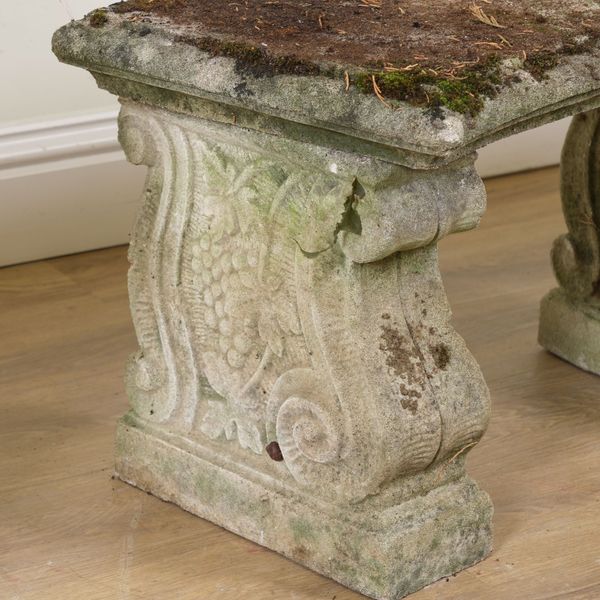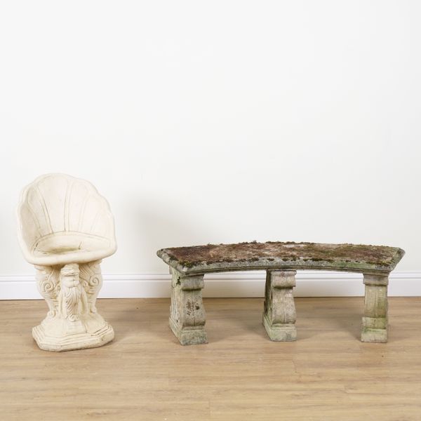 On three pedestal supports, 120cm wide; 40cm deep; 44cm high, a reconstituted stone shell backed chair, 50cm wide; 85cm high, and a pair of cast aluminium bench ends, 80cm high