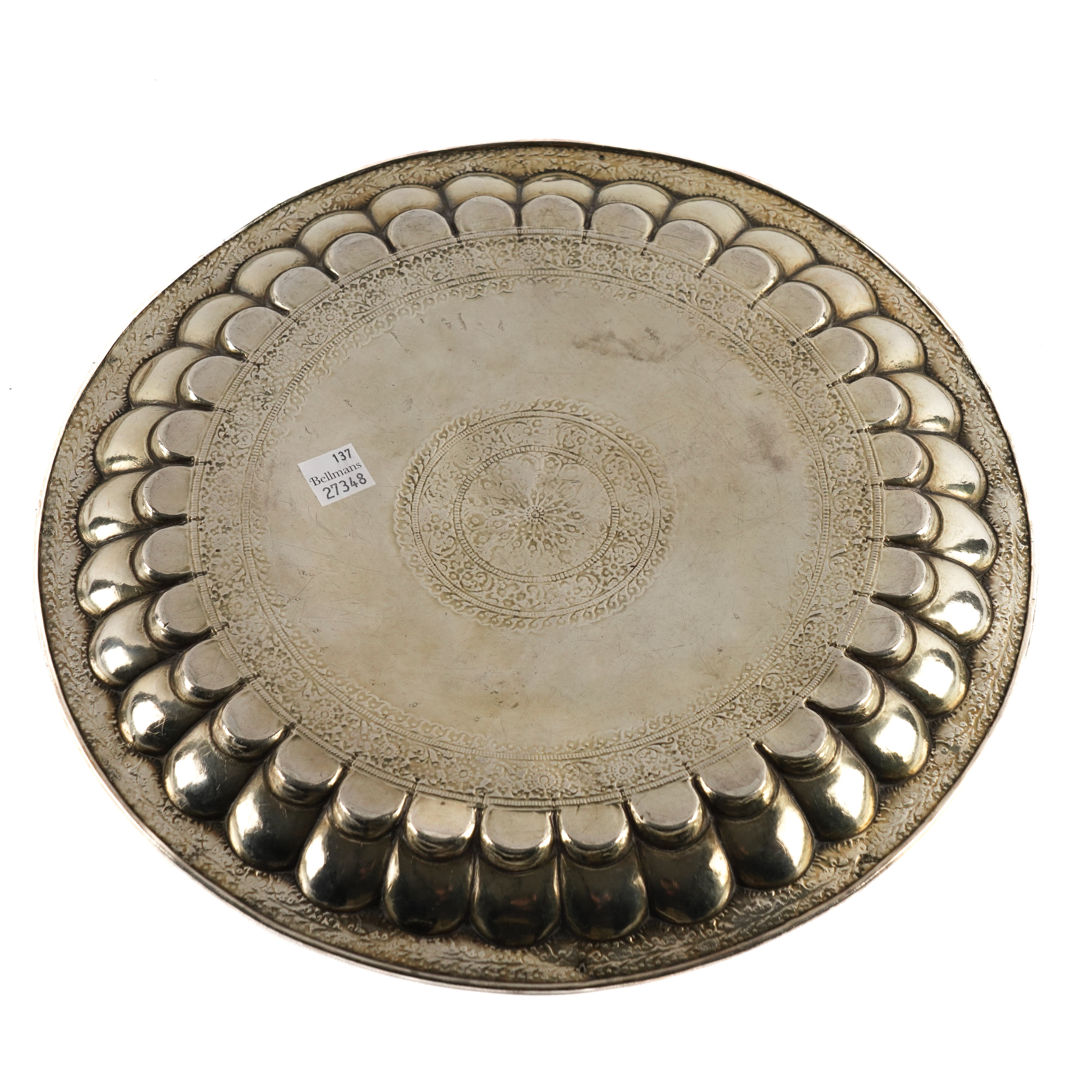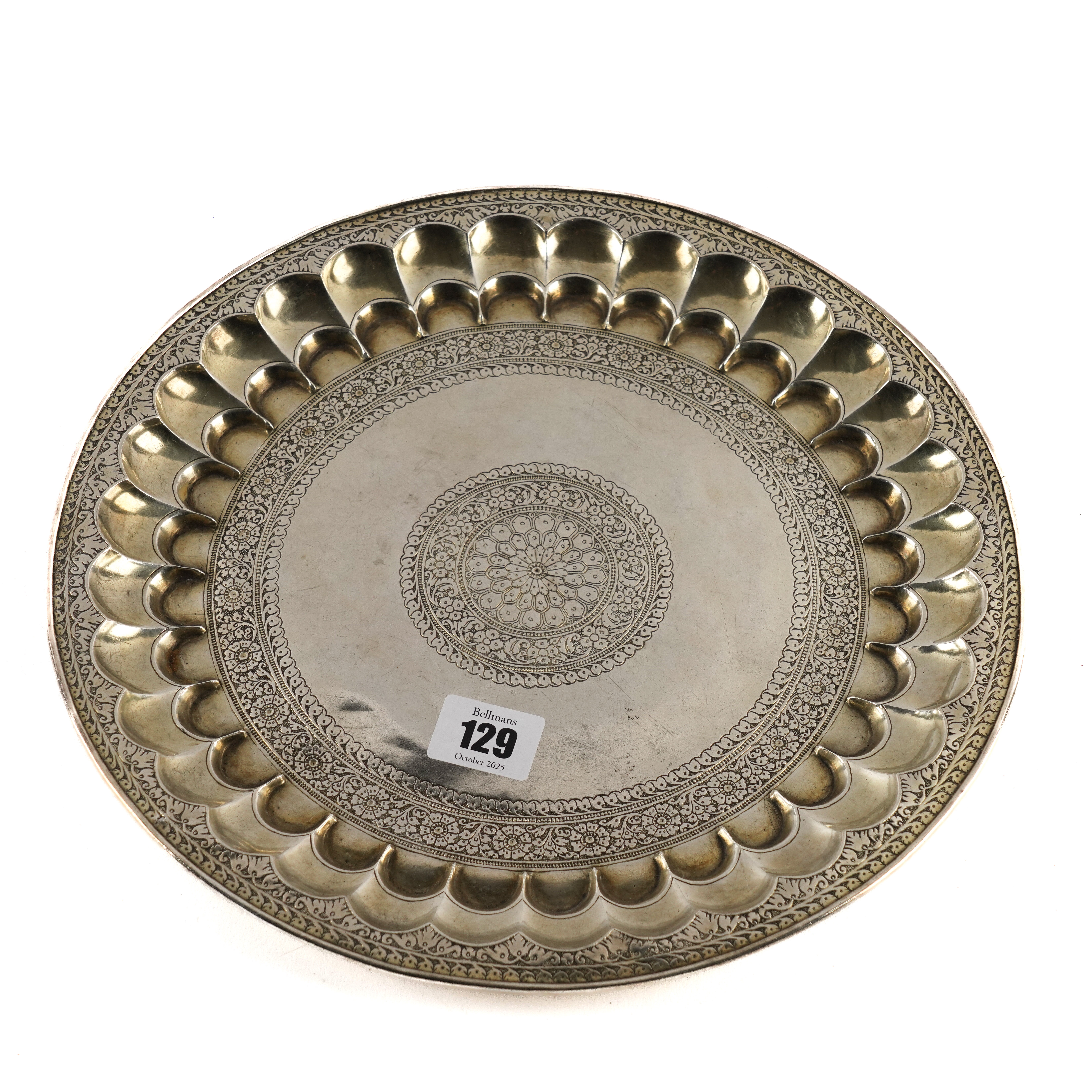 Decorated with lobed panels between engraved borders, unmarked, diameter 29.7cm, weight 513 grams