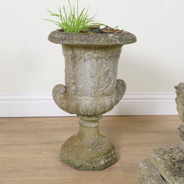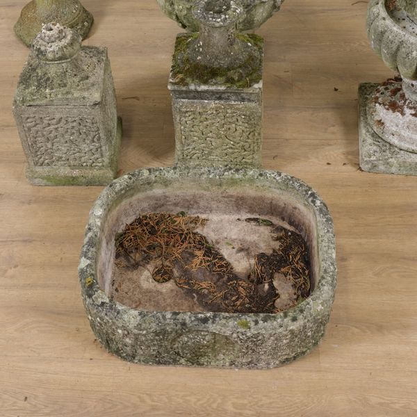 To include a bird bath, 37cm wide; 70cm high, a twin handled garden urn, 40cm diameter; 70cm high, an oval trough 50cm wide; 20cm high, and sundry