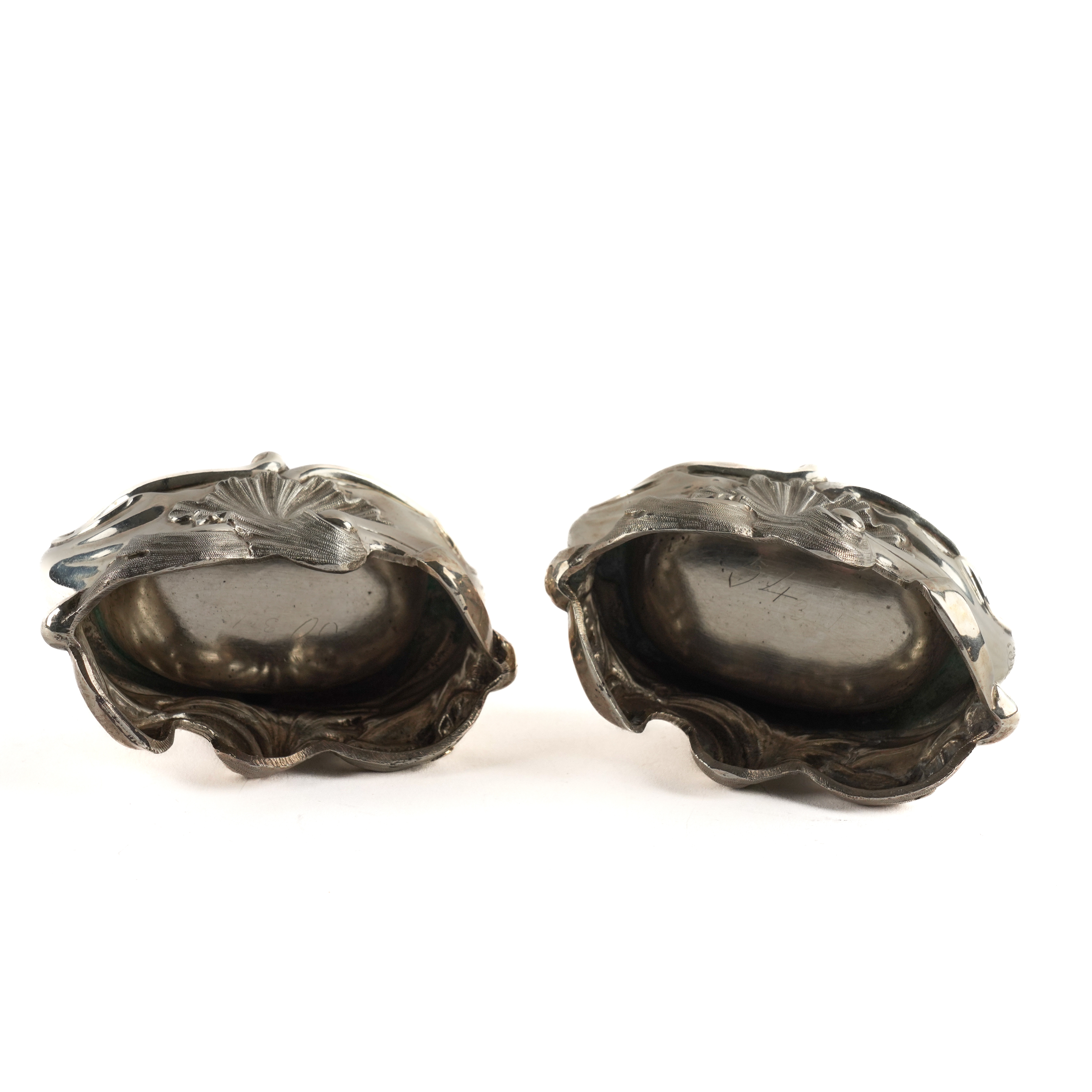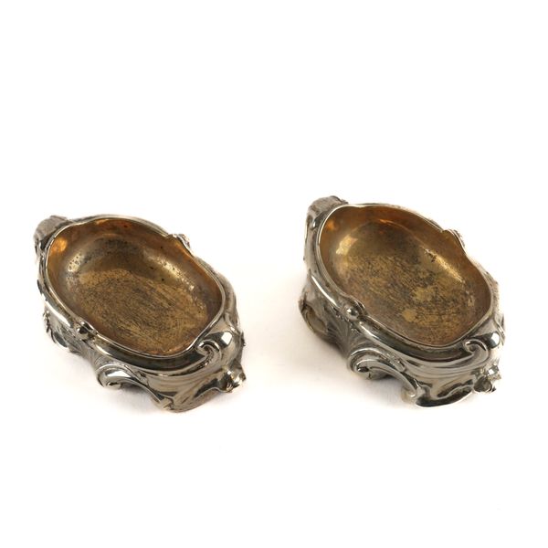 The maker's marks are a little indistinct, otherwise there is some wear to the hallmarks, on one salt, rather more than the other. The gilding to both is rather scratched and stained, the monograms are engraved at one end of each salt, there is green corrosion inside the underneath of the salts, hard to get to, to clean away, otherwise in fairly good condition