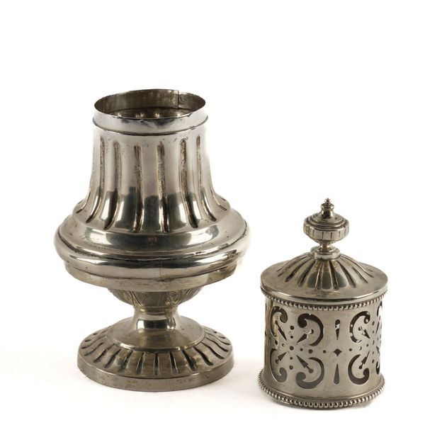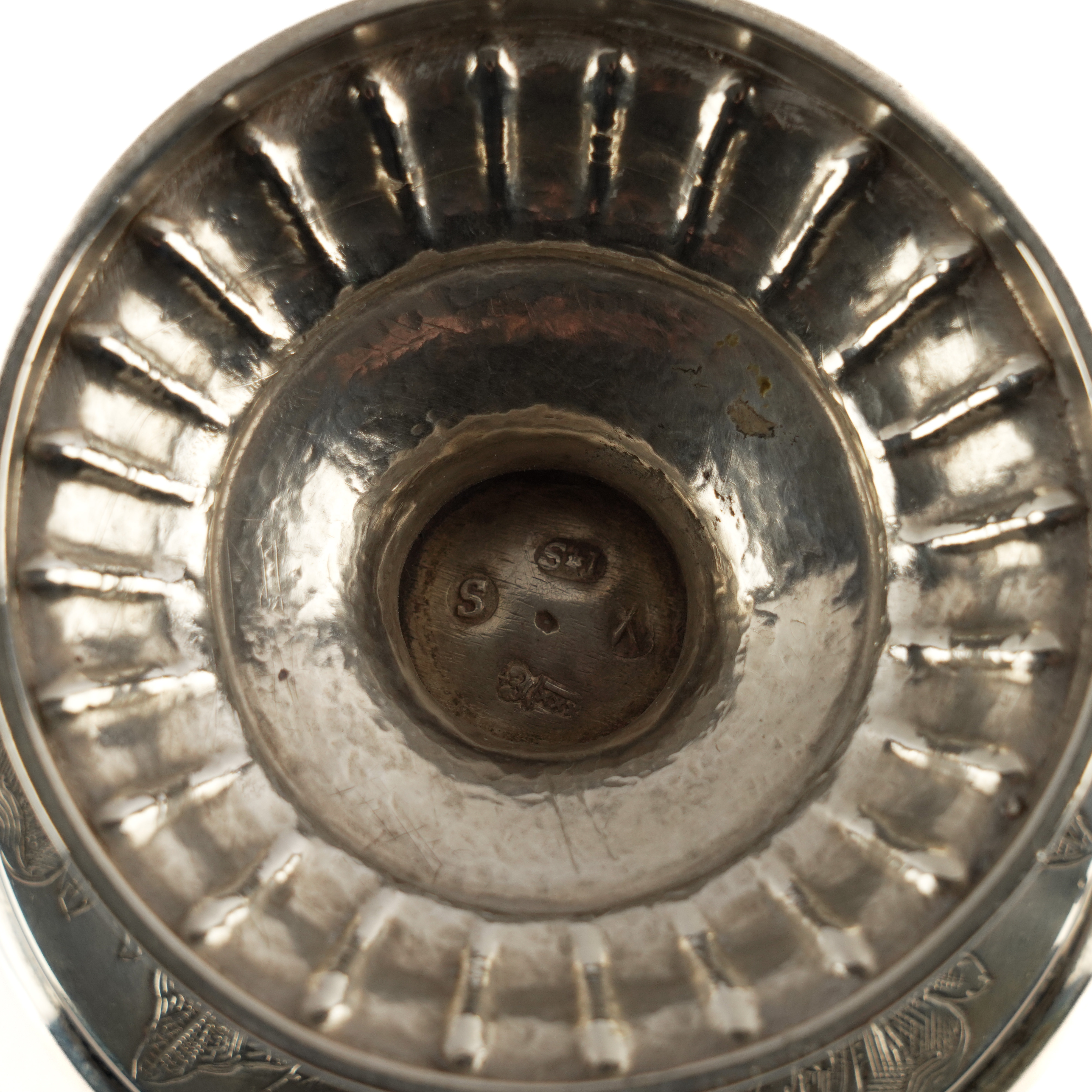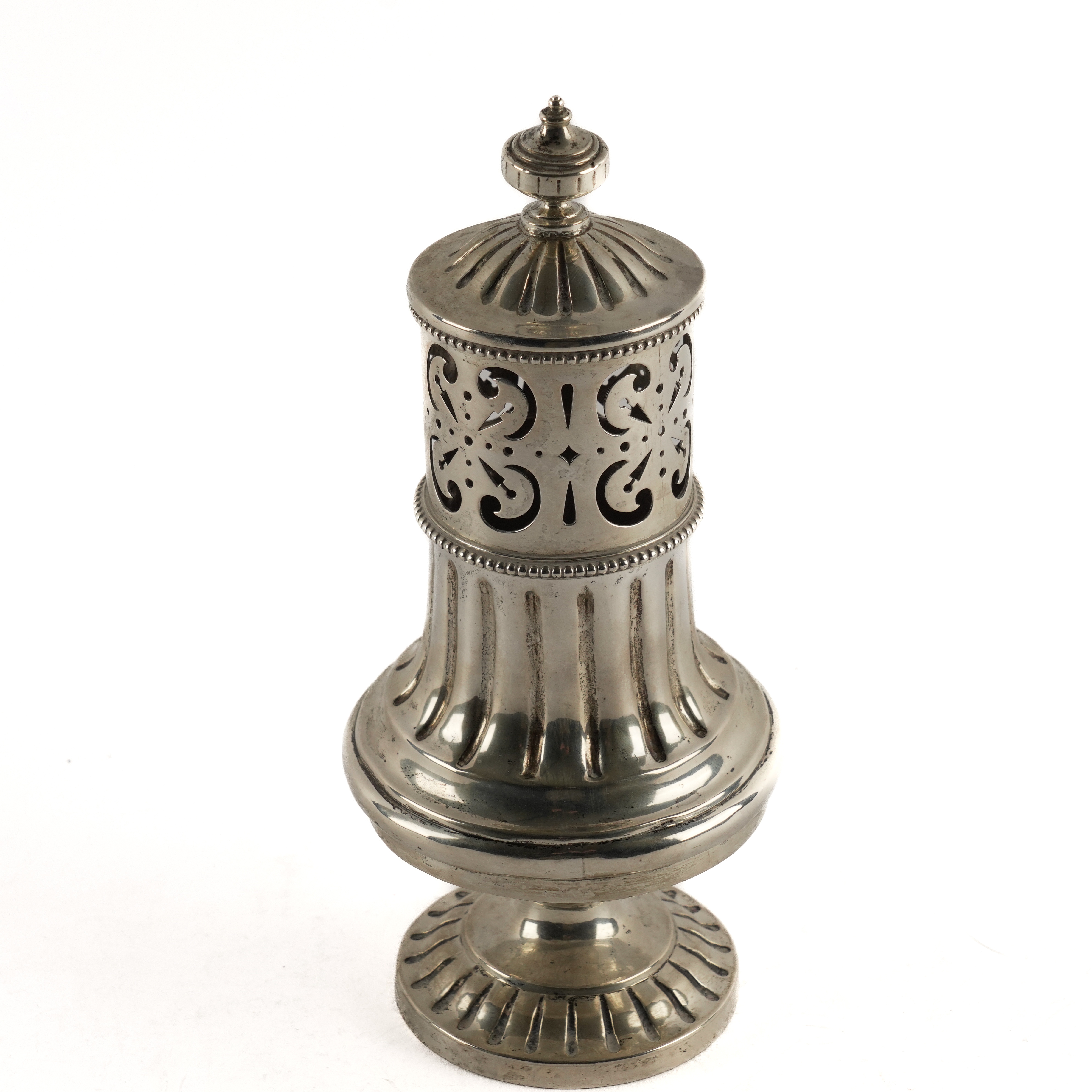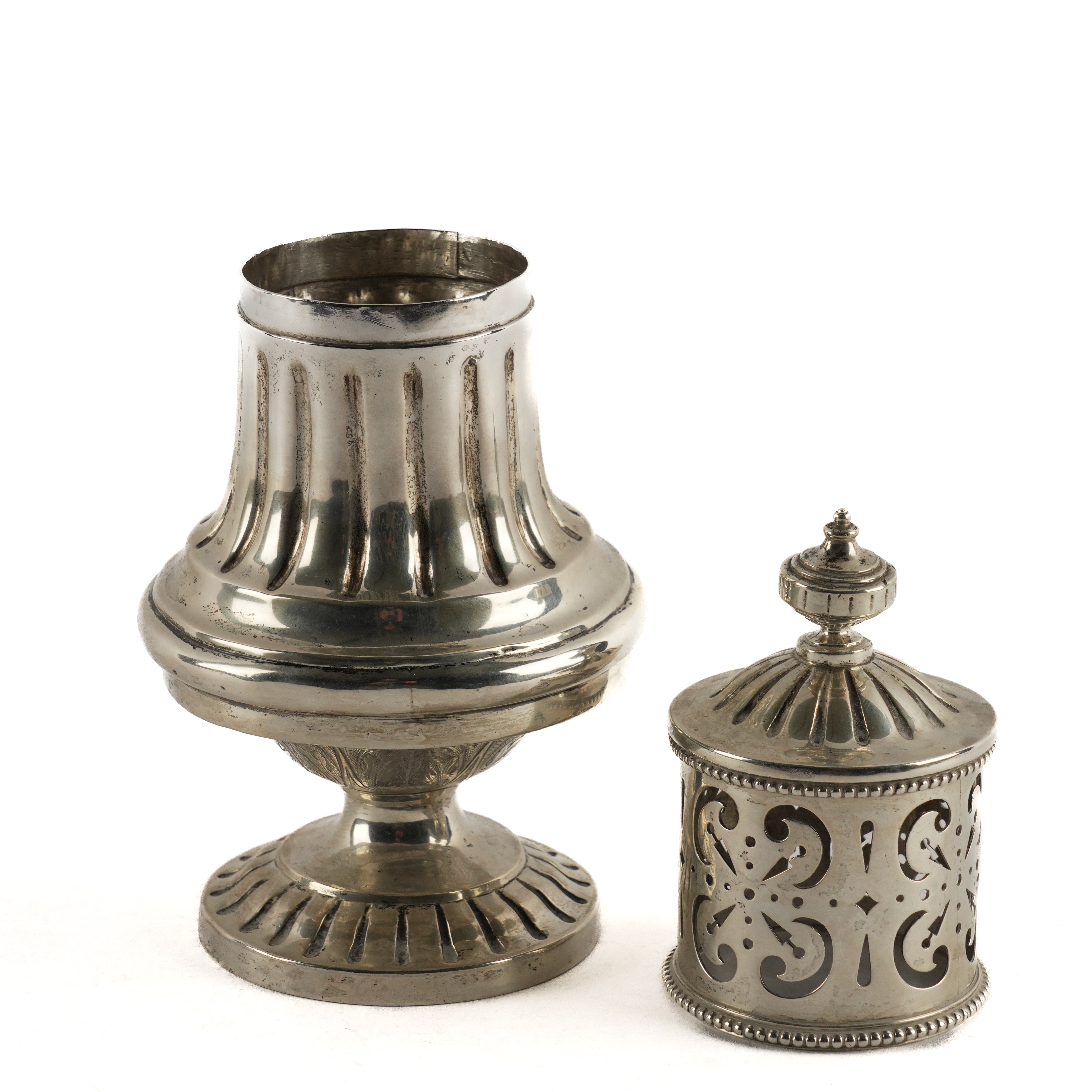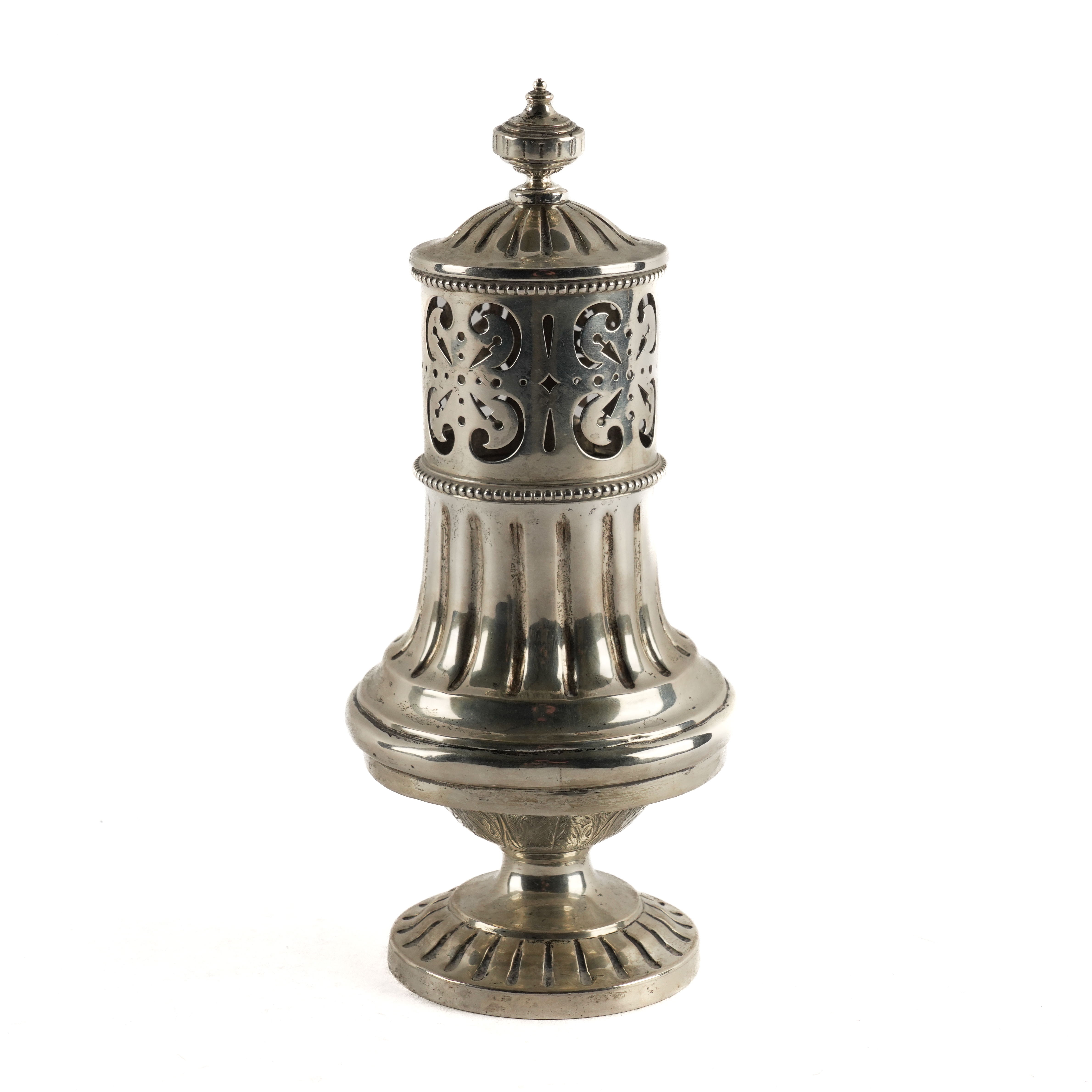 The body with fluted decoration above foliate scroll engraved decoration, raised on a circular foot, height 24cm, weight 521 grams