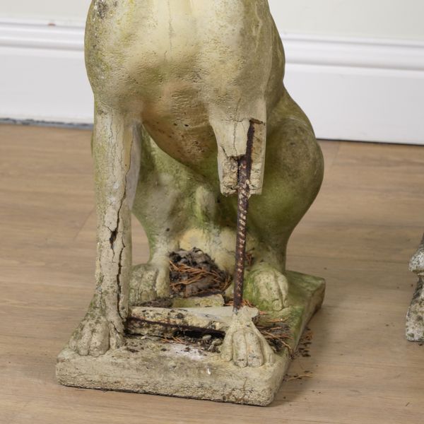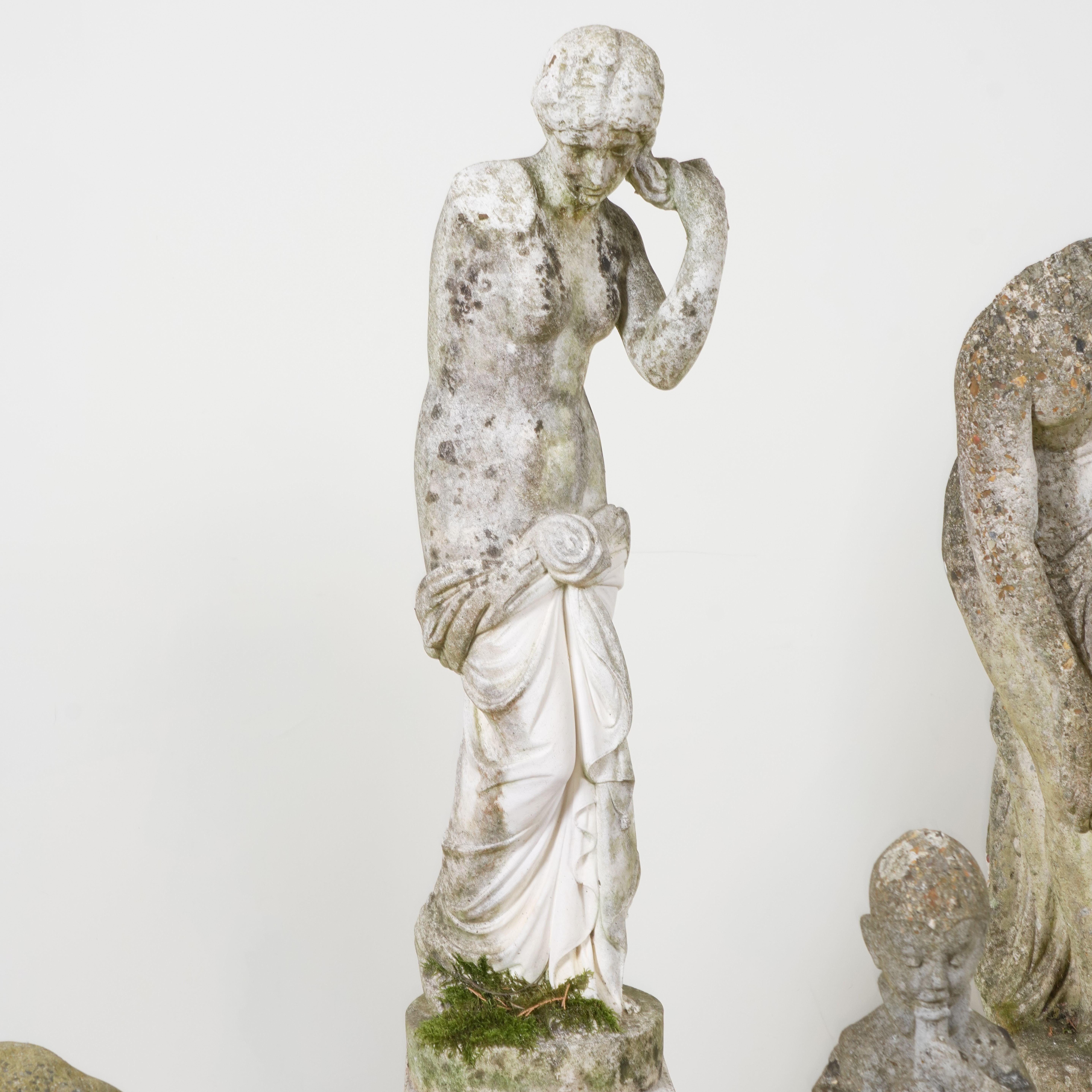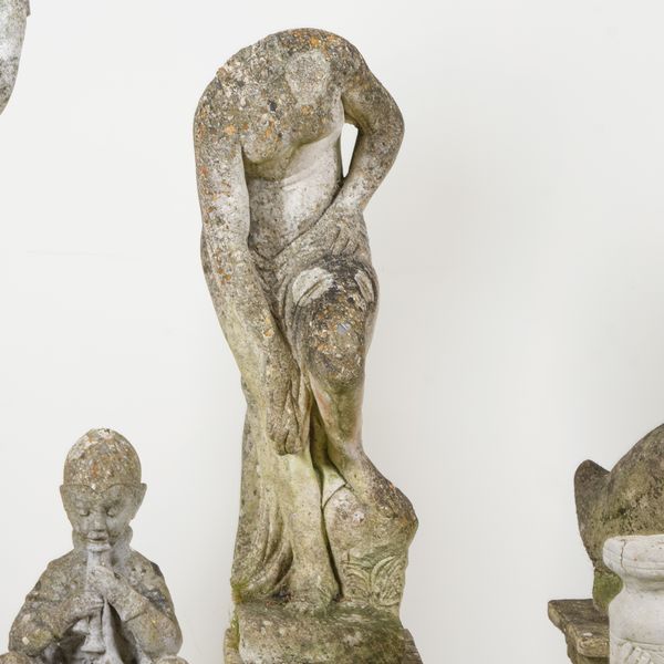 To include a pair of dogs, 71cm high, three square pedestals, 22cm wide; 55cm high, two female figures, 83cm high, and sundry