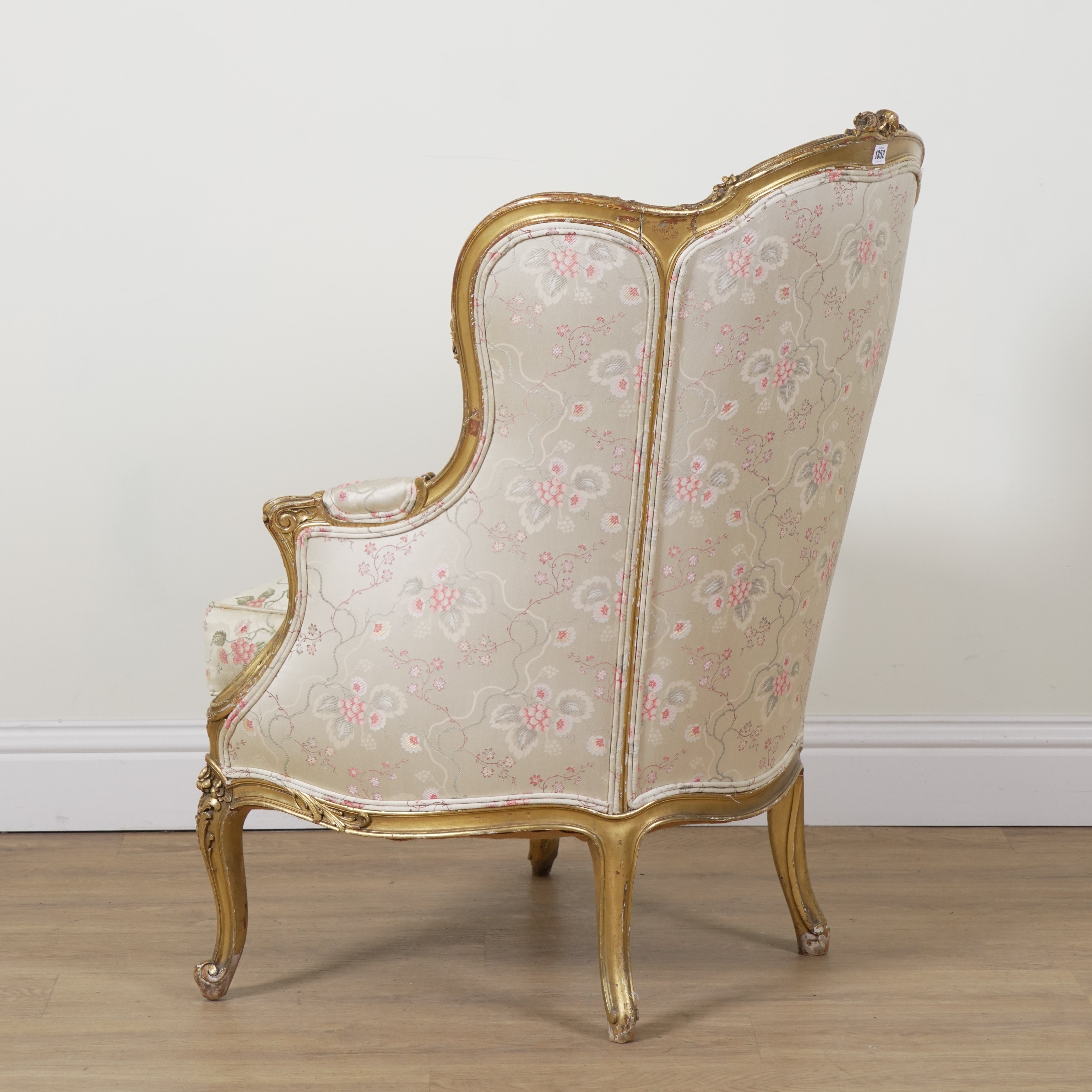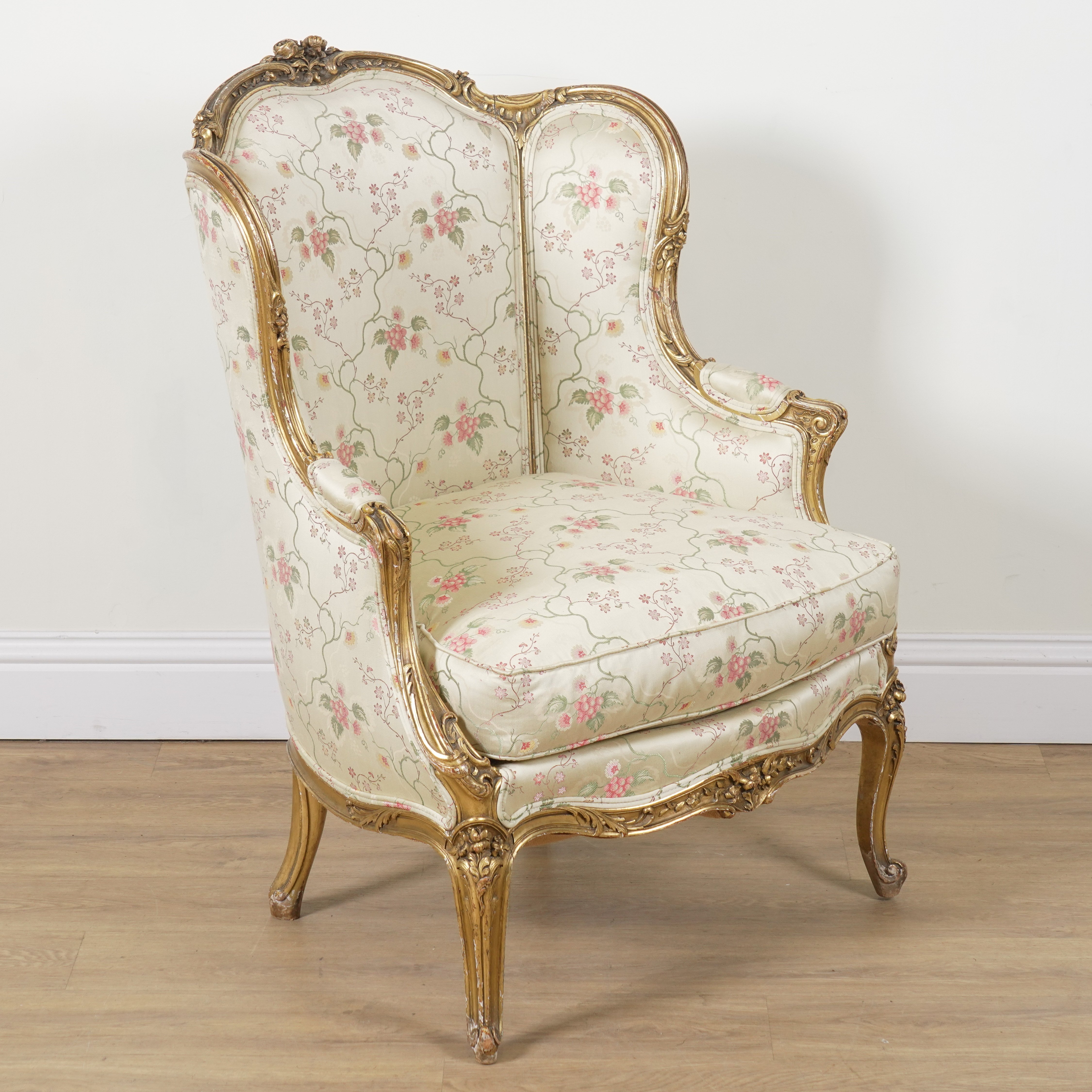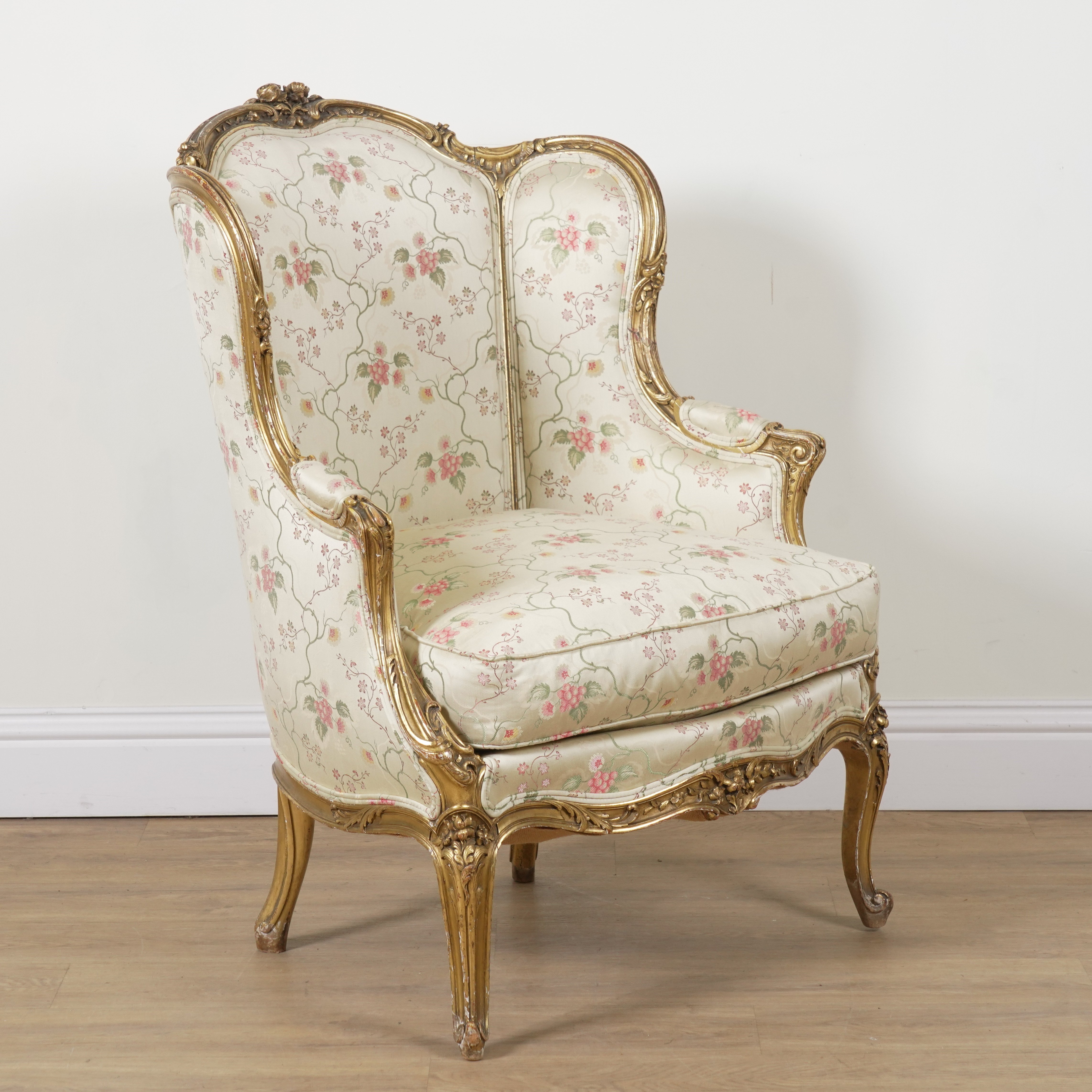 A LOUIS XV STYLE GILT FRAMED WINGBACK ARMCHAIR