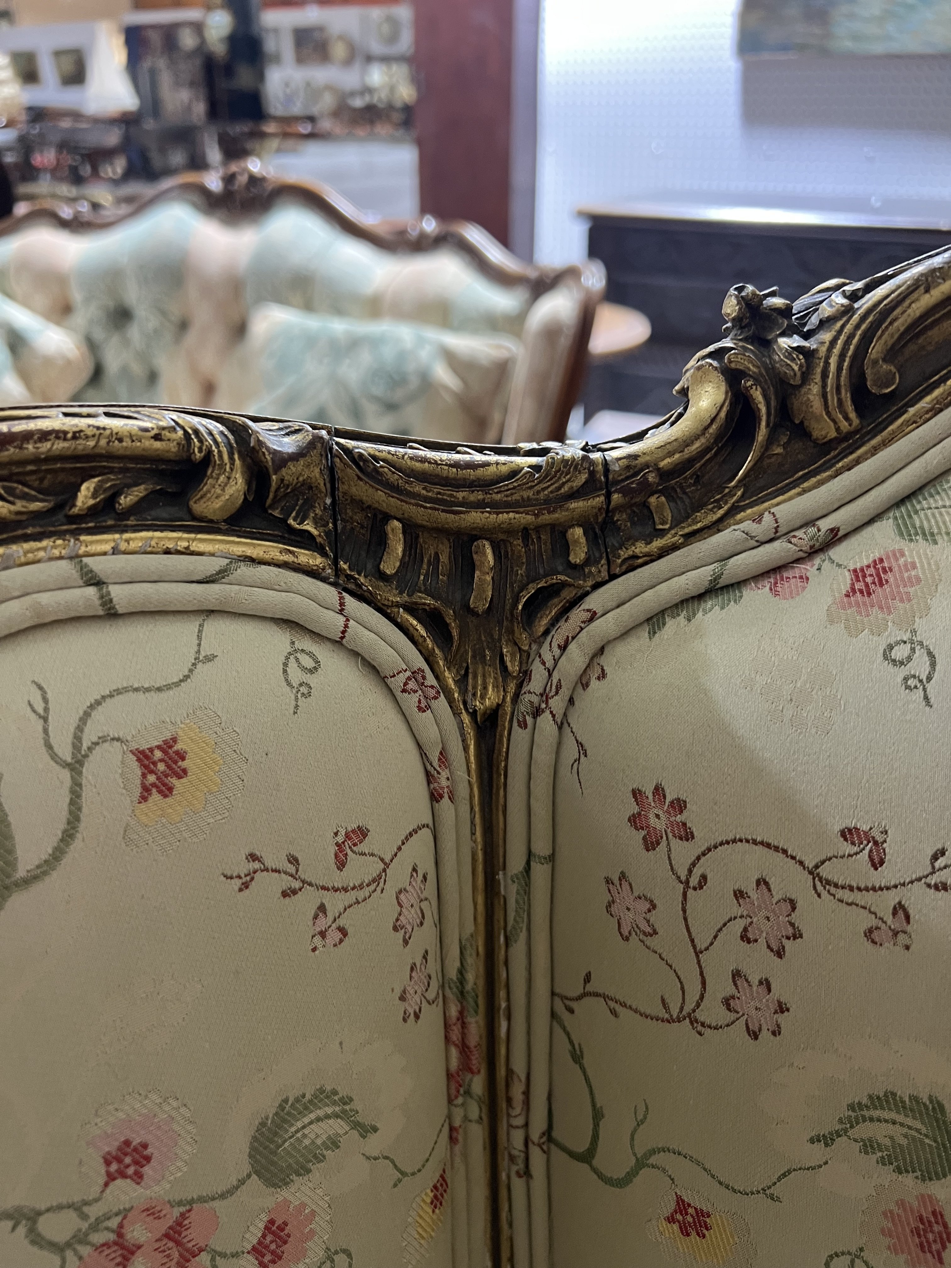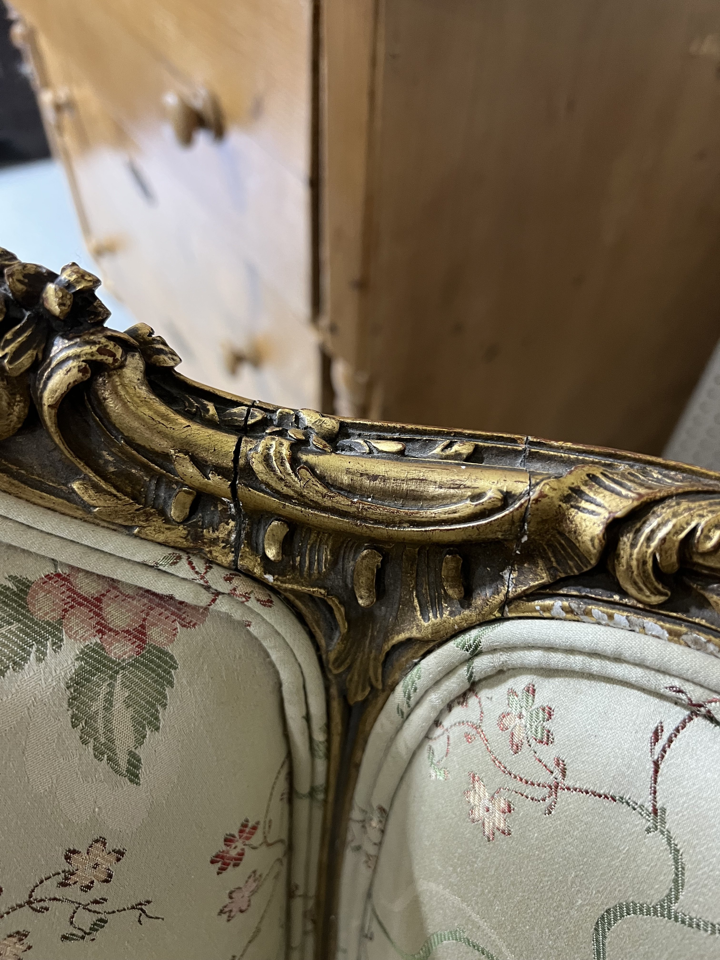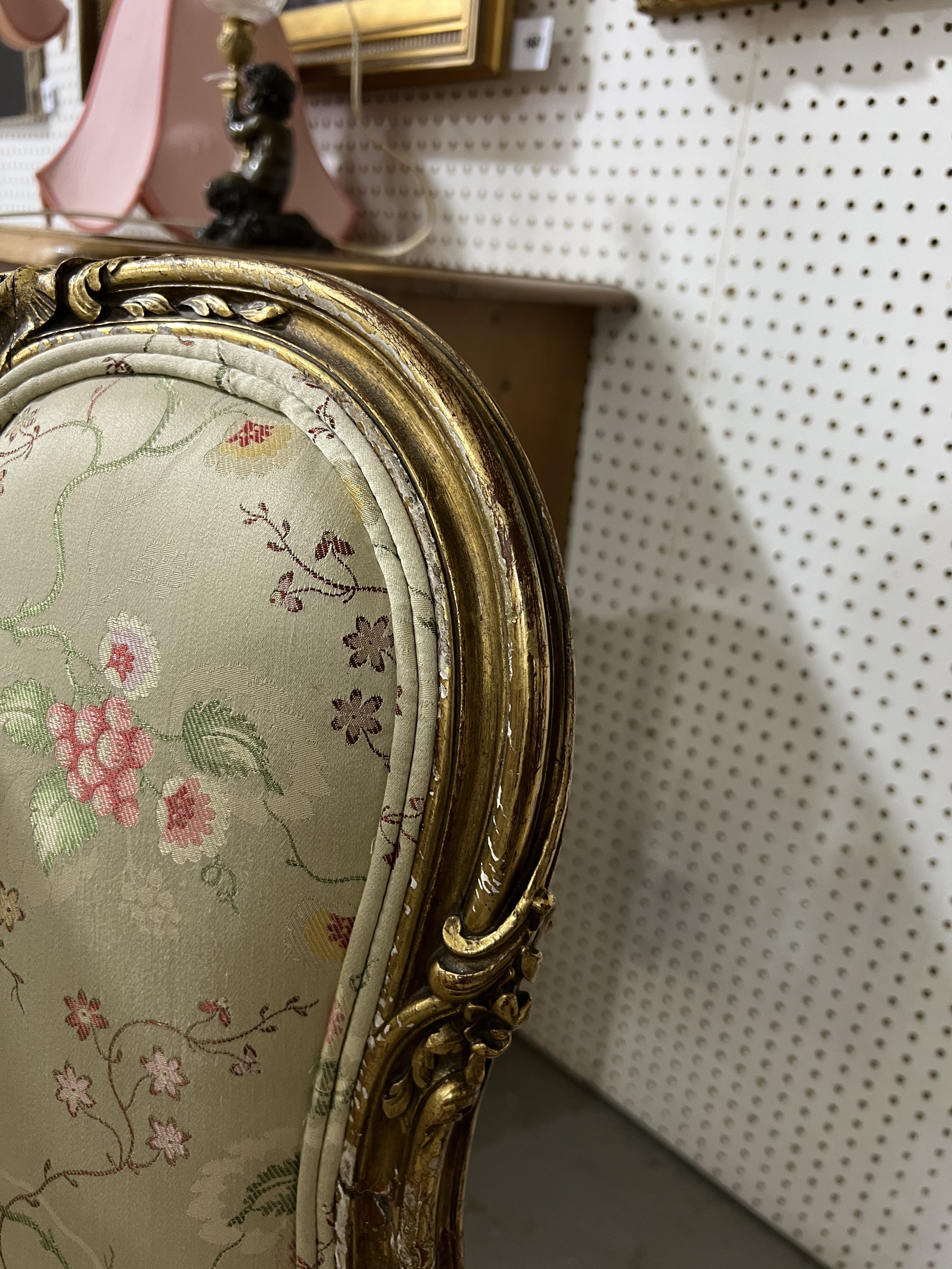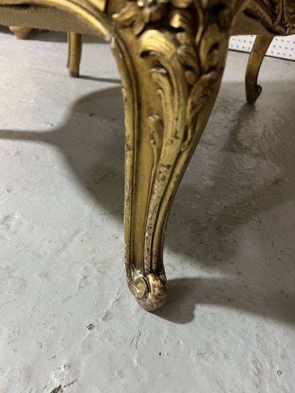 old marks and scratches present with looses to the gilt around the frame, joins to the back rest starting to separate, upholstery in good clean condition, see images.