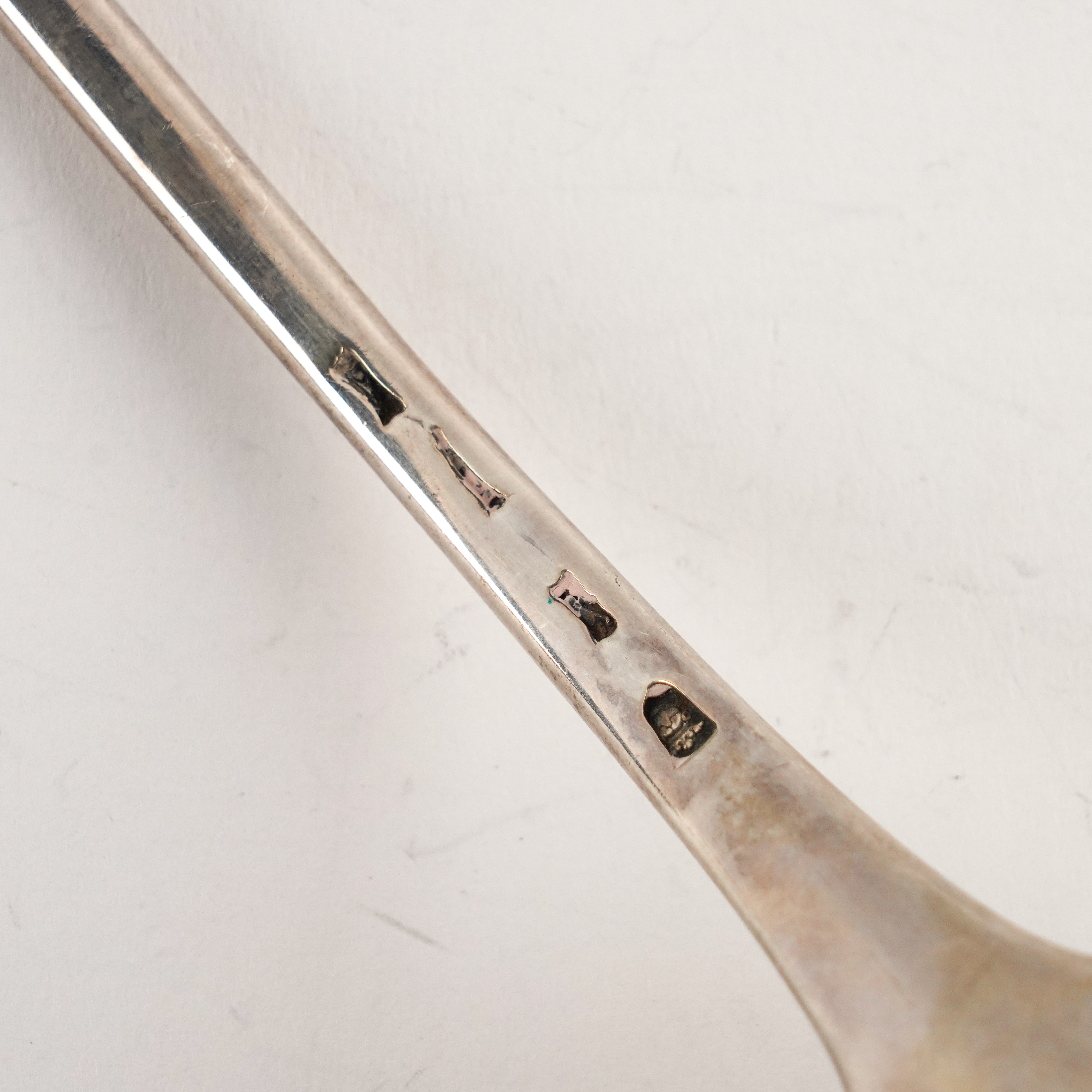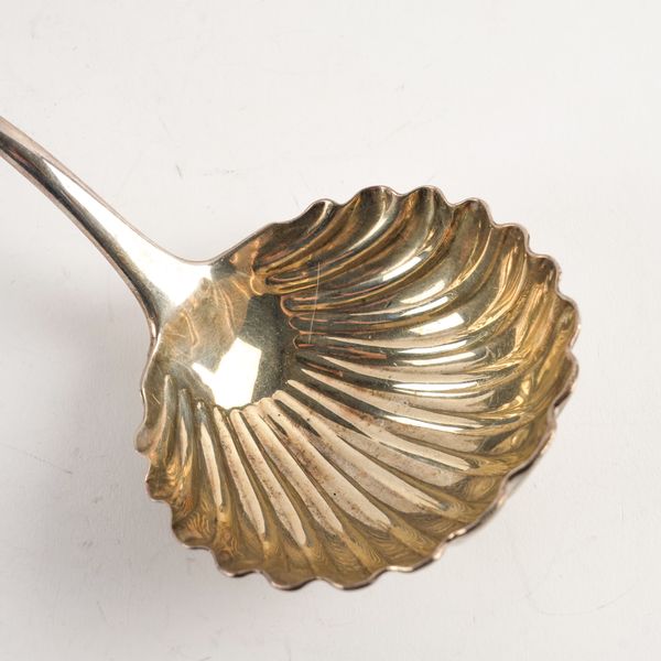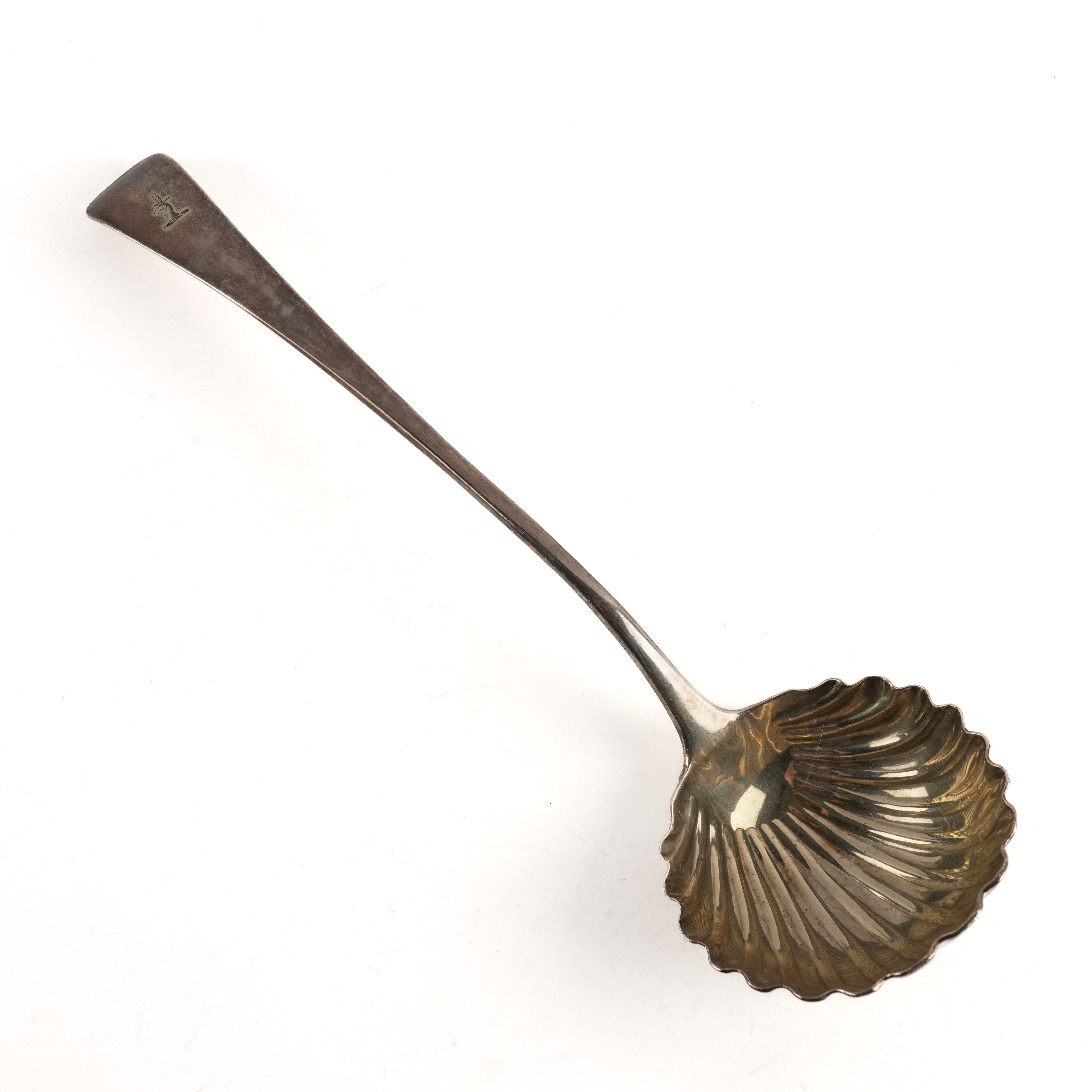 Bottom marked, having a scallop shell form bowl, crest engraved, hallmark indistinct, late 18th century, weight 230 grams