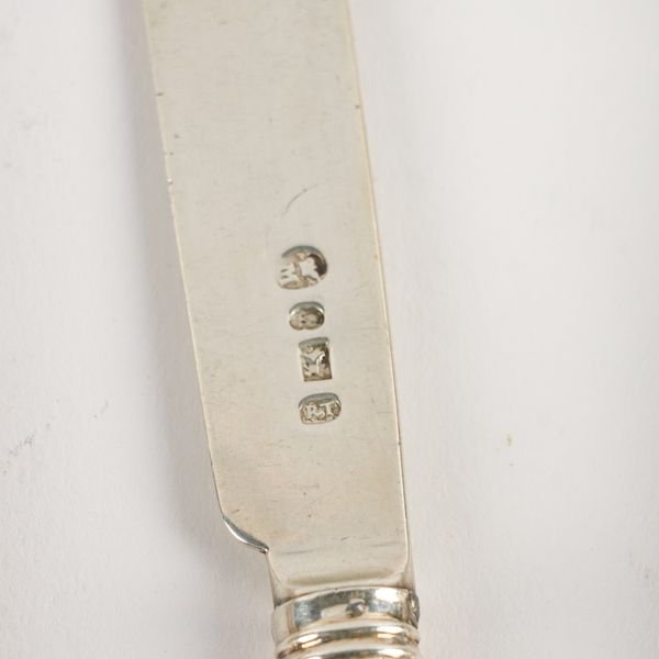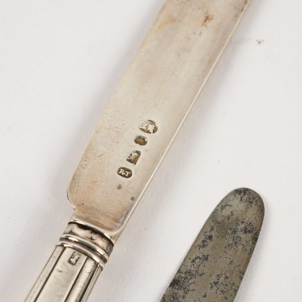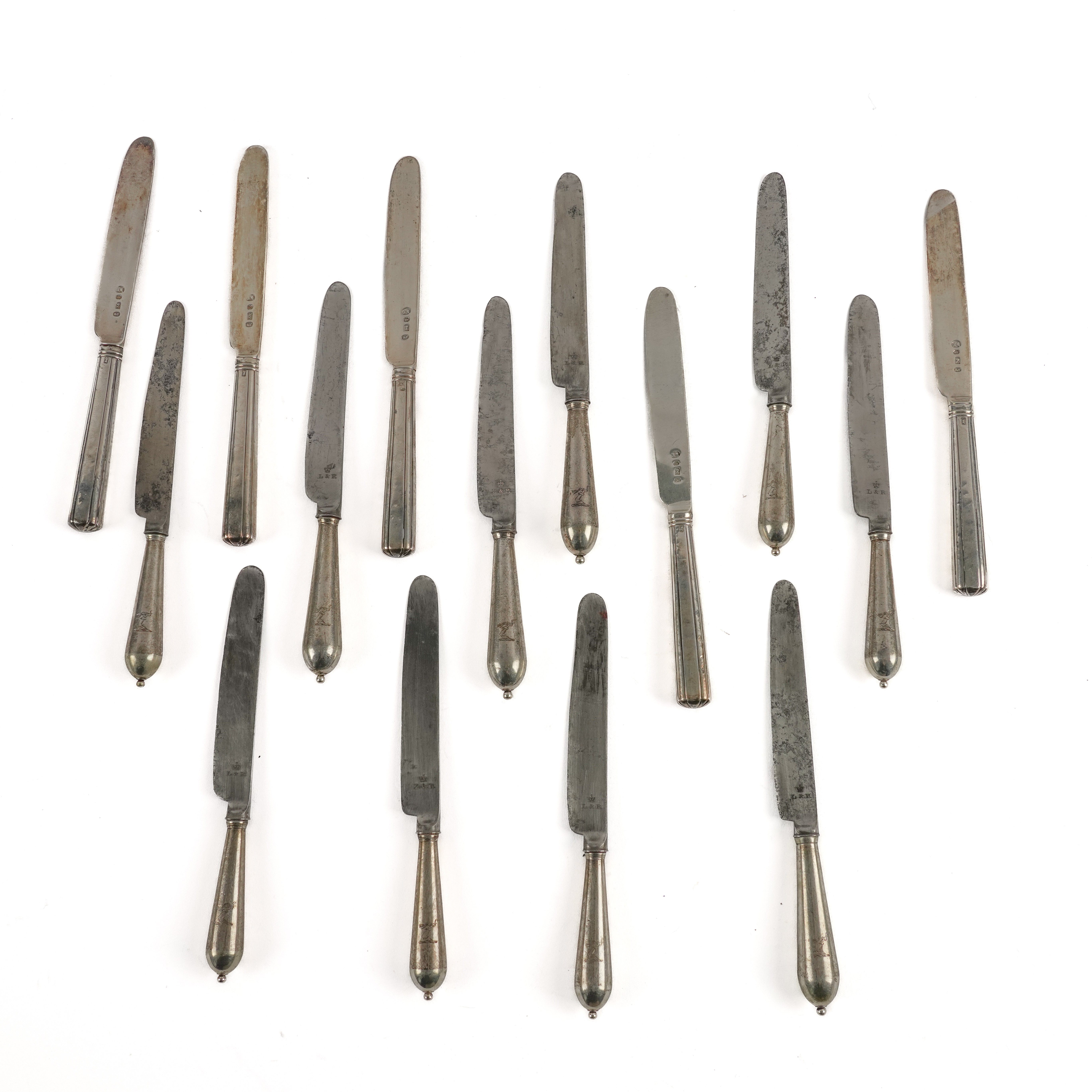 Comprising; five silver bladed dessert knives having loaded silver handles, Sheffield 1802 and ten steel bladed knives, the blades detailed L&R, the canon barrel form handles crest engraved