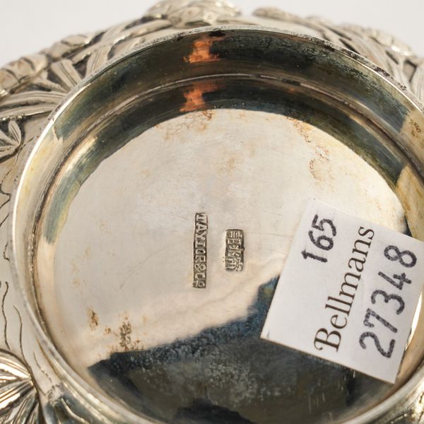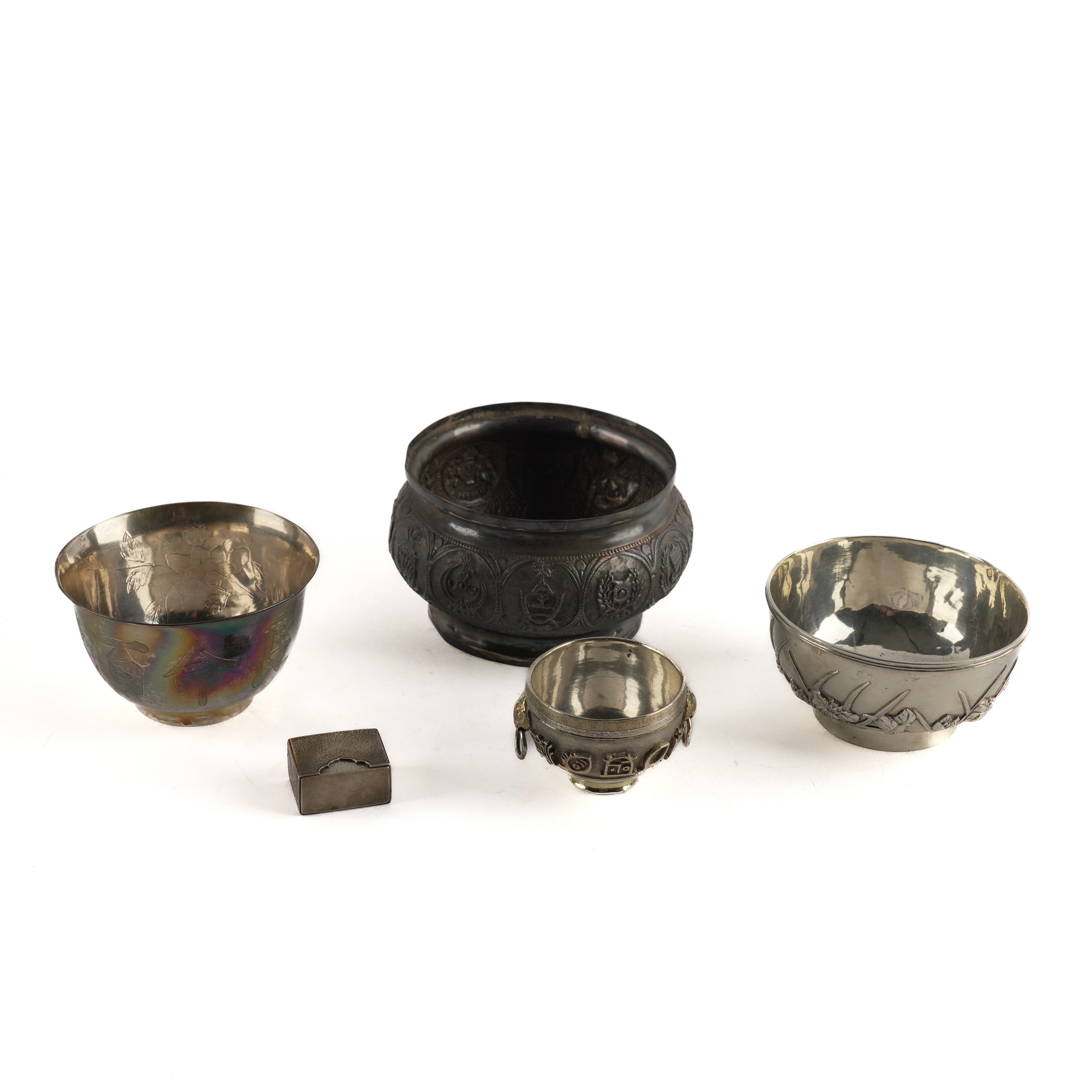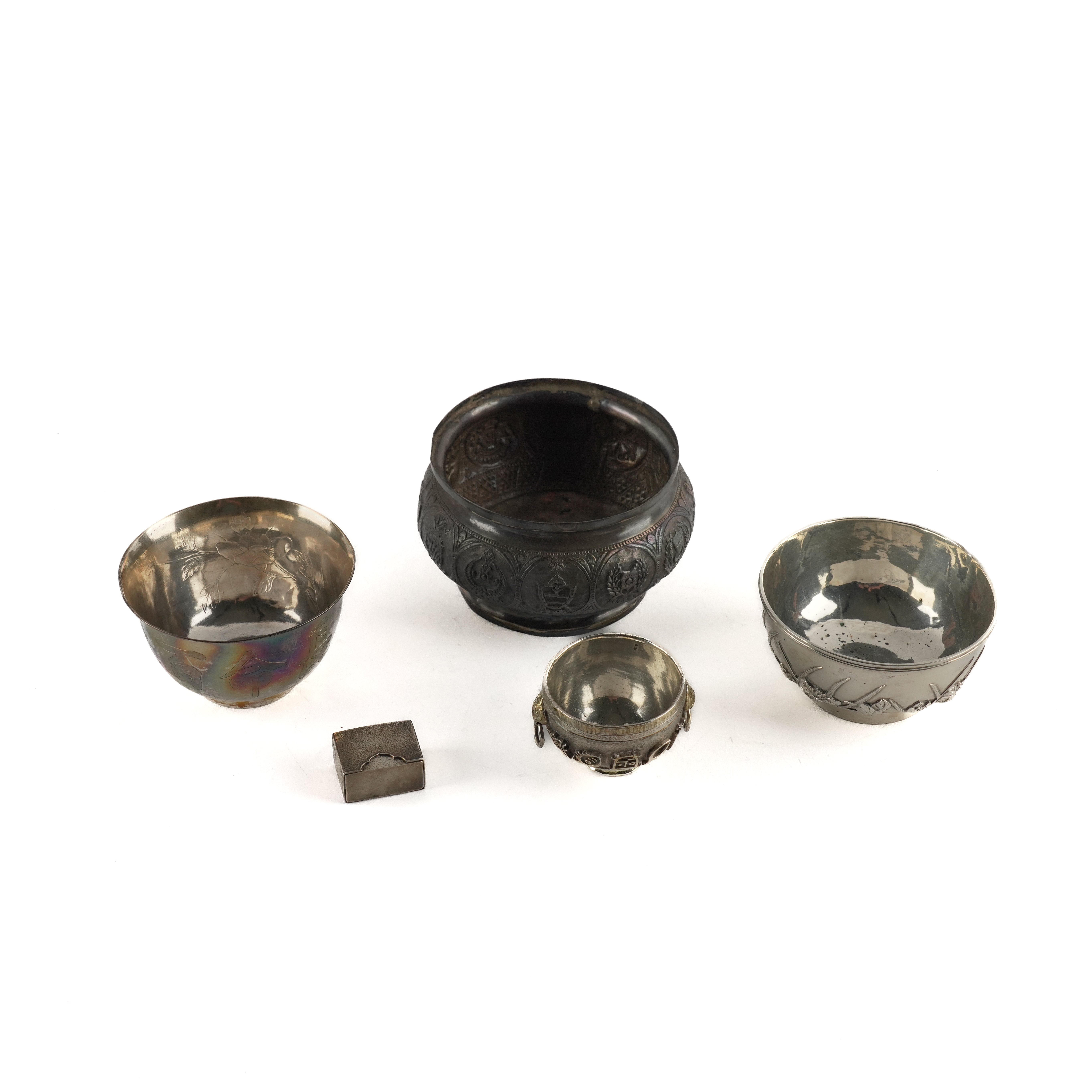 Comprising; a circular bowl, decorated with a floral spray and with characters, diameter 9.3cm, a circular bowl decorated with irises, detailed Taylor and Co, diameter 9.4cm, a smaller twin handled bowl, a larger bowl, named with places, diameter 10.7cm and a small box