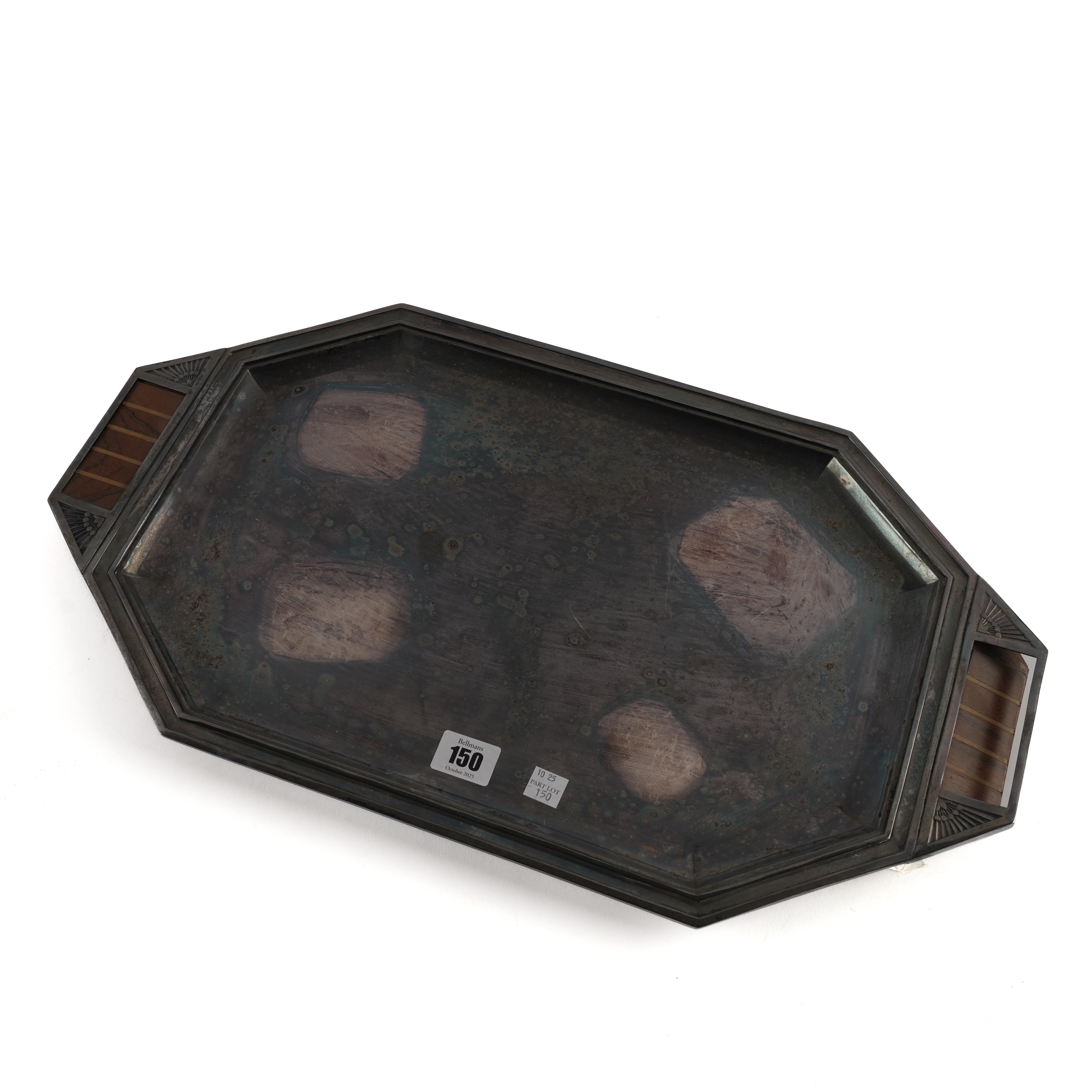 Comprising; a twin handled tray, a teapot, a hot water jug, a twin handled sugar bowl and cover and a milk jug, each of angular form with wooden handles, detailed Argit, probably French, length of tray 53.7cm