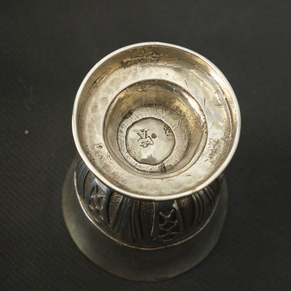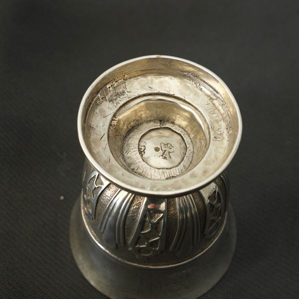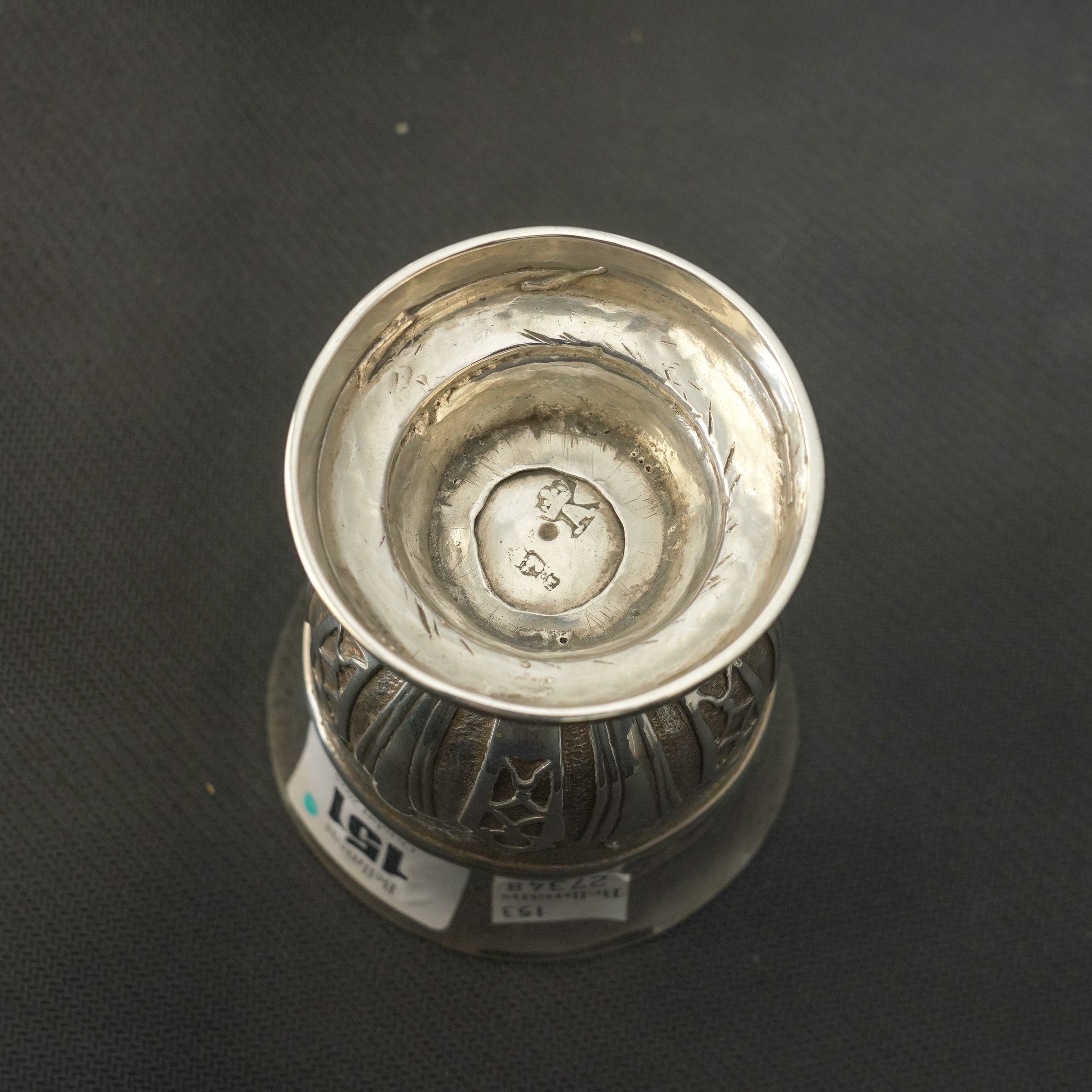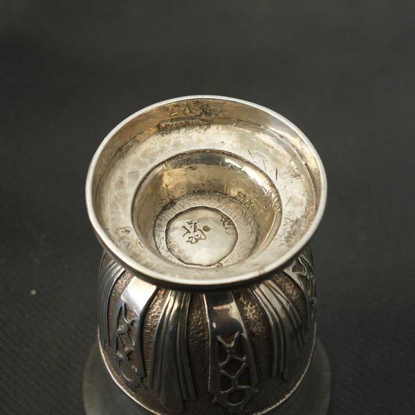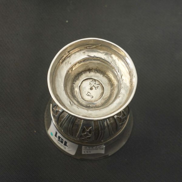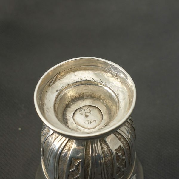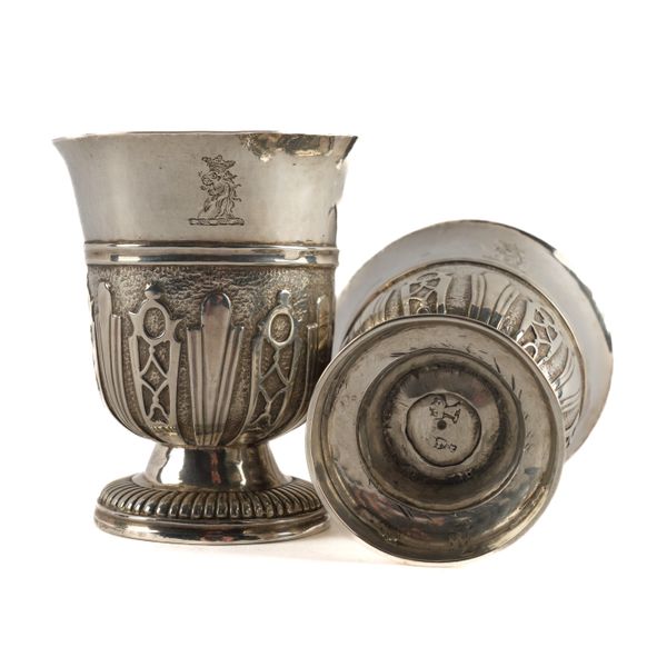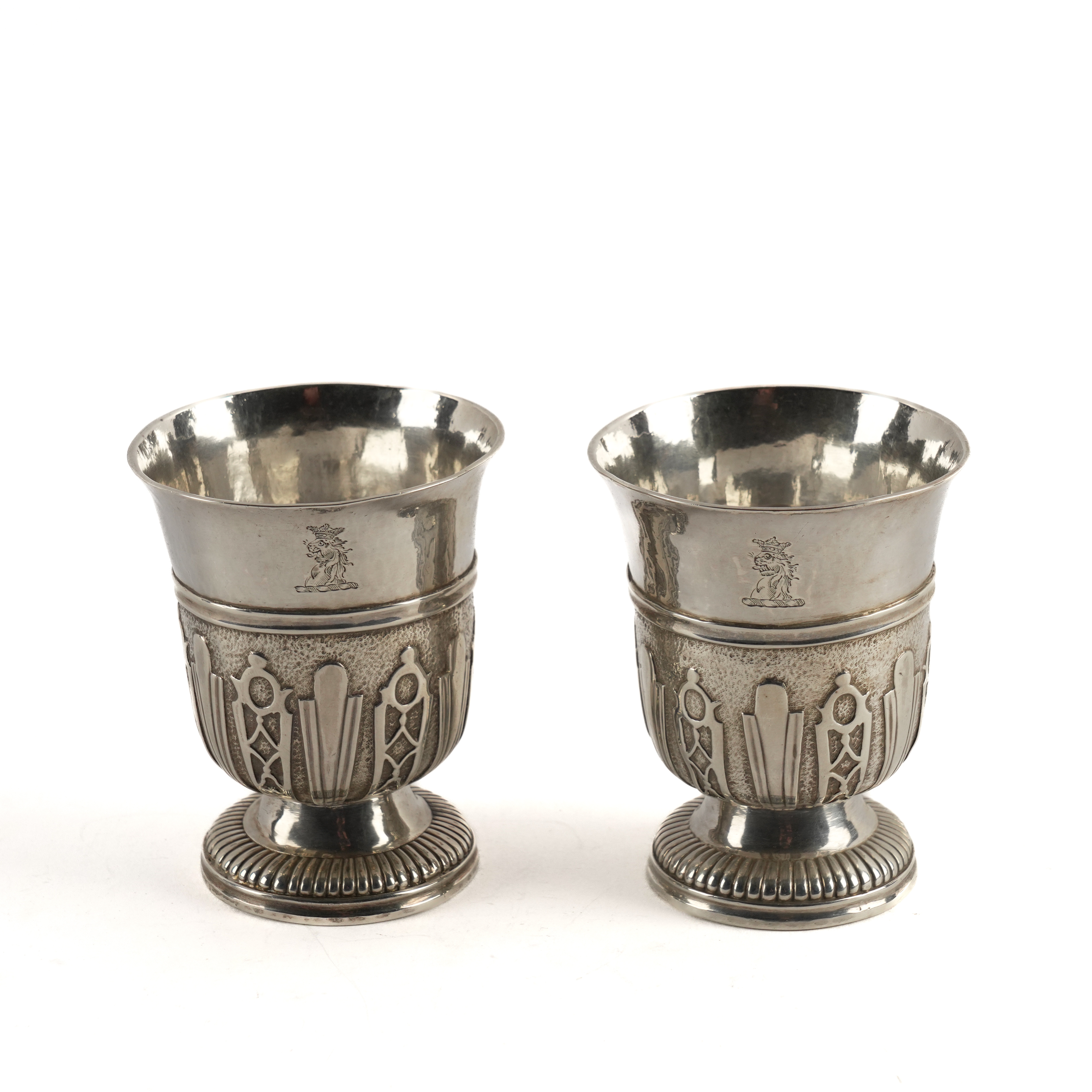 Each with strapwork form decoration, raised on a fluted circular foot, crest engraved, sample height 9.5cm, weight 300 grams