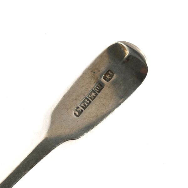 Comprising; a pair of George II Hanoverian pattern tablespoons, bottom marked, crest engraved London 1747, and a set of George IV six fiddle pattern teaspoons, monogram engraved, Exeter 1828, 239 grams