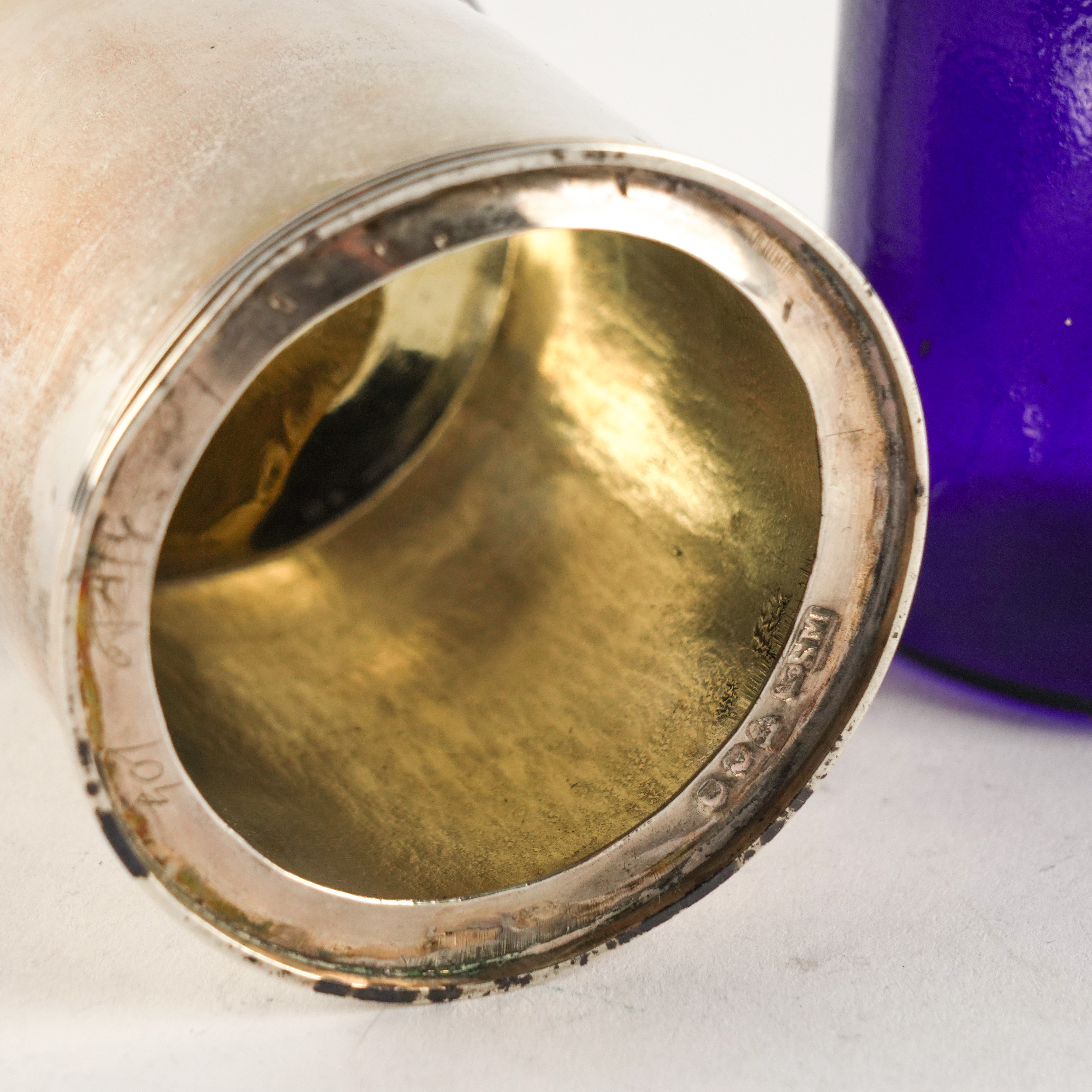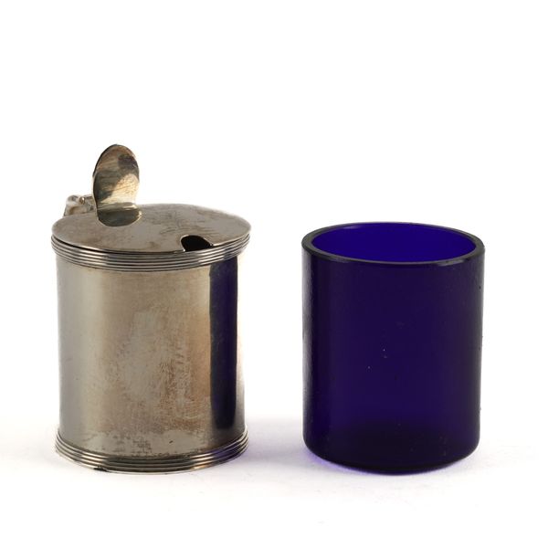 Of cylindrical form decorated with reeded bands and with a scrolled handle, crest engraved to the lid, London 1796, weight 139 grams, with a blue glass liner