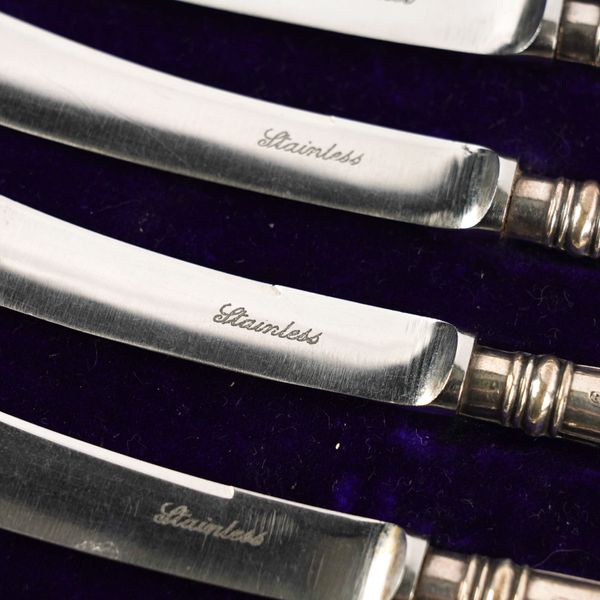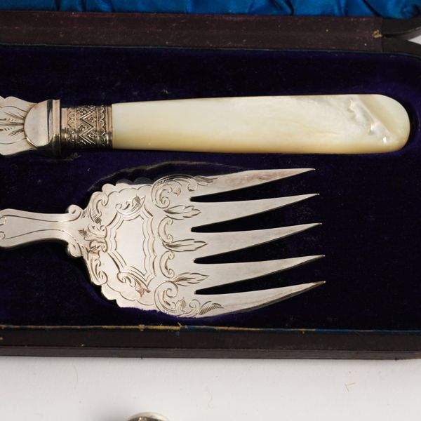 The butter knife Sheffield 1905, the pickle fork Sheffield 1927, combined weight 64 grams, also a set of six steel bladed tea knives with loaded silver handles, cased, a pair of grape scissors, cased, a pair of fish servers having mother of pearl handles, cased, another pair of fish servers, twelve pairs of fish knives and forks to match, two further forks and two soup spoons