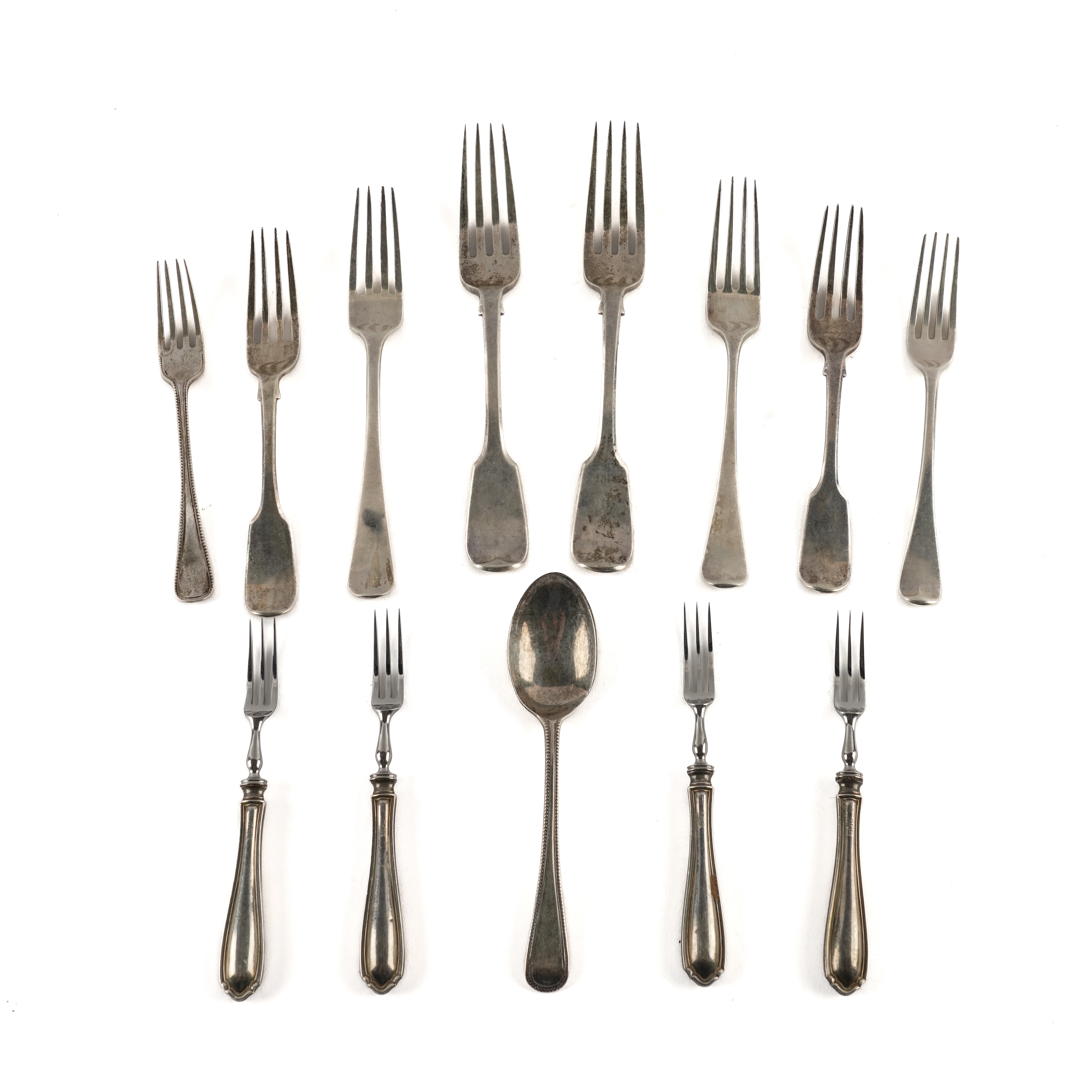 A GROUP OF MOSTLY SILVER TABLE FLATWARE (13)